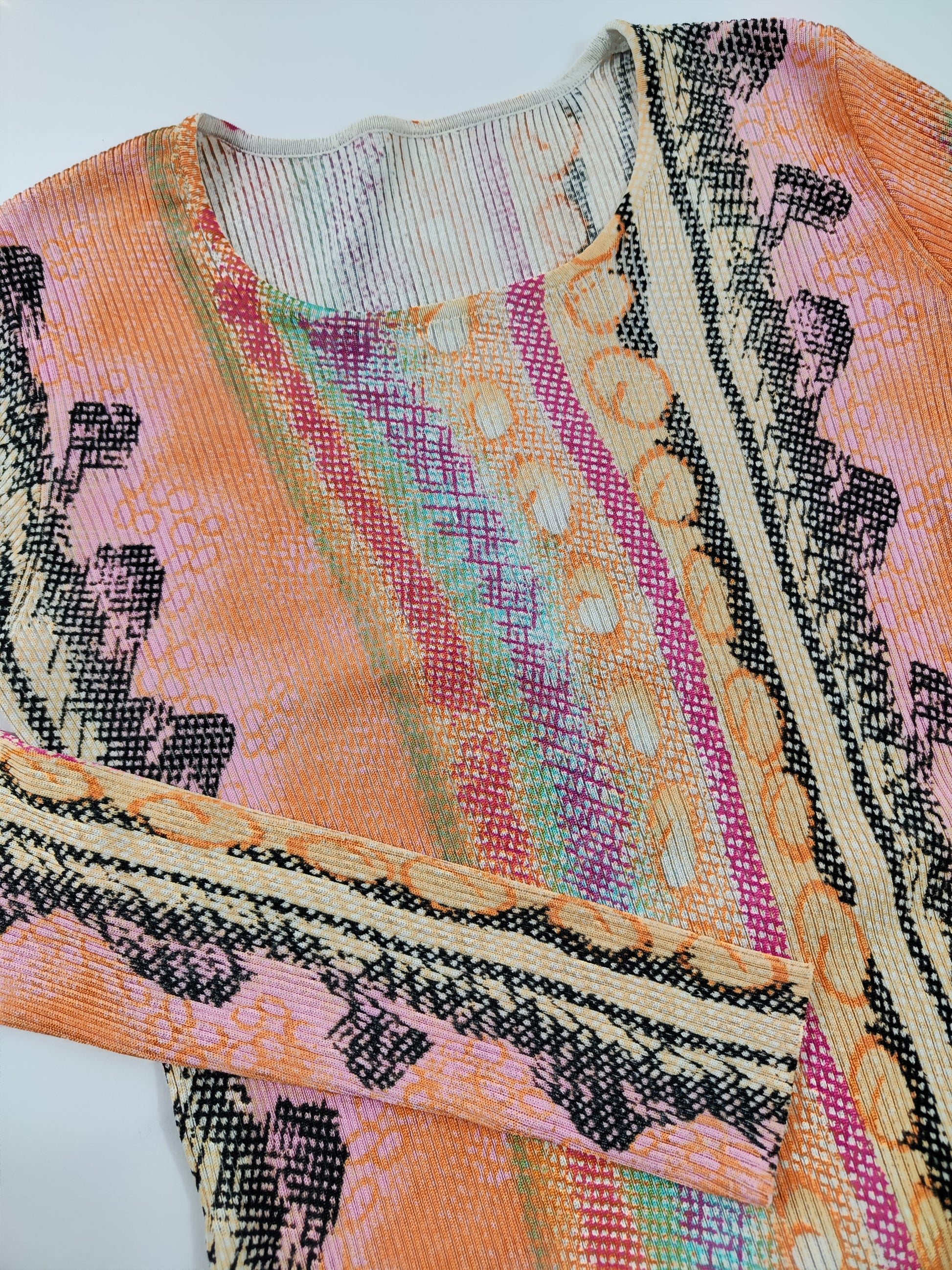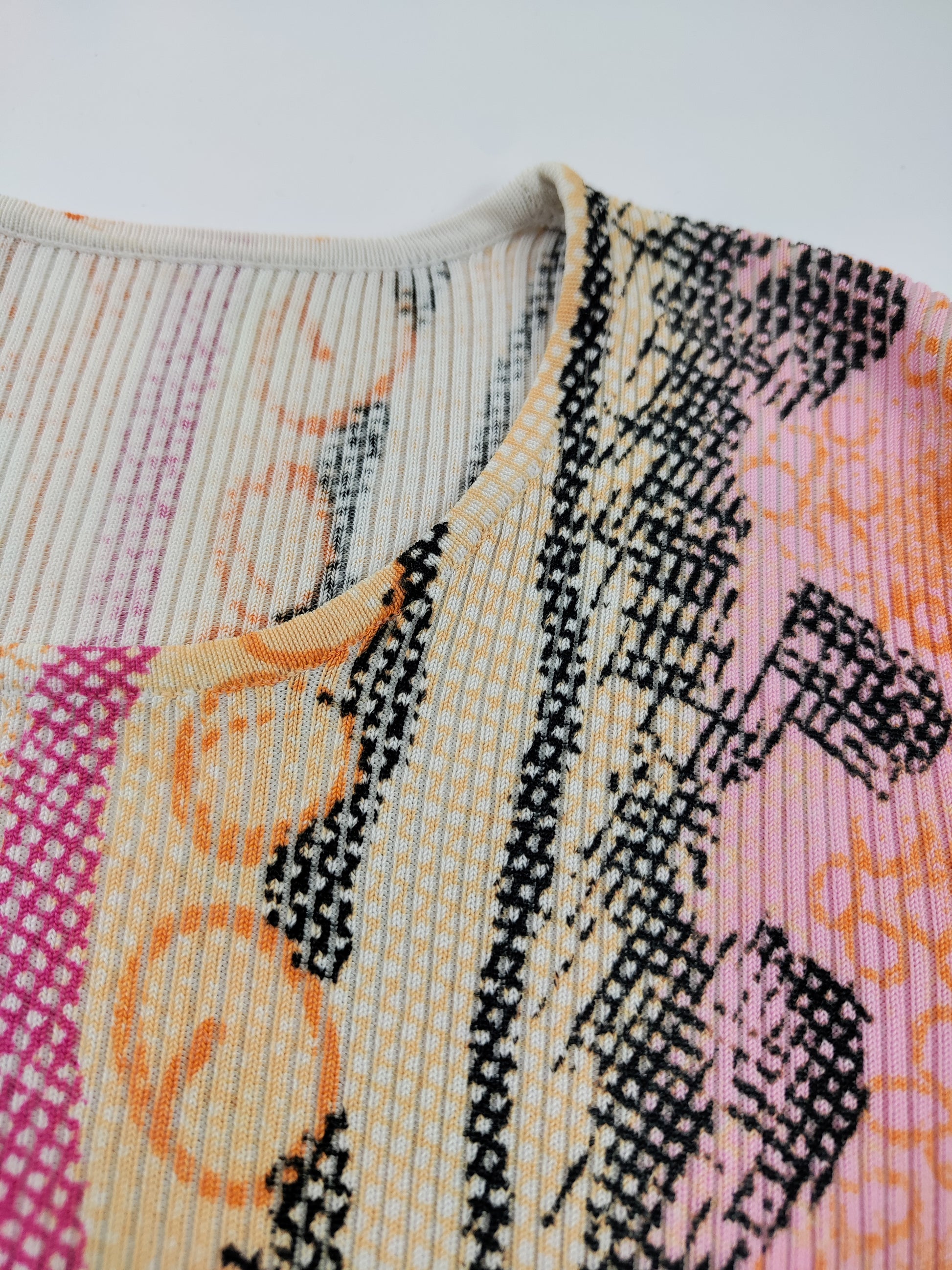 Top vintage a costine, manica lunga. Fantasia astratta sui toni pastello.