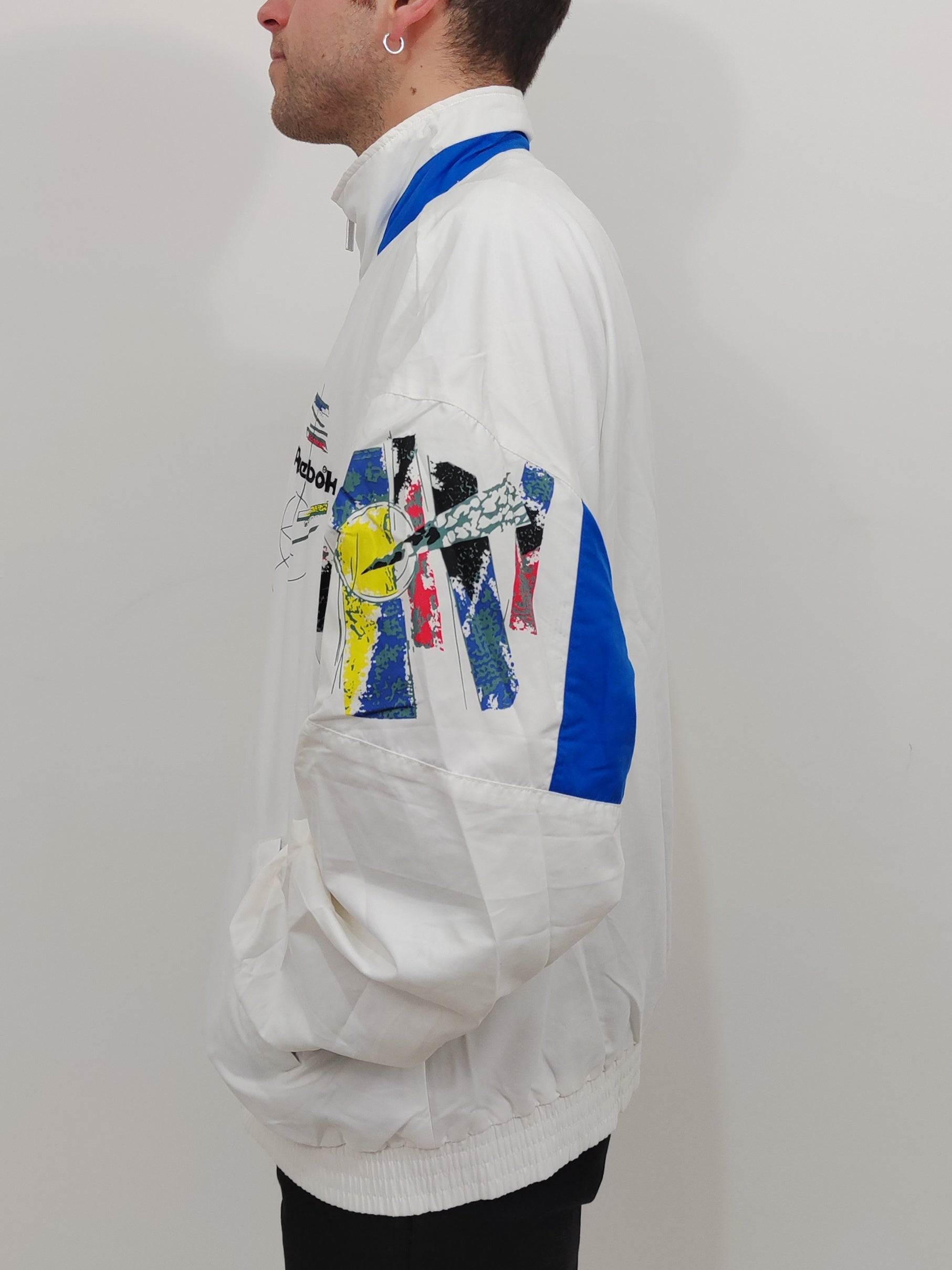 Tracktop vintage by Reebok, bianca con dettagli colorati. Adatta alle mezze stagioni, fodera in mesh all'interno.