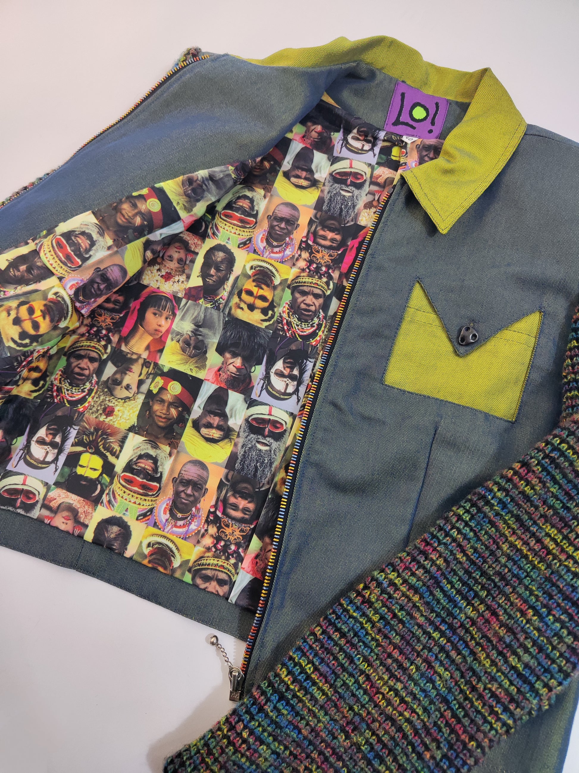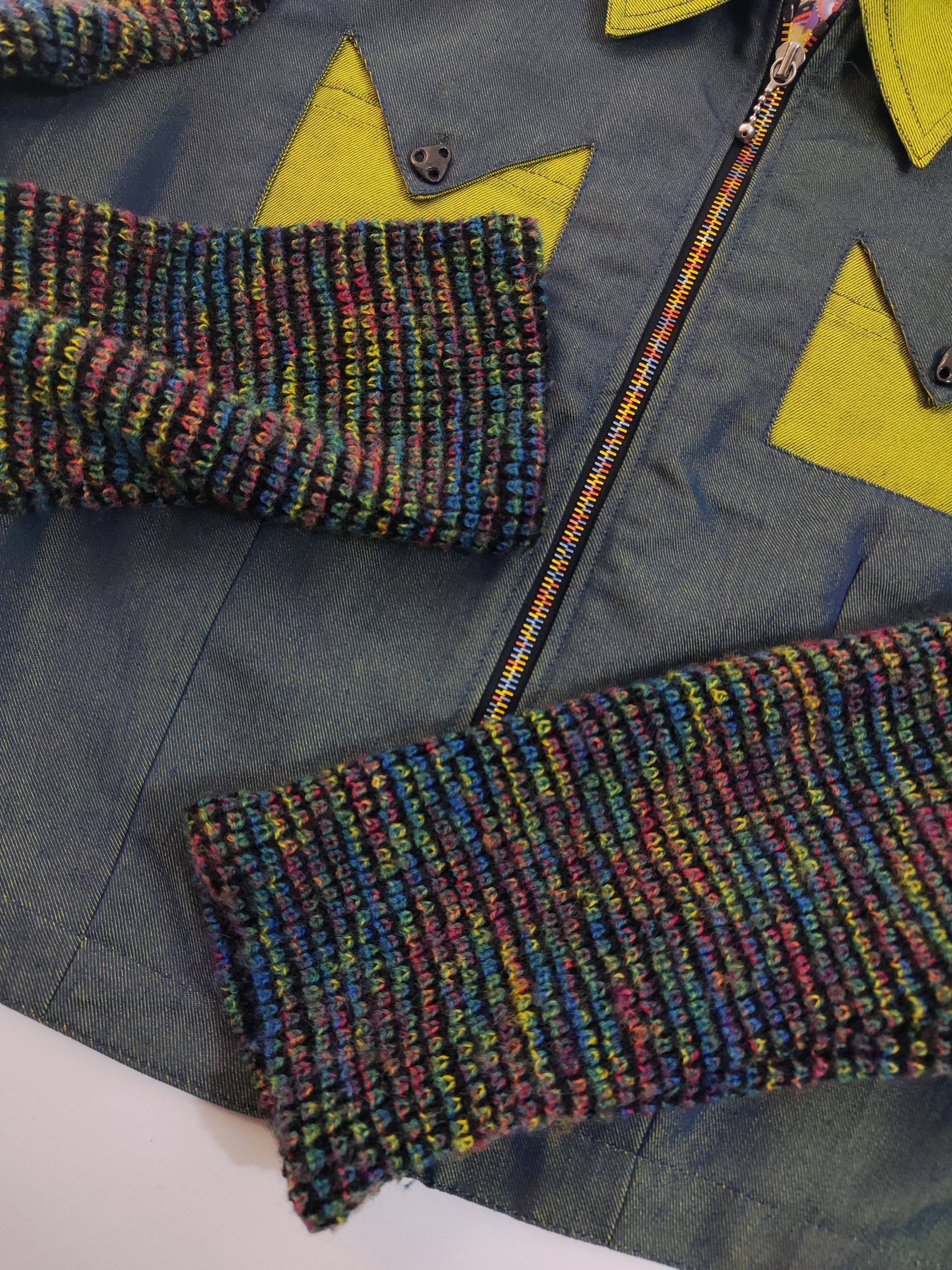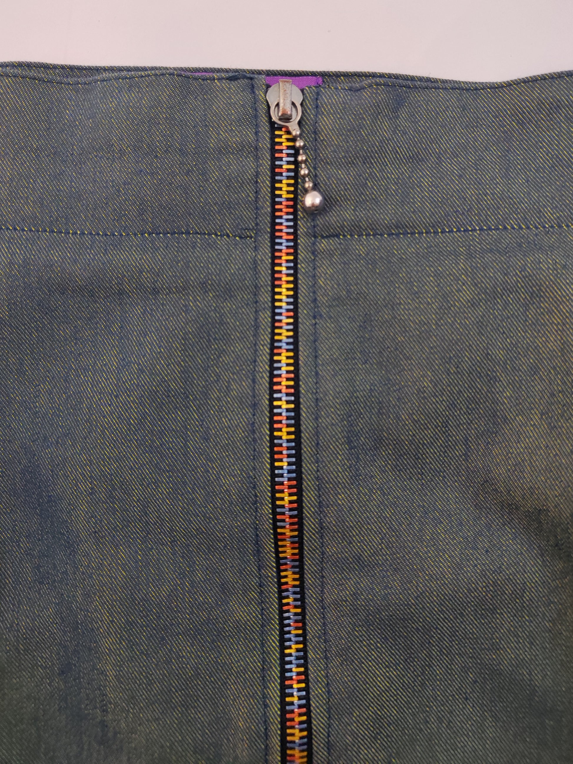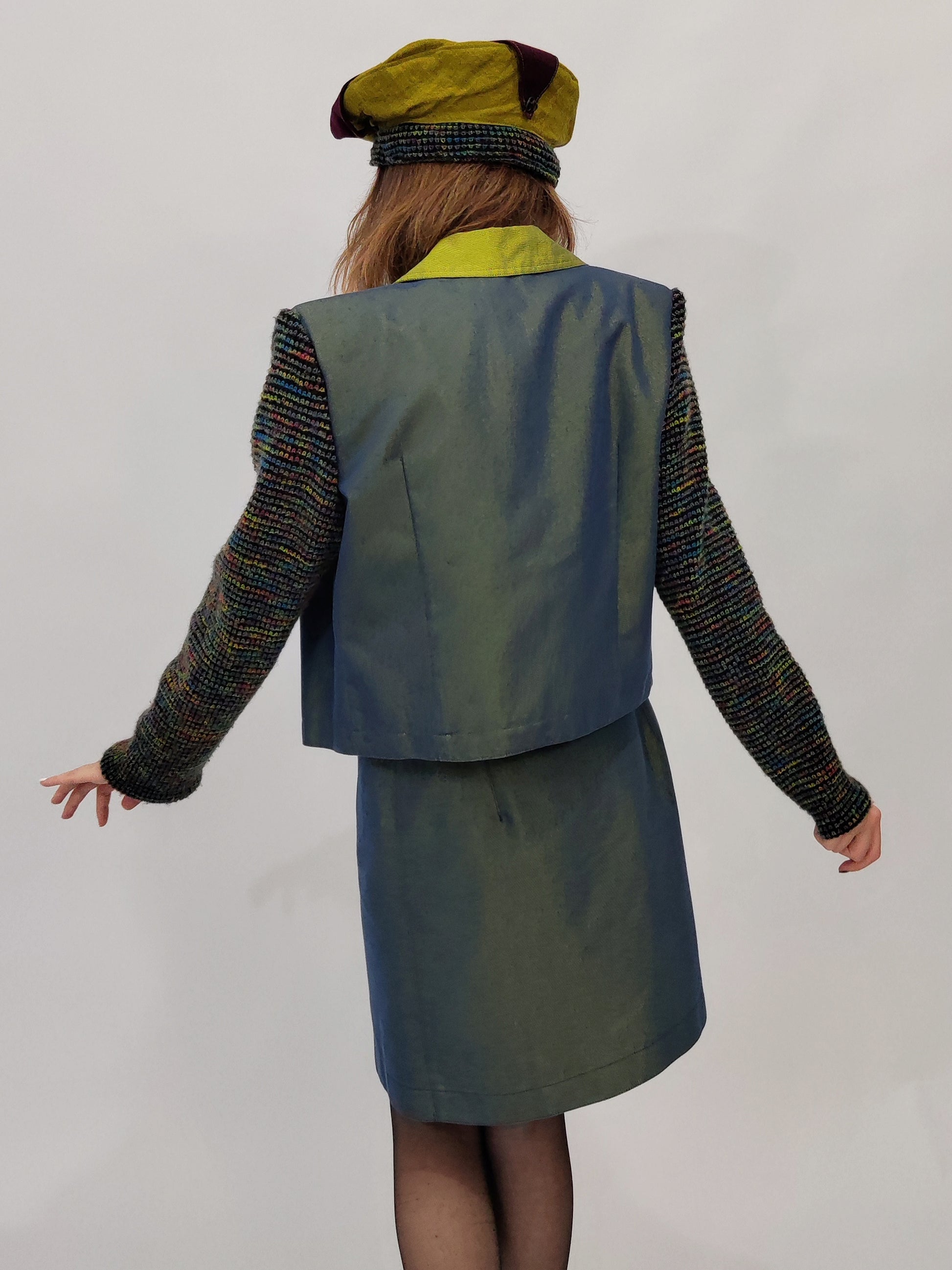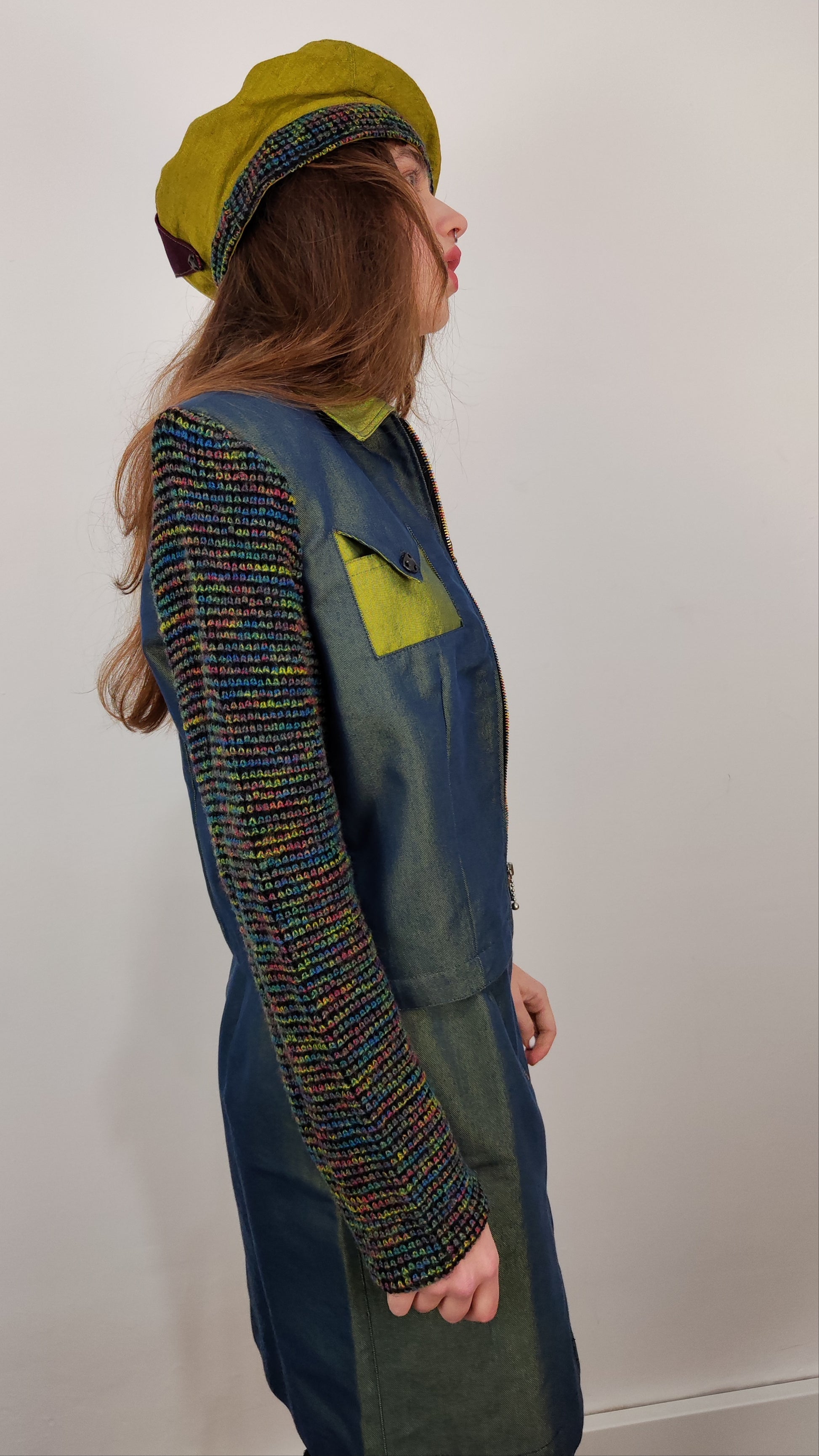 Incredibile set Made in France super originale, composto da 4 pezzi: minigonna, t-shirt, giacca e cappellino. Il tessuto principale è un denim cangiante, la giacca ha tasche geometriche e maniche in maglia di lana colorata, stesso tessuto della t-shirt boxy a manica corta sottostante, simpaticissimo il dettaglio della zip multicolor. Gonna dal taglio dritto, anch'essa in tessuto cangiante, a vita alta con lunghezza al di sopra del ginocchio, zip centrale sulla parte anteriore. Il tutto è completato da un cappellino circolare che riprende i toni del giallo e viola e della maglia colorata. Bellissima la fodera interna stampata con ritratti di volti con caratteristiche tribali.