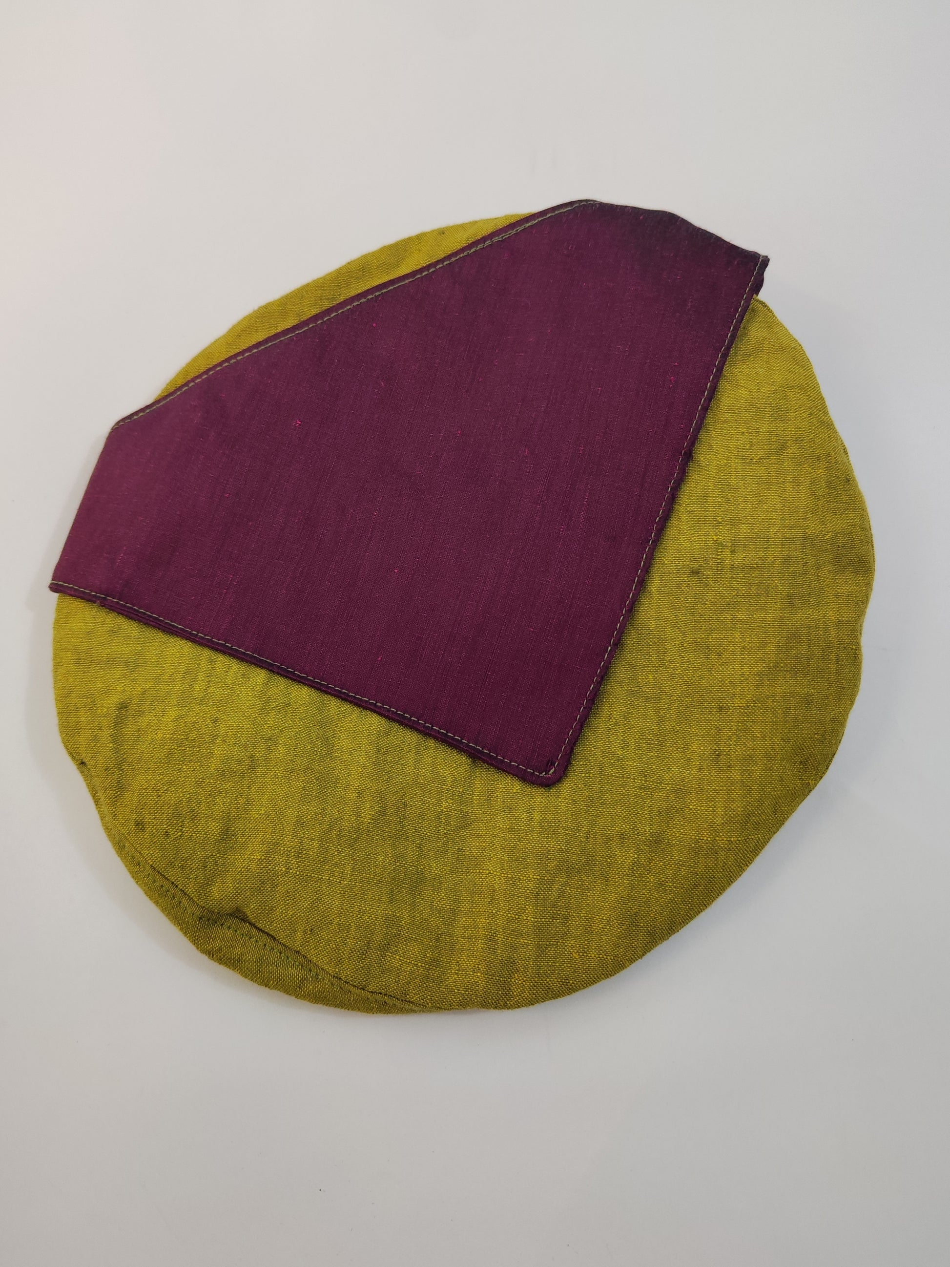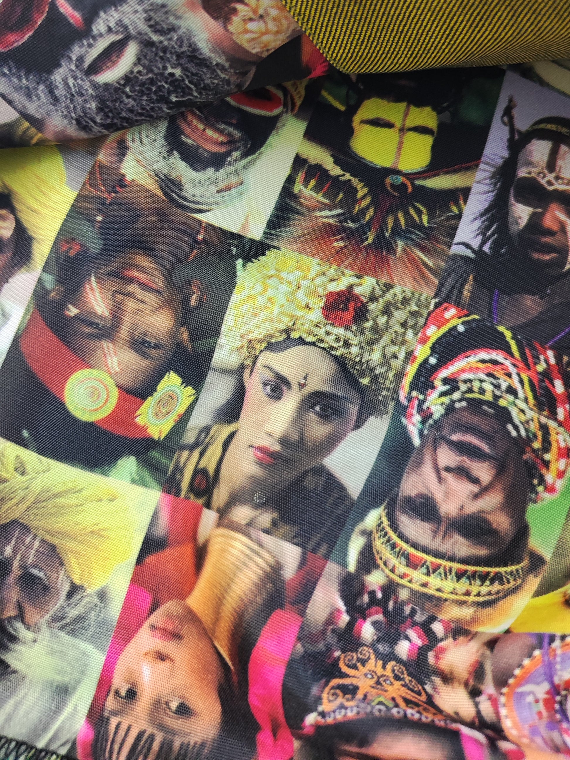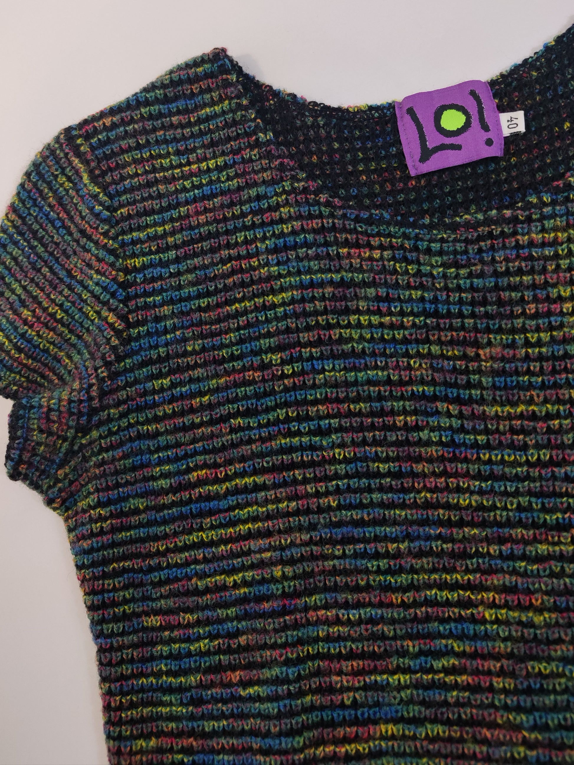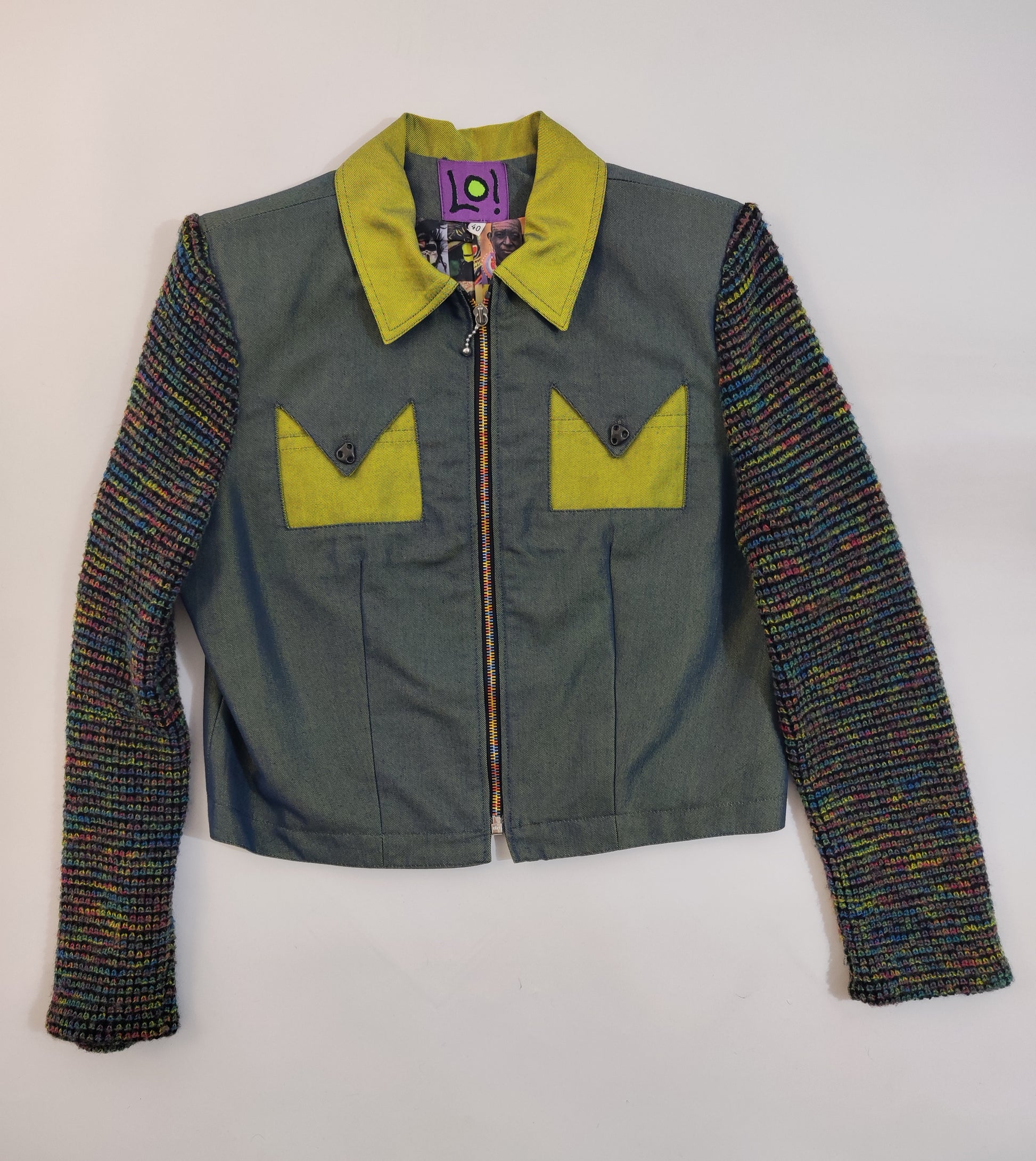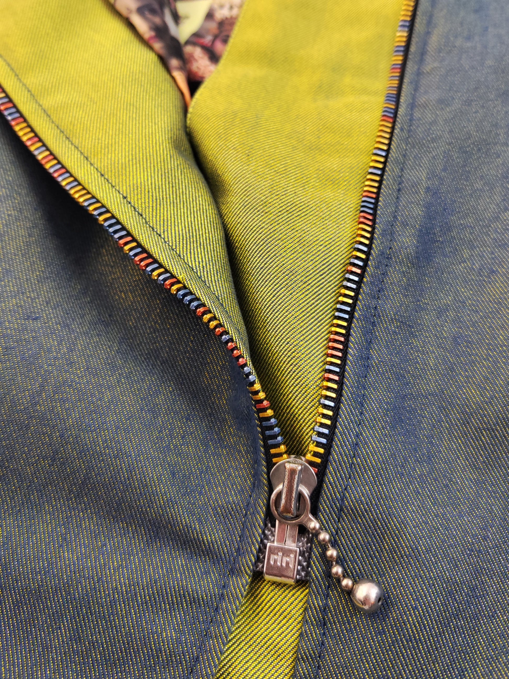 Incredibile set Made in France super originale, composto da 4 pezzi: minigonna, t-shirt, giacca e cappellino. Il tessuto principale è un denim cangiante, la giacca ha tasche geometriche e maniche in maglia di lana colorata, stesso tessuto della t-shirt boxy a manica corta sottostante, simpaticissimo il dettaglio della zip multicolor. Gonna dal taglio dritto, anch'essa in tessuto cangiante, a vita alta con lunghezza al di sopra del ginocchio, zip centrale sulla parte anteriore. Il tutto è completato da un cappellino circolare che riprende i toni del giallo e viola e della maglia colorata. Bellissima la fodera interna stampata con ritratti di volti con caratteristiche tribali.