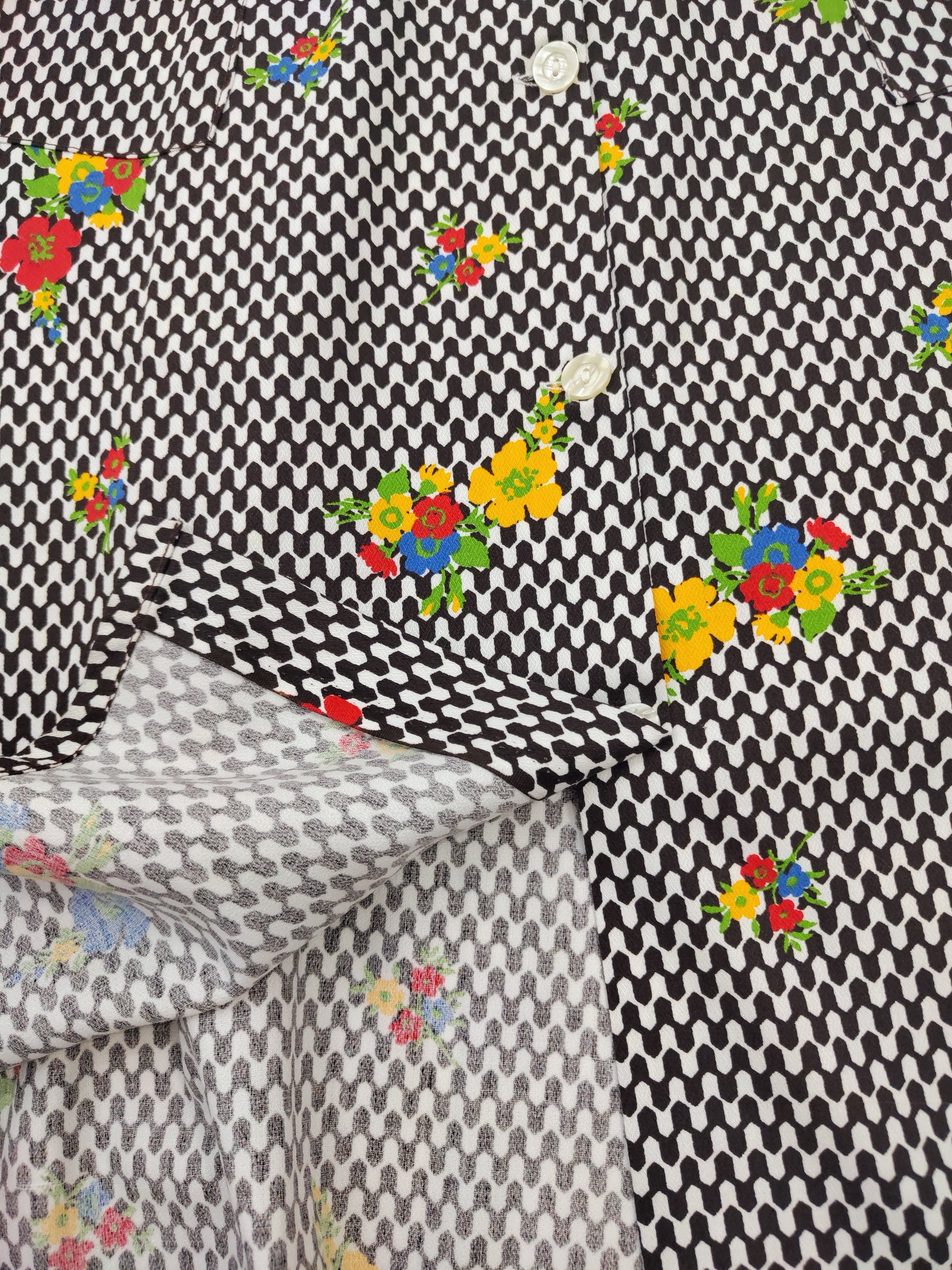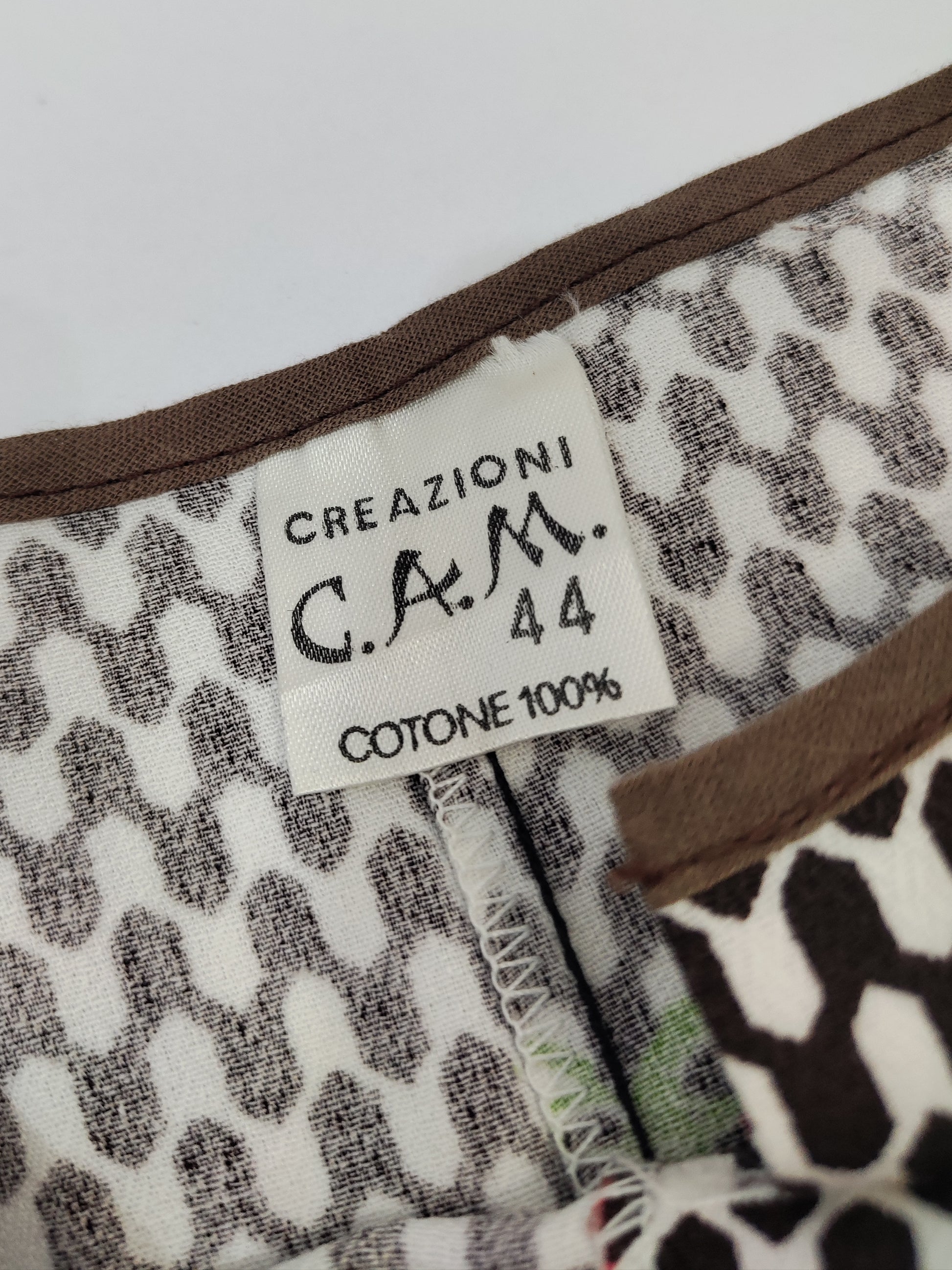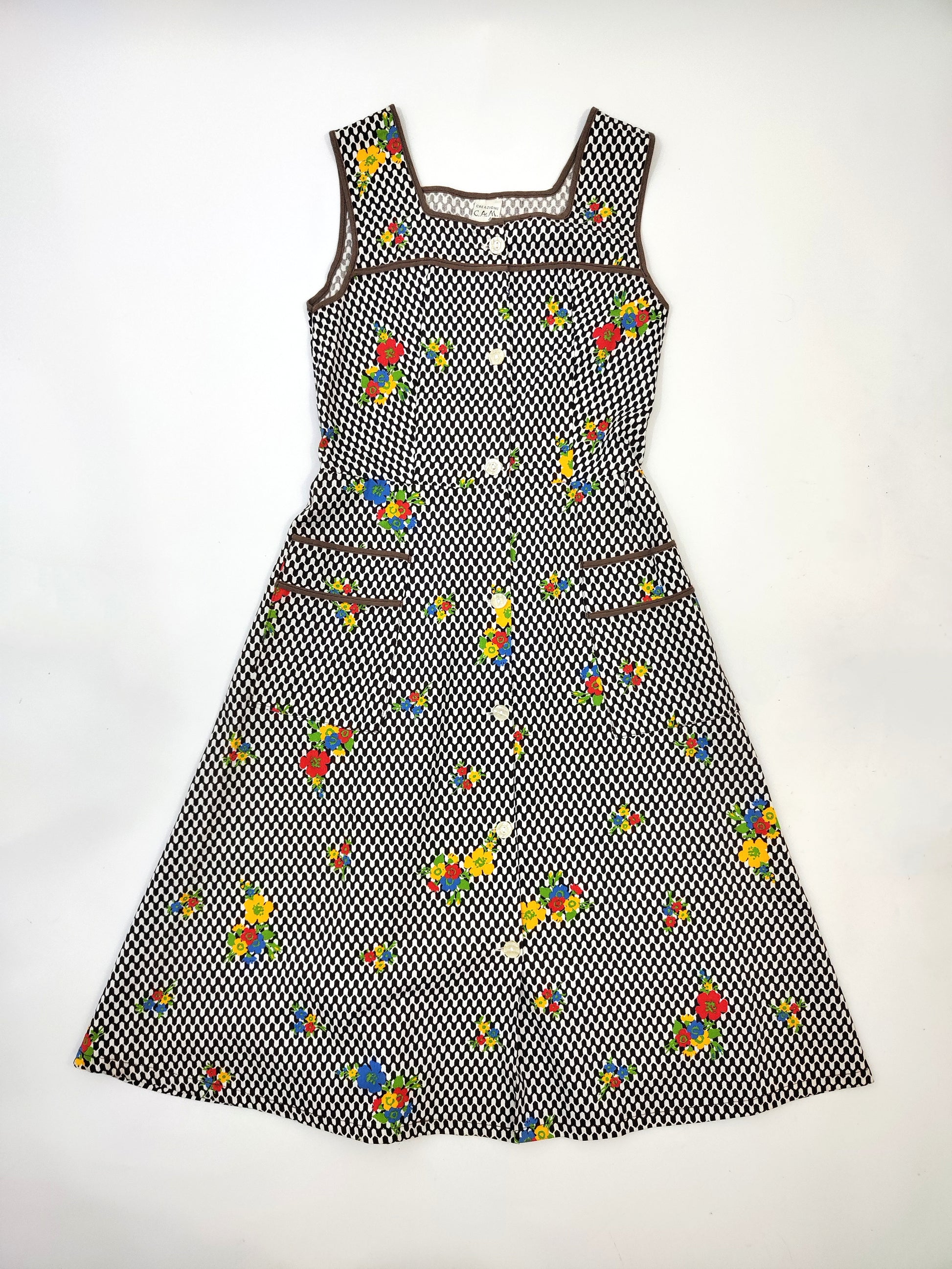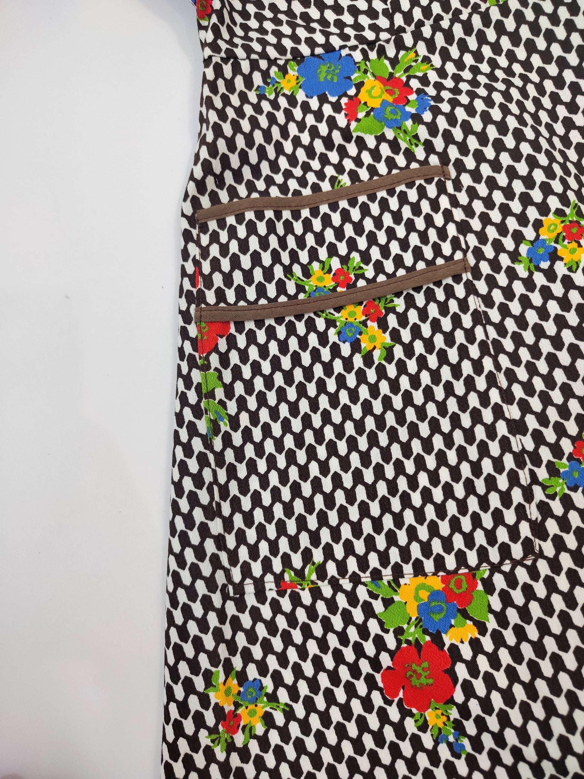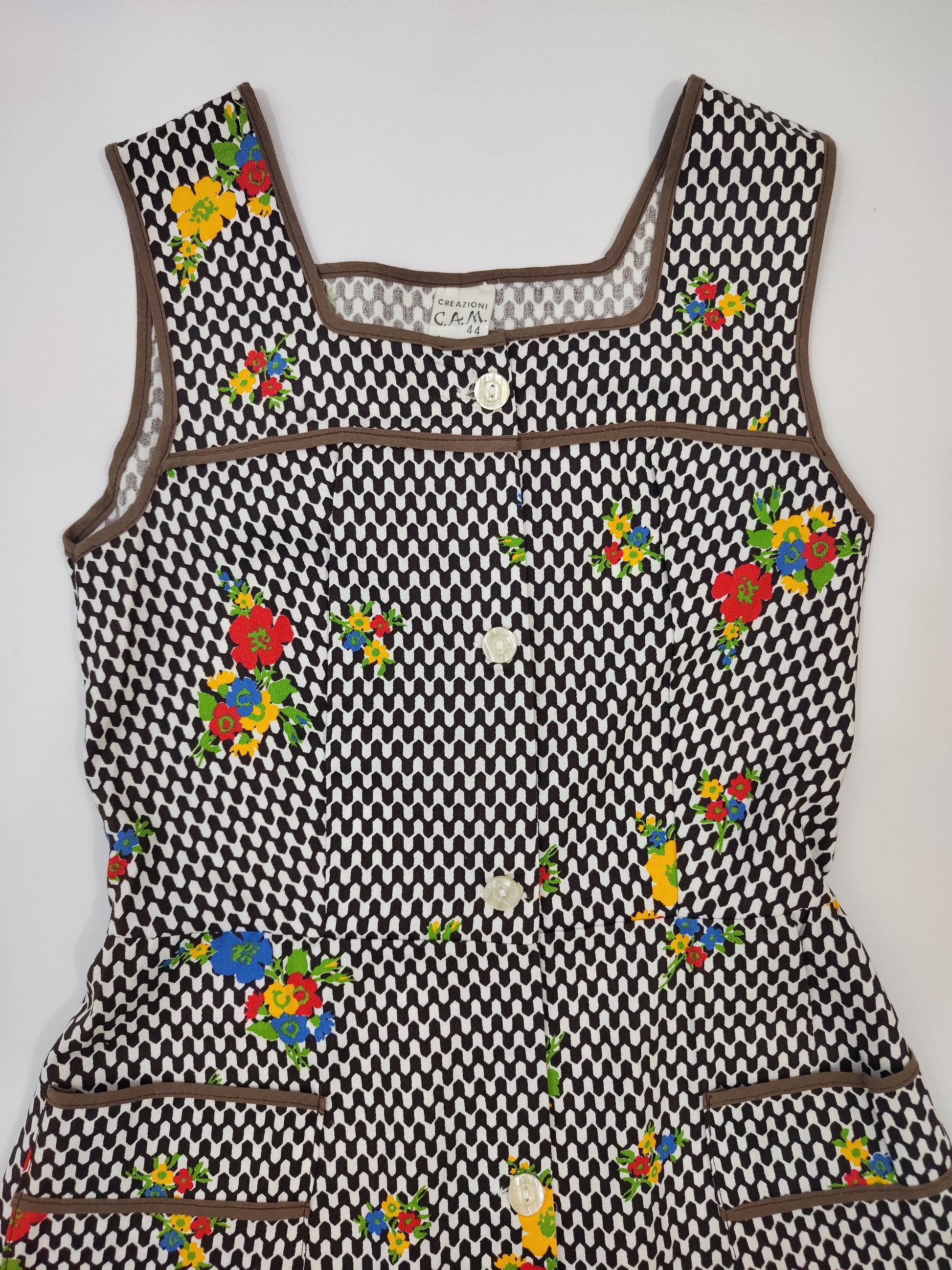 Abito grembiule vintage anni '70, sartoriale, Creazioni C.A.M. In Cotone, ha una silhouette comoda e allo stesso tempo femminile, taglio a trapezio leggermente sciancrato, segue la linea del busto per poi aprirsi verso l'orlo. Stampa optical bianca e marrone scuro con fiori colorati sparsi; la fantasia è il vero punto di forza di questo abito, ne alleggerisce l'aria "utilitaria" rendendolo perfettamente indossabile come abito da giorno e pezzo vintage di carattere. Chiusura frontale con bottoni, profili marroni sullo scollo e sulle tasche applicate frontalmente.