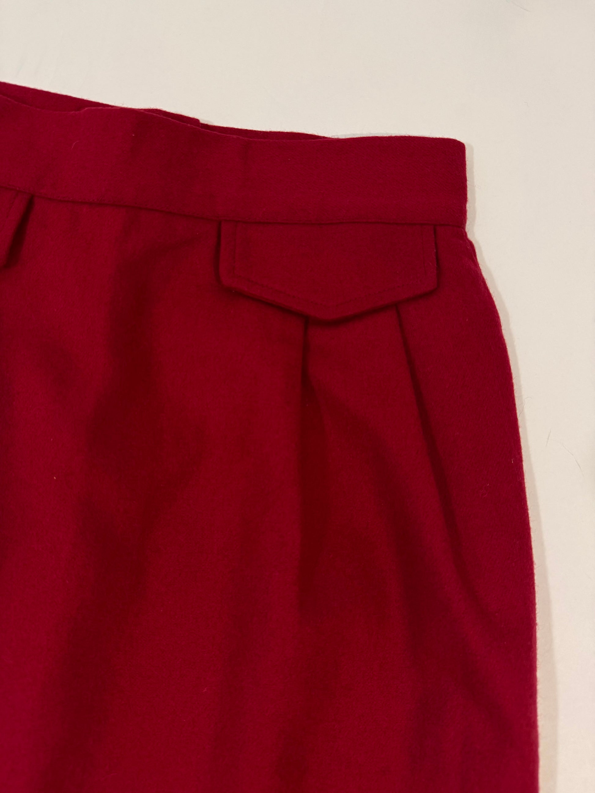 Gonna vintage a matita in misto lana, tessuto compatto con mano liscia e ottima vestibilità. Colore rosso, vita alta ben definita e caratterizzata da due patte decorative, lunghezza al ginocchio. Chiusura sul retro con zip e bottone.