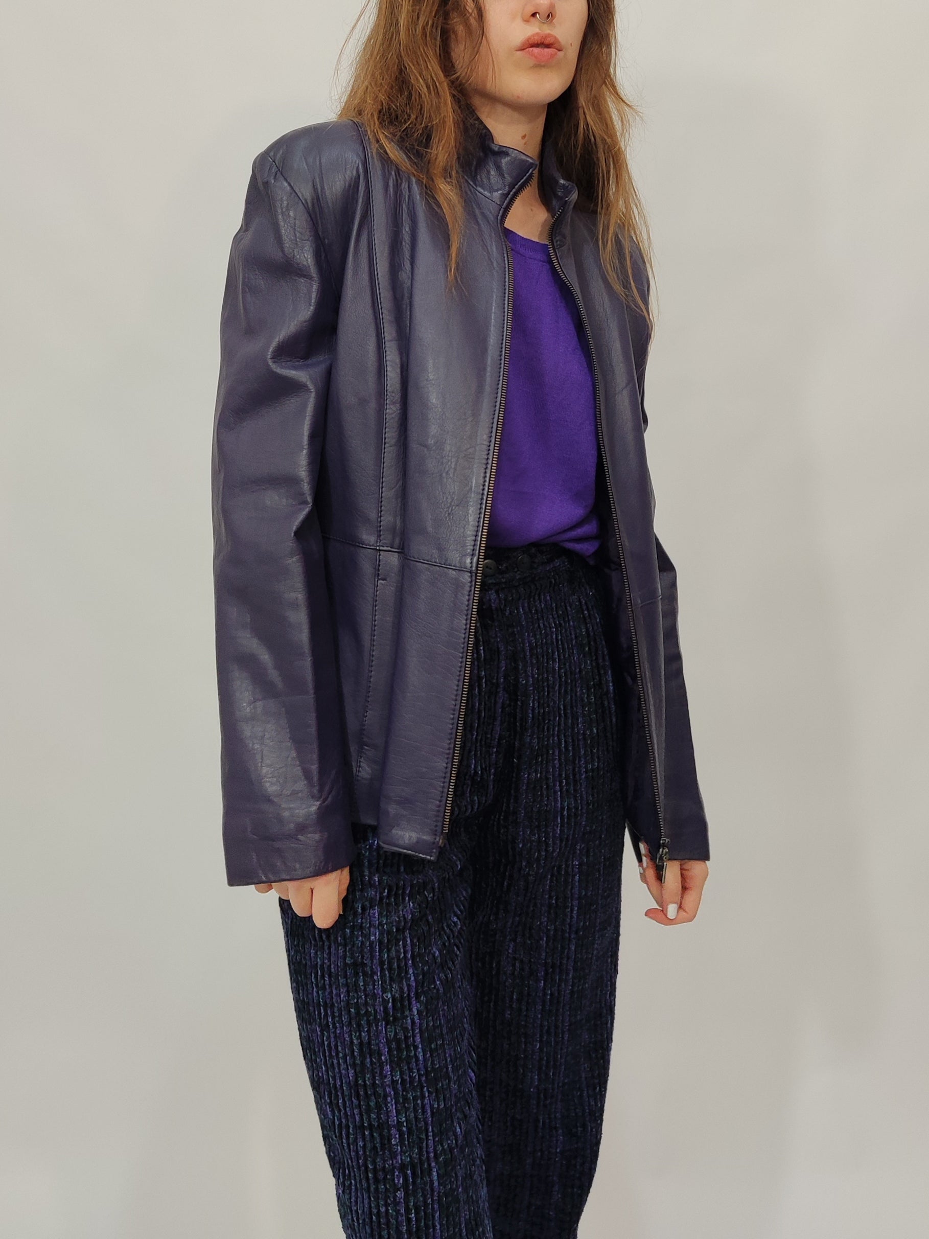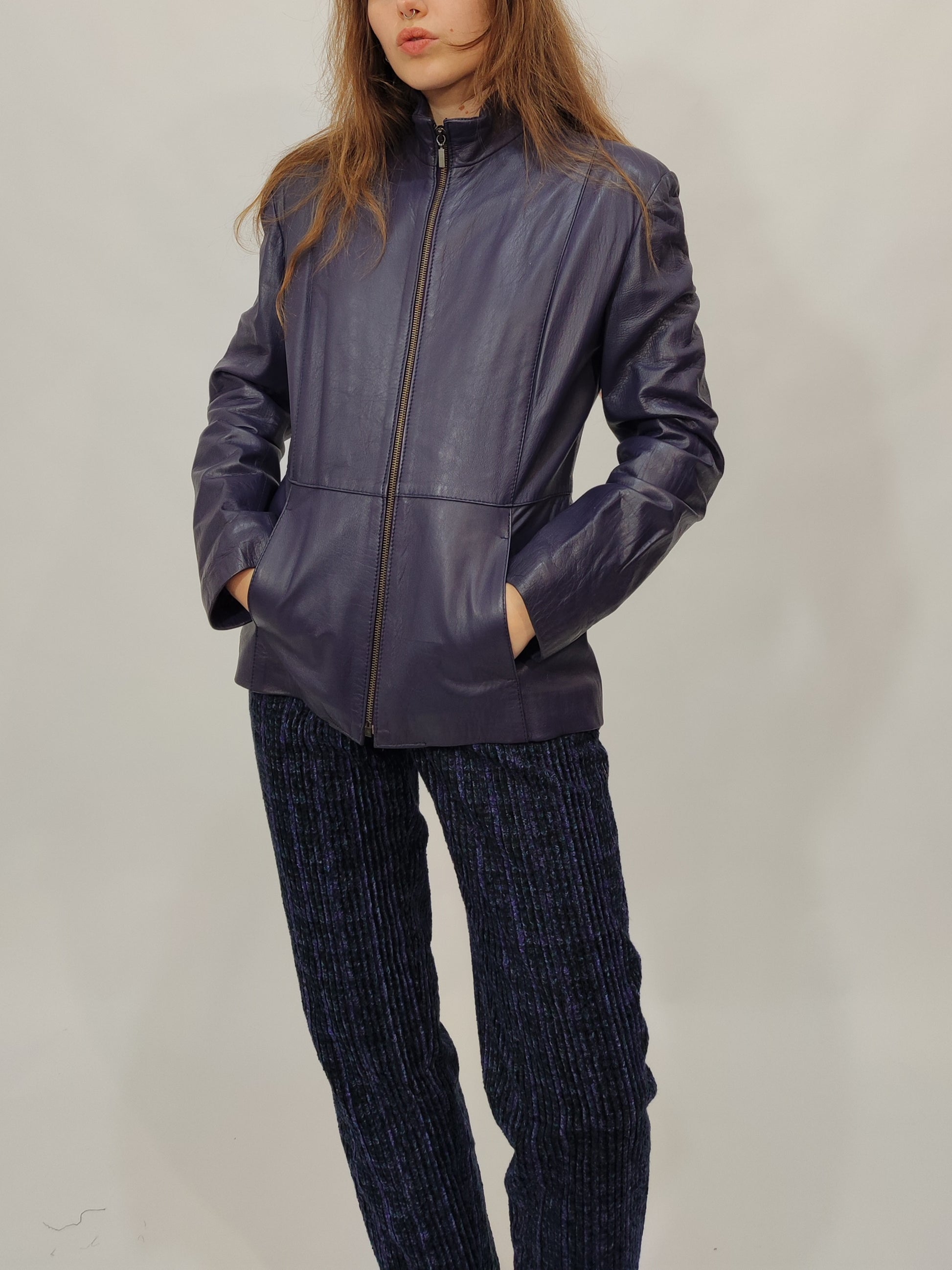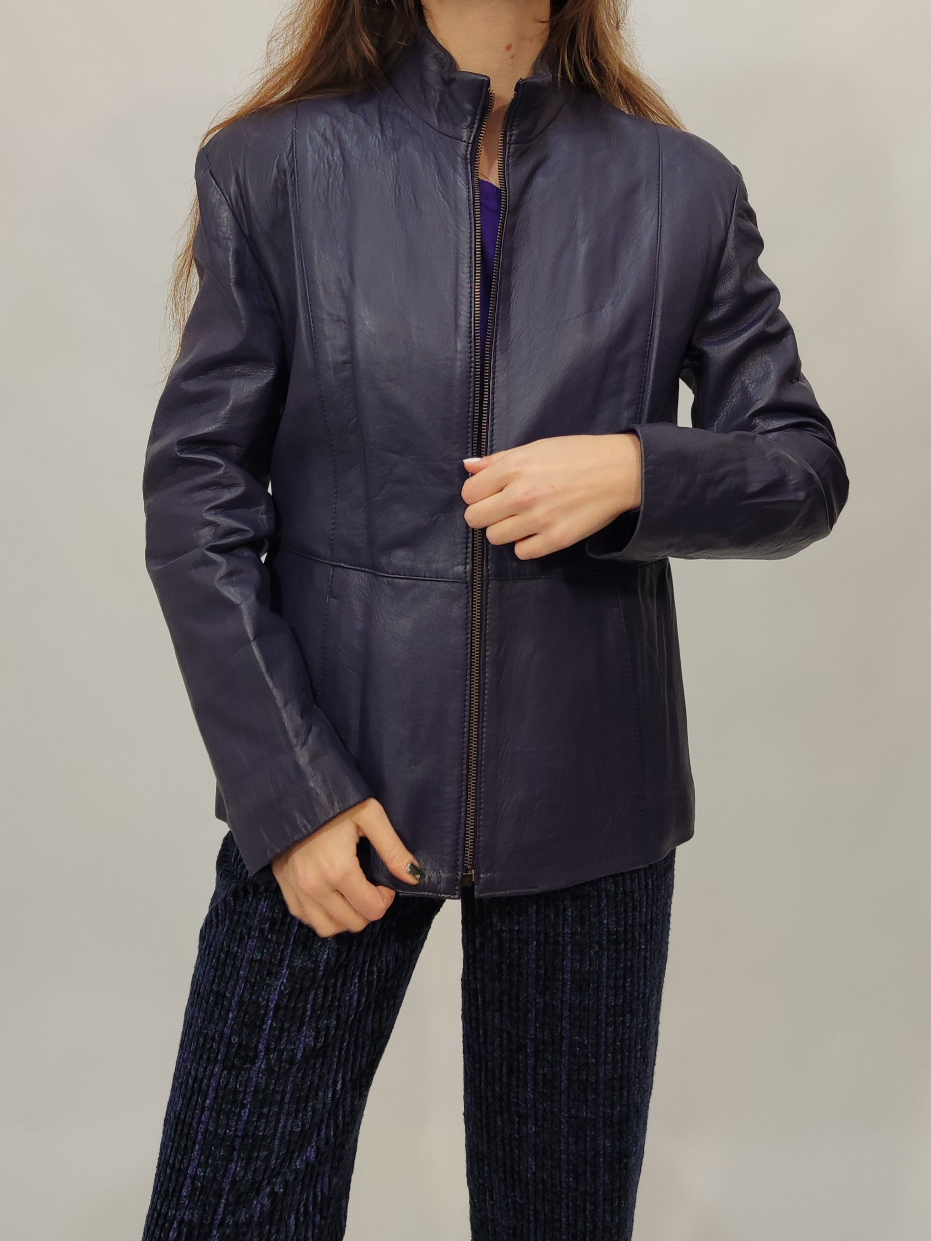 Giacca vintage anni '90 in vera pelle color melanzana. Vestibilità slim, chiusura frontale con zip. Presenta due piccole tasche e una leggera imbottitura all'interno, perciò è adatta anche ai primi freddi.