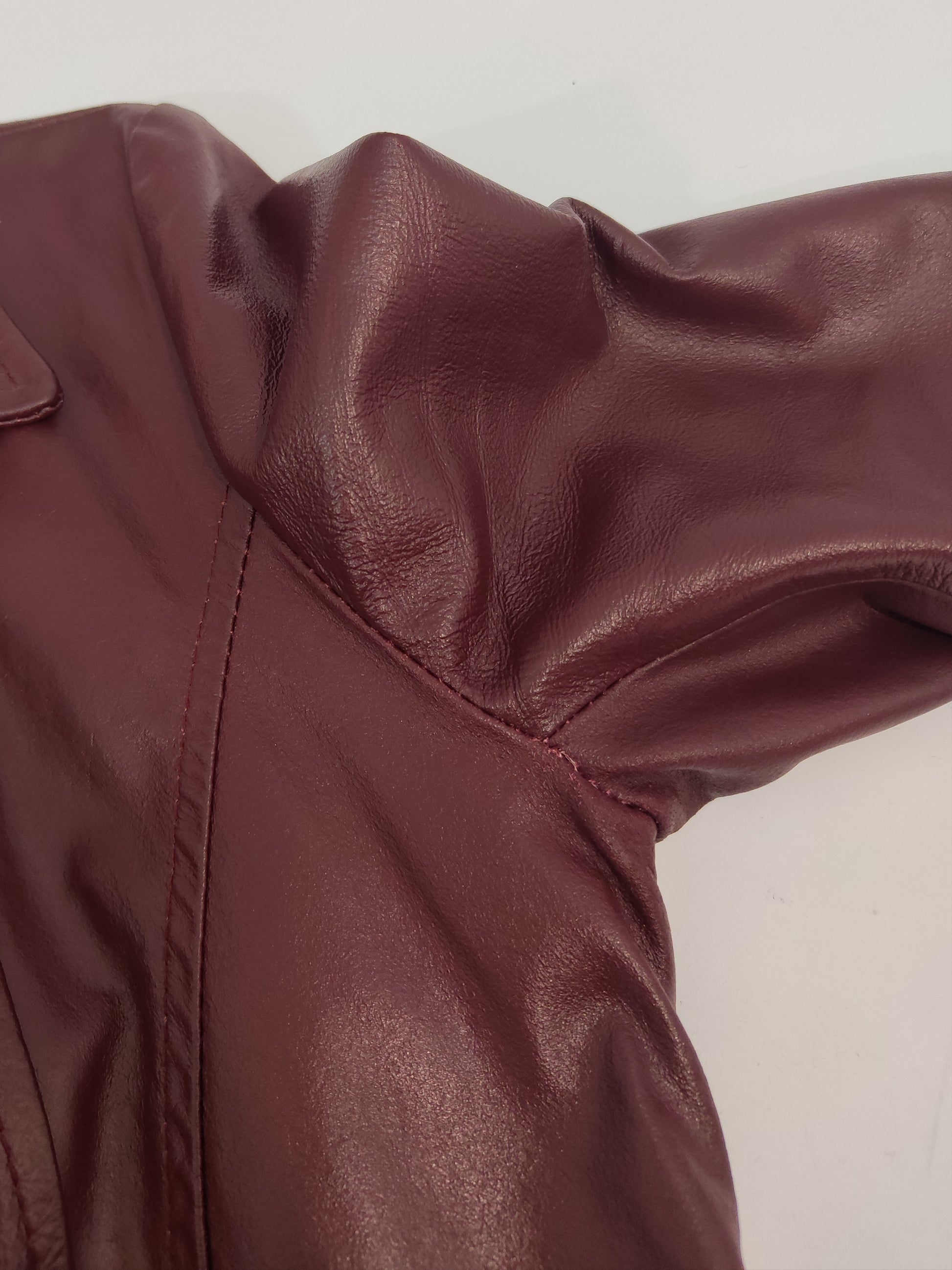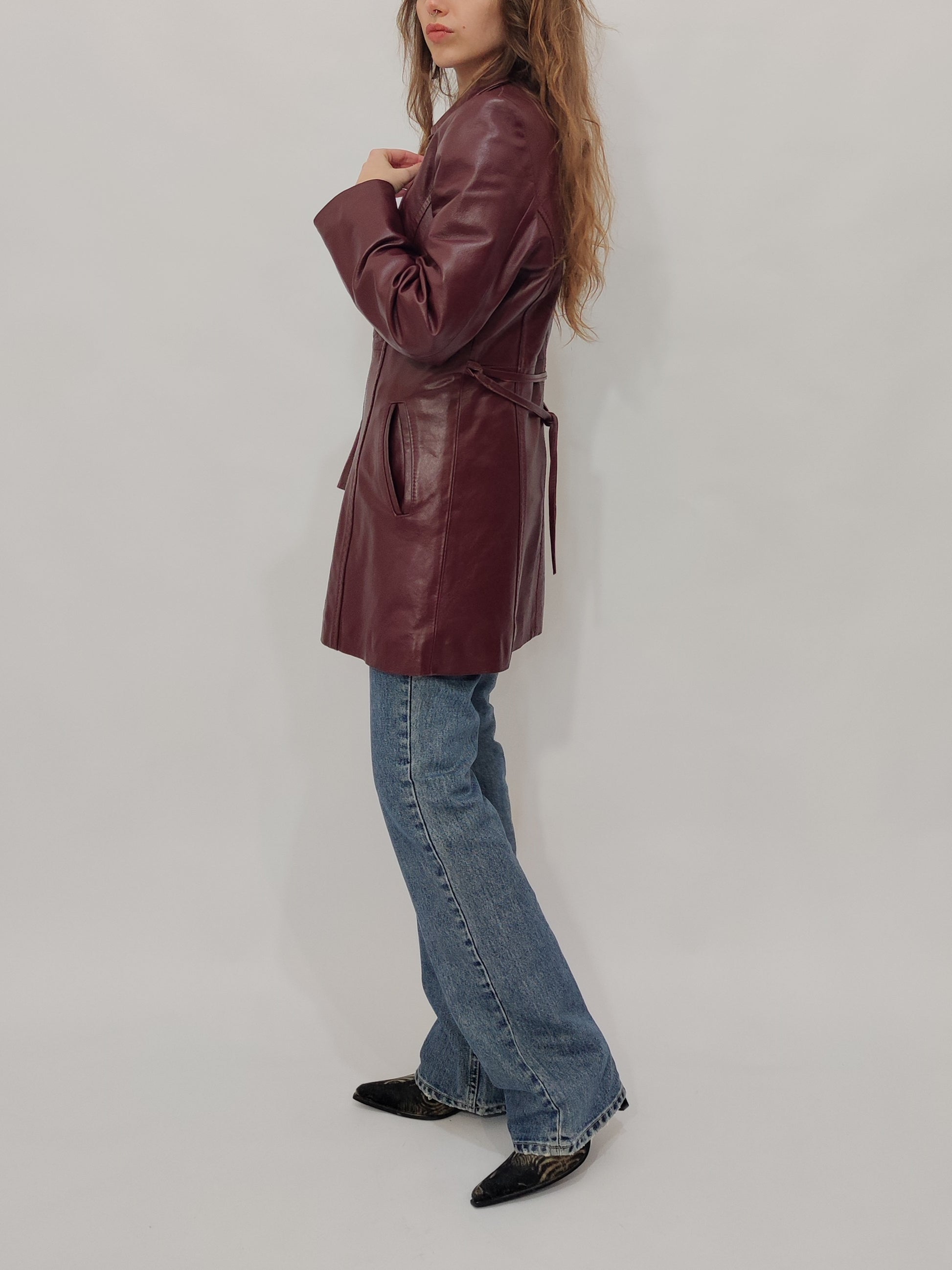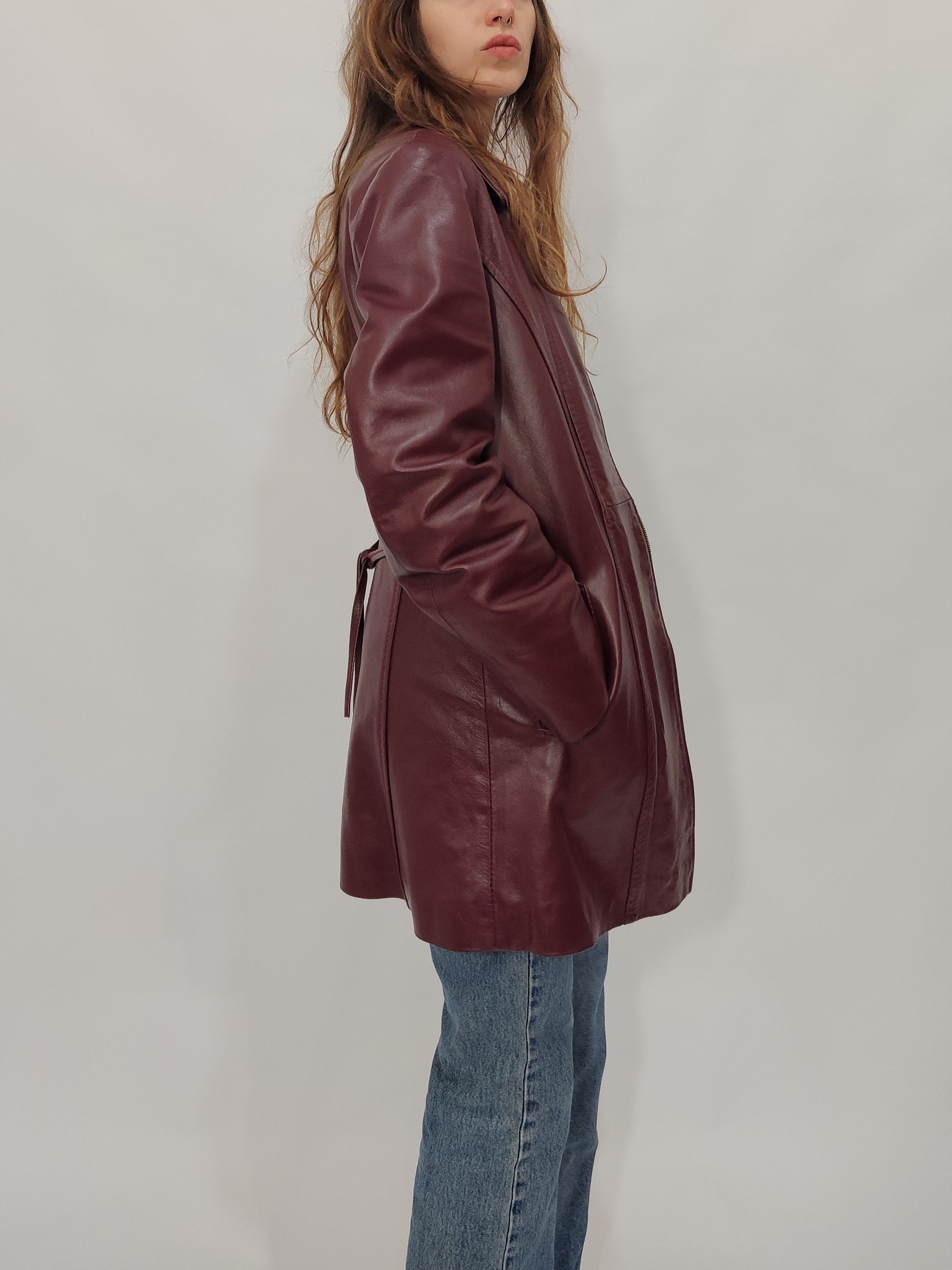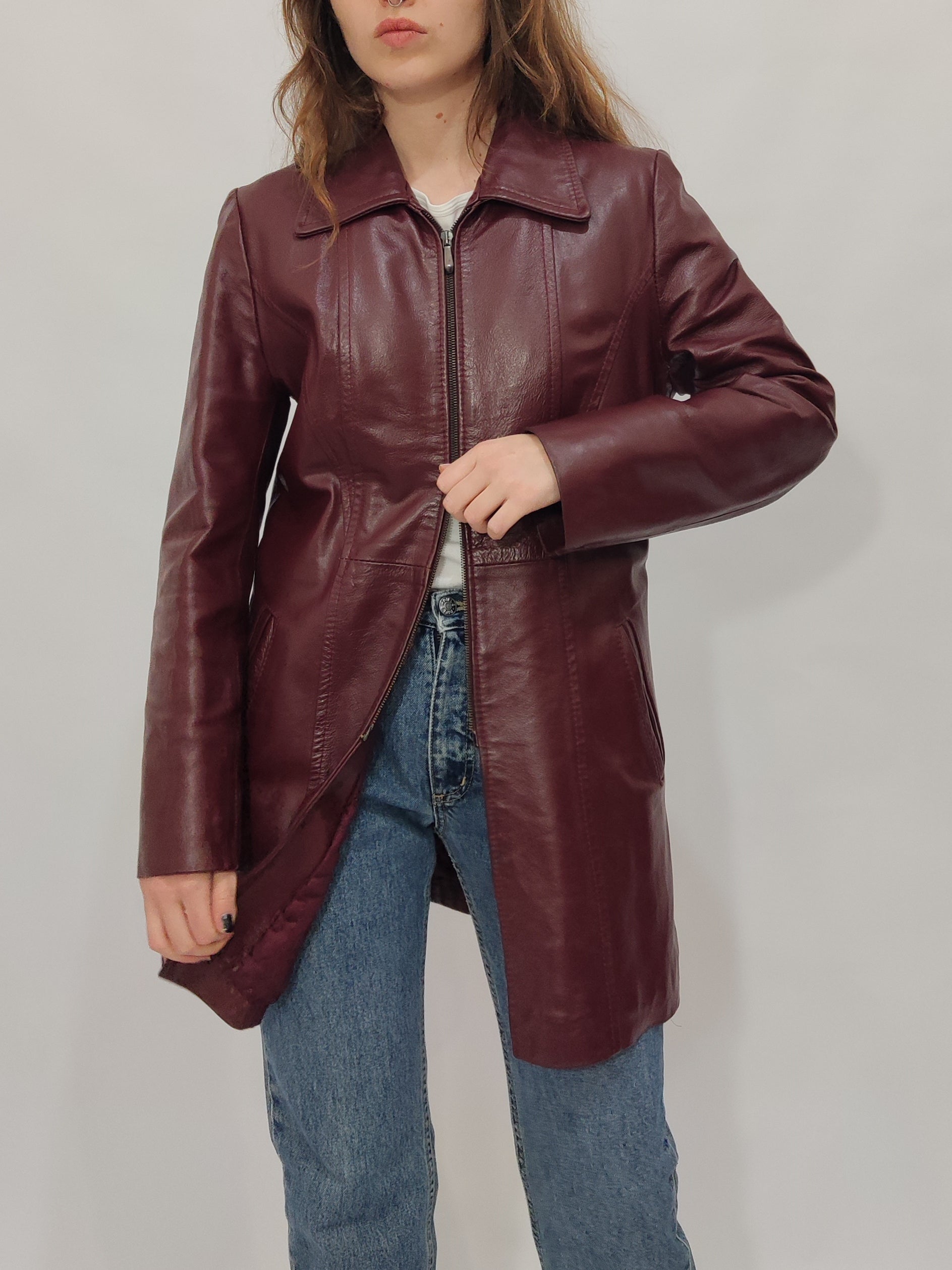 Anni '90, giacca vintage in vera pelle di colore bordeaux. Taglio slim che segue la linea della figura, lunghezza a metà coscia. Chiusura con zip frontale a doppio cursore, colletto classico e due comode tasche. Presenta passanti laterali per la cinturina in pelle abbinata, in foto l'ho lasciata legata sul retro. Capo di tendenza molto versatile e adatto per tutti i giorni, perfetta anche per i primi freddi poichè imbottita internamente.