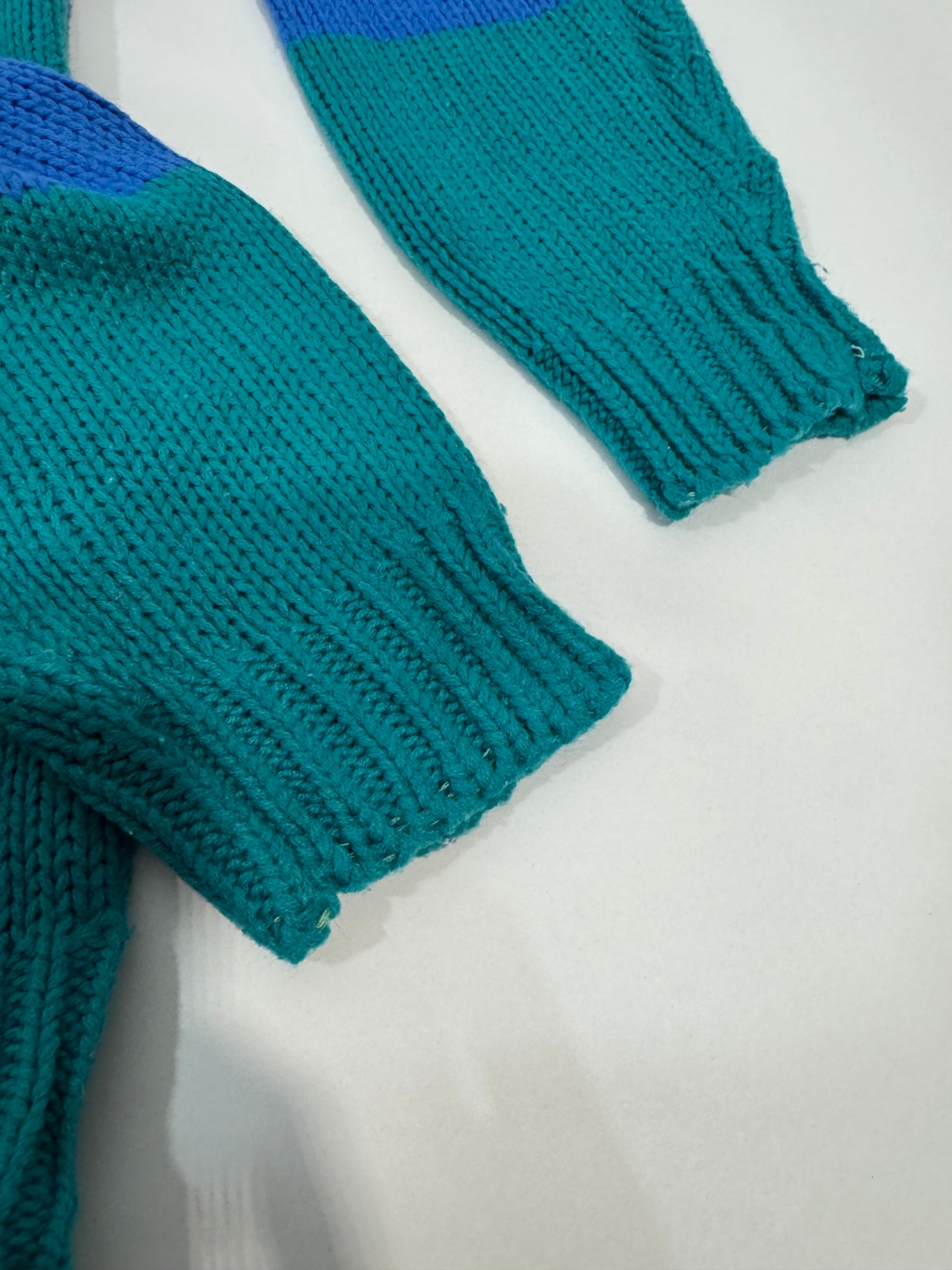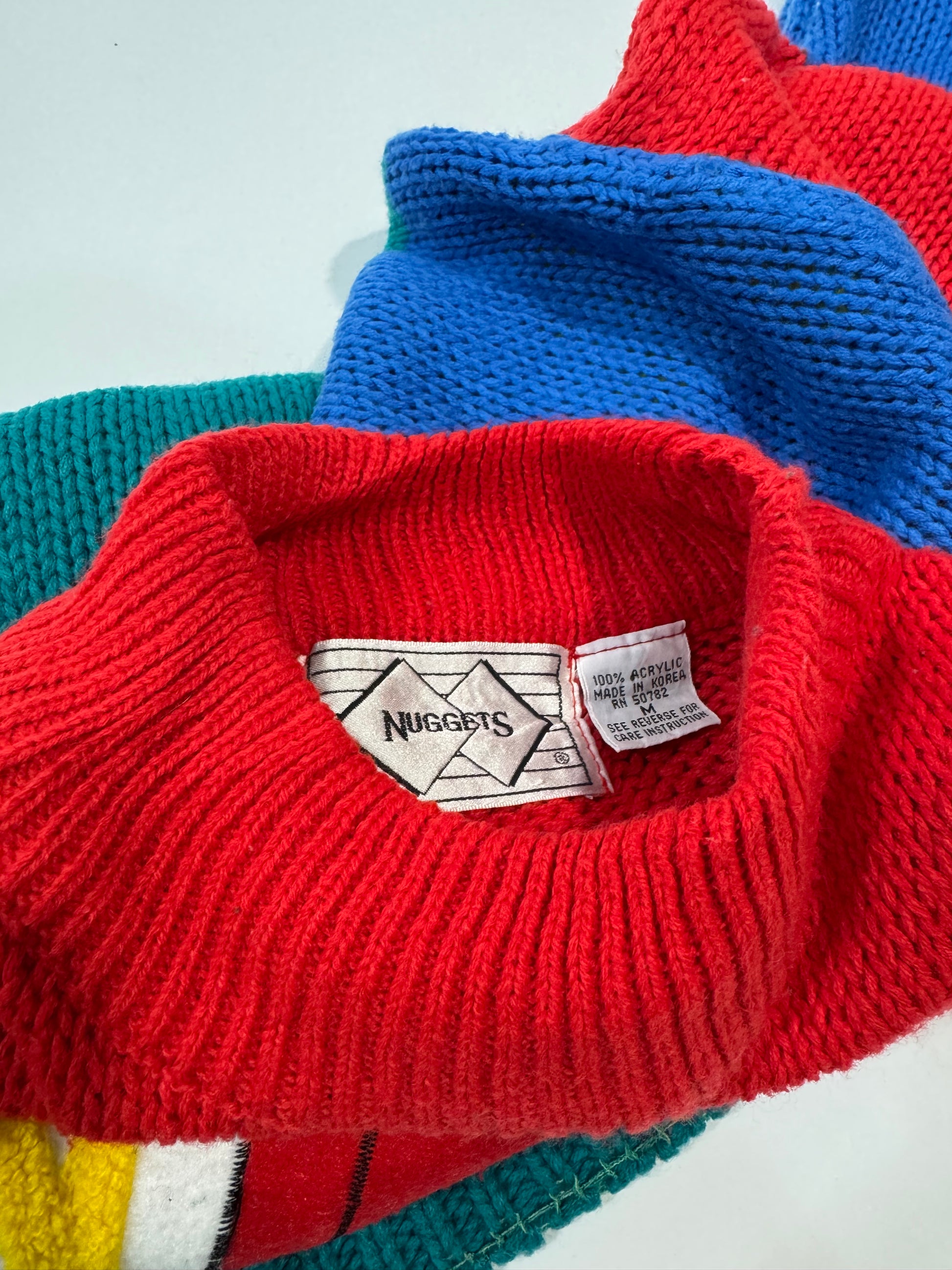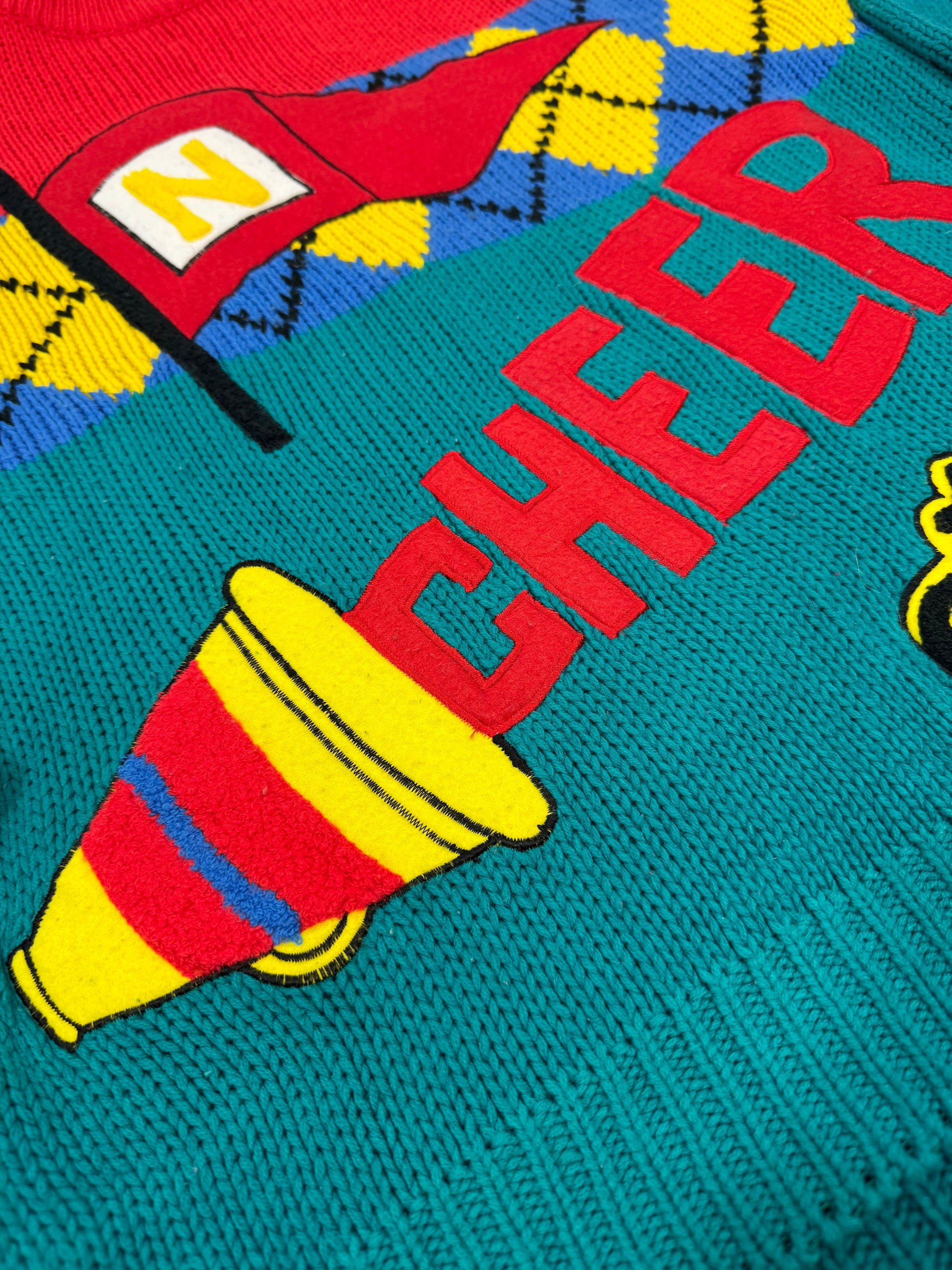 Pullover vintage di ispirazione collegiale, anni '80 by Nuggets, Made in Korea. A blocchi di colore rosso e verde petrolio con fantasia argyle a rombi nei toni di giallo e blu lavorata direttamente nella maglia. Sul davanti sono applicate patch decorative in stile sporty-pop come un megafono con la scritta "CHEER". Vestibilità morbida, struttura compatta, polsini e fondo a costine.
