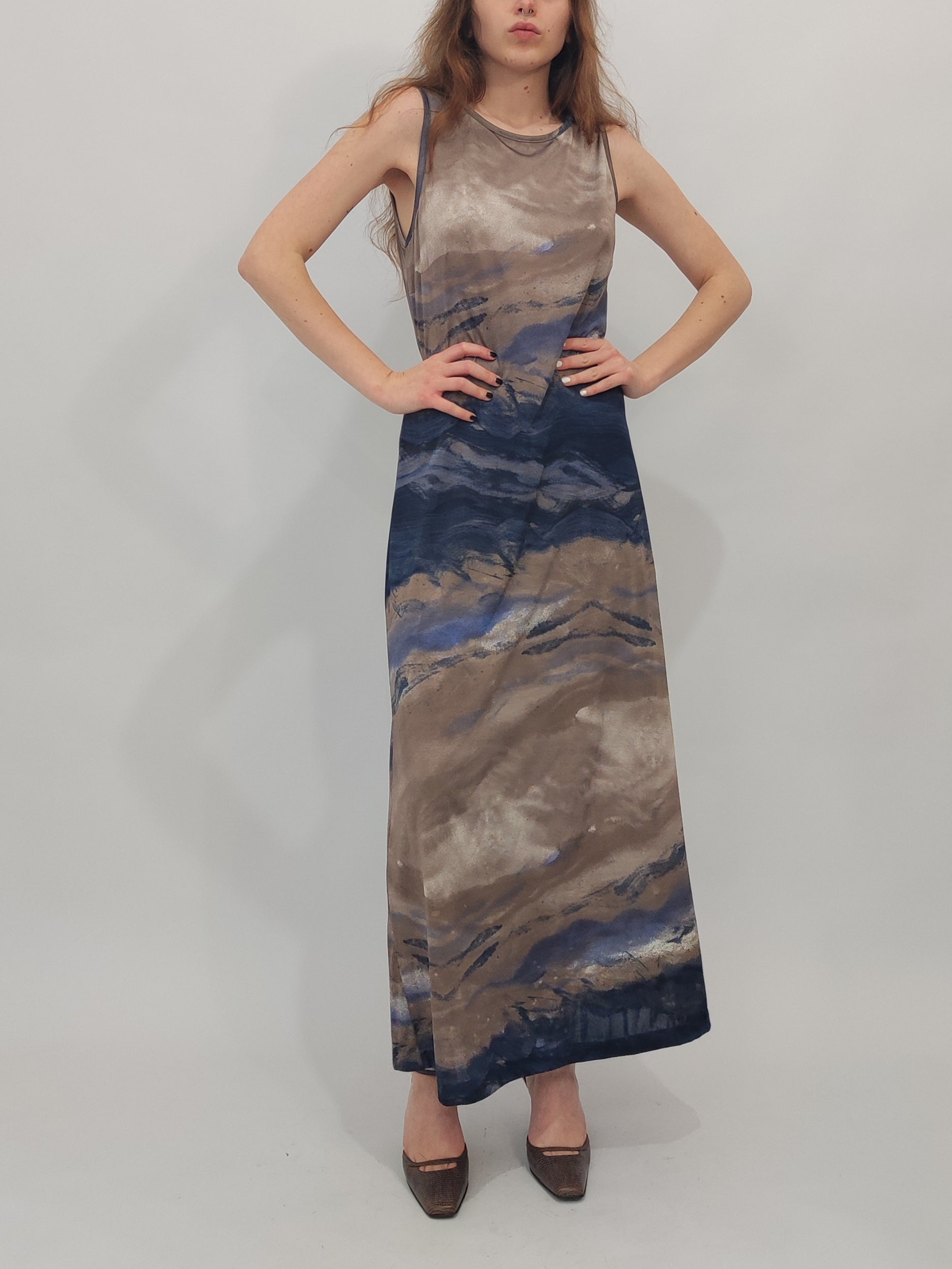 Abito vintage anni '90 by Cristina Gavioli. Modello lungo senza maniche con linea fluida e caduta morbida che segue delicatamente la silhouette. Stampa astratta effetto pennellata, nei toni del marrone, beige, blu navy.