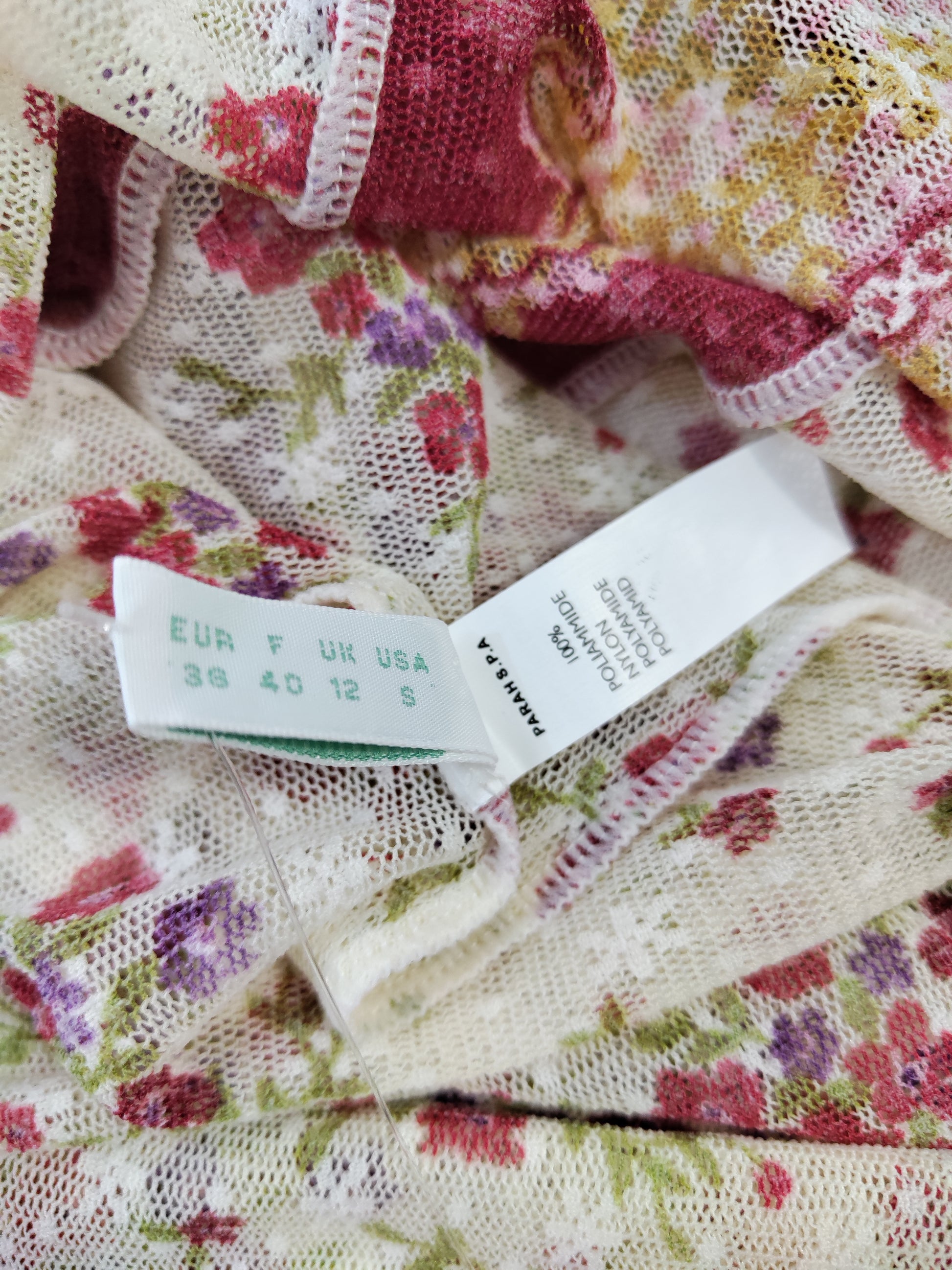 Abitino sottoveste Off Limits by Parah, Deadstock, nuovo con cartellino originale. Modello bustier in tessuto mesh semitrasparente a fantasia floreale sui toni del panna, beige, bordeaux. Carinissima la bordatura in pizzo verde oliva con fiocchetti. Bretella regolabile.