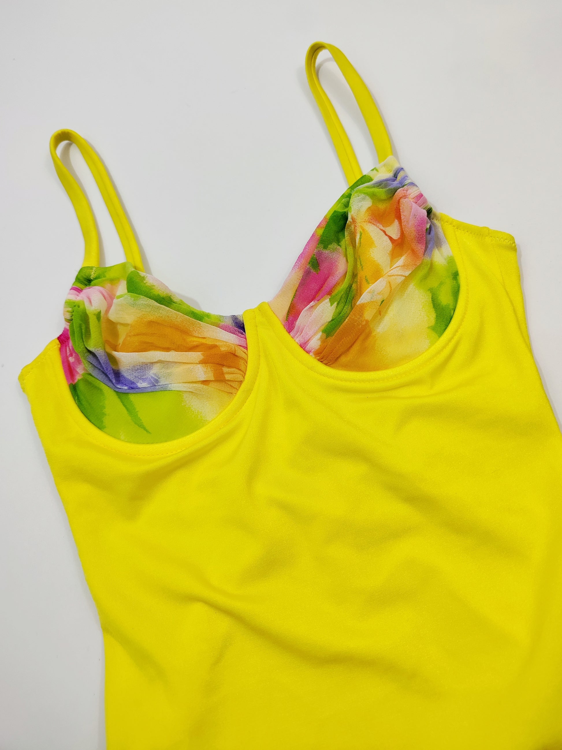 Costume intero vintage by Liberti. Colore giallo con parte superiore in fantasia floreale a pieghine. Coppa con ferretto, scollo ovale sul retro e slip sgambato. Protezione igienica presente.