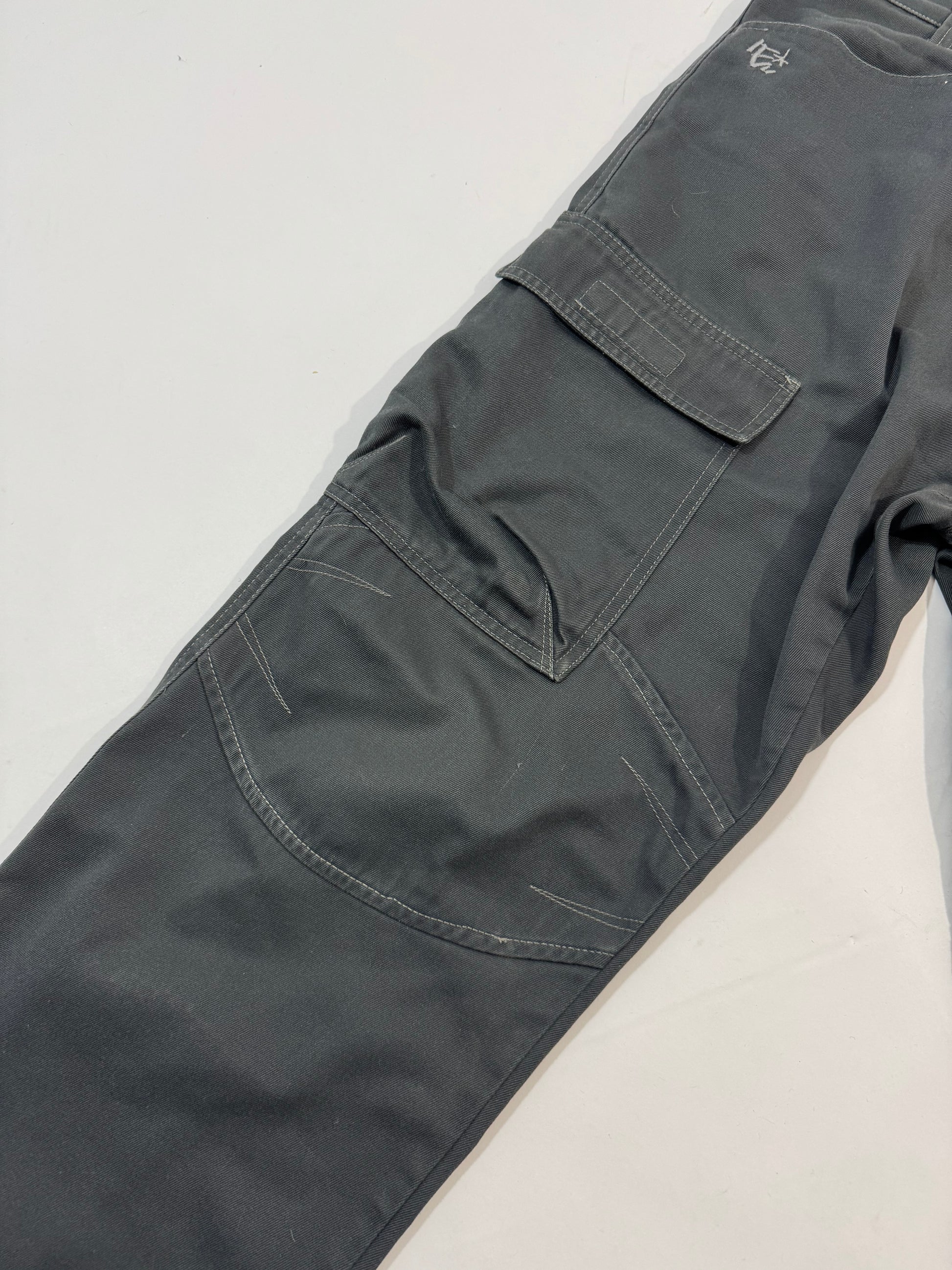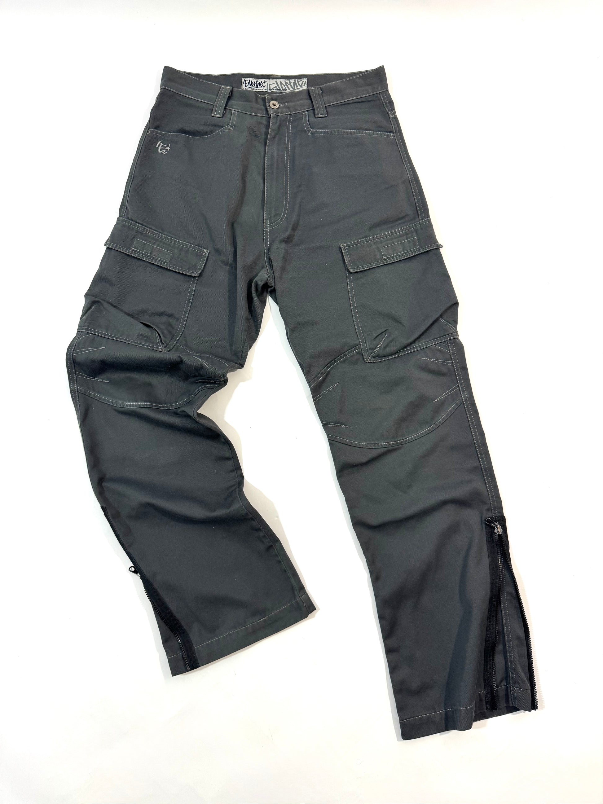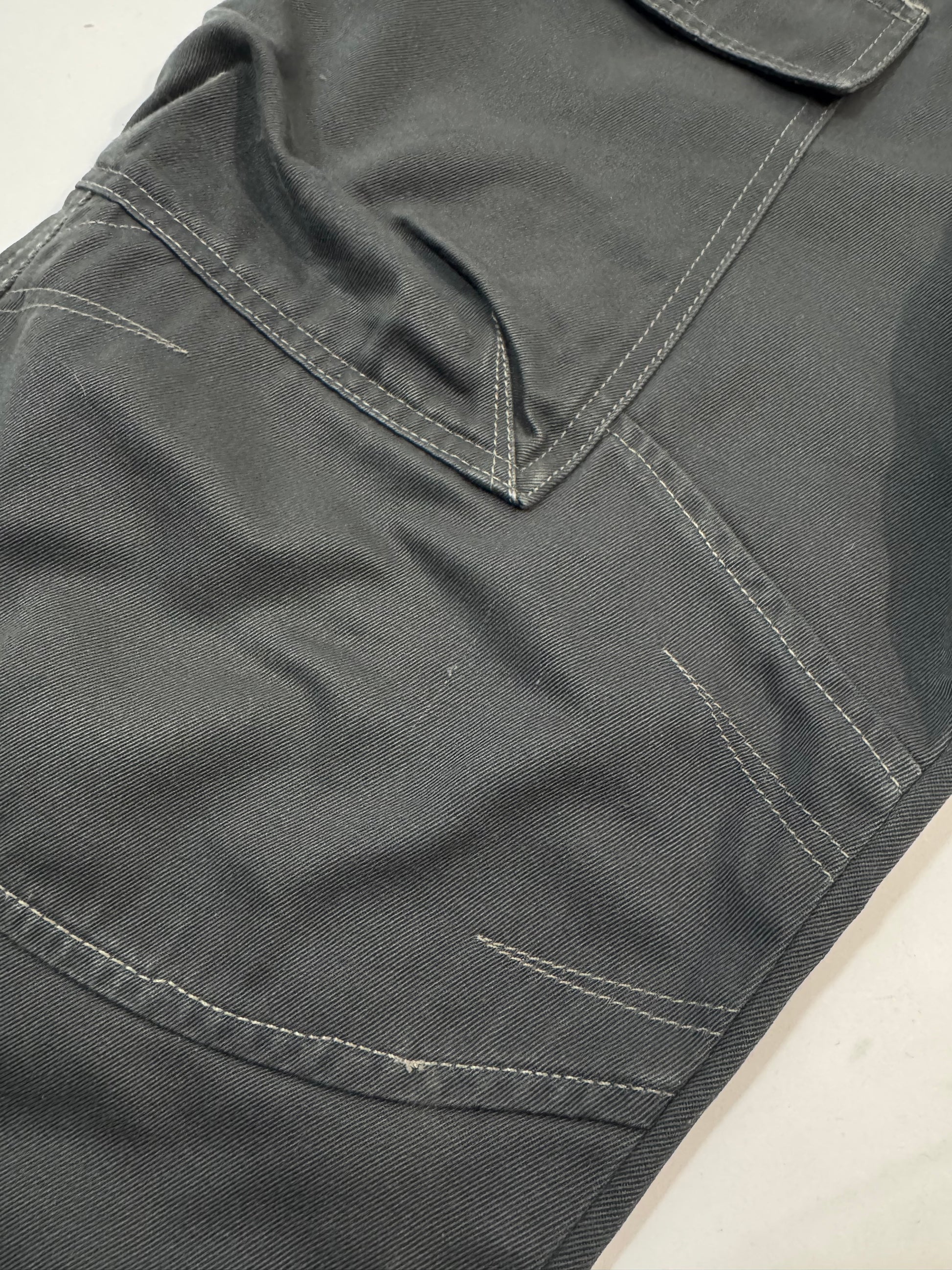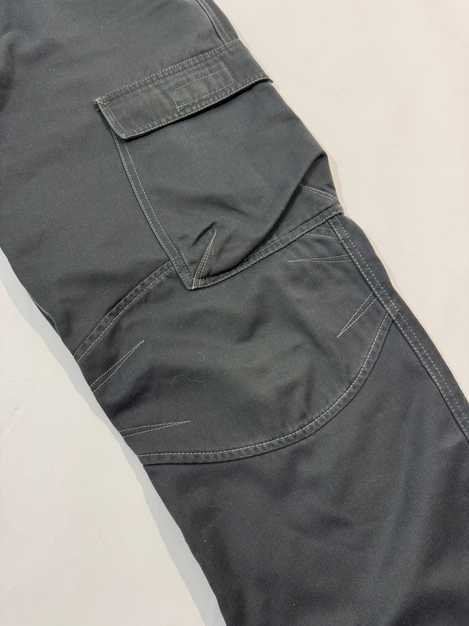 Energie, pantaloni vintage anni '90/primi 2000. Modello cargo in tessuto robusto color antracite. Fit comodo, presentano tasche laterali con patta, impunture a contrasto che creano un motivo geometrico sulle ginocchia e danno struttura alla gamba. Il fondo è dotato di una zip su ogni lato che permette di aprirli leggermente. Sul retro vi sono due tasche squadrate, più in basso un ricamo con nome del brand.