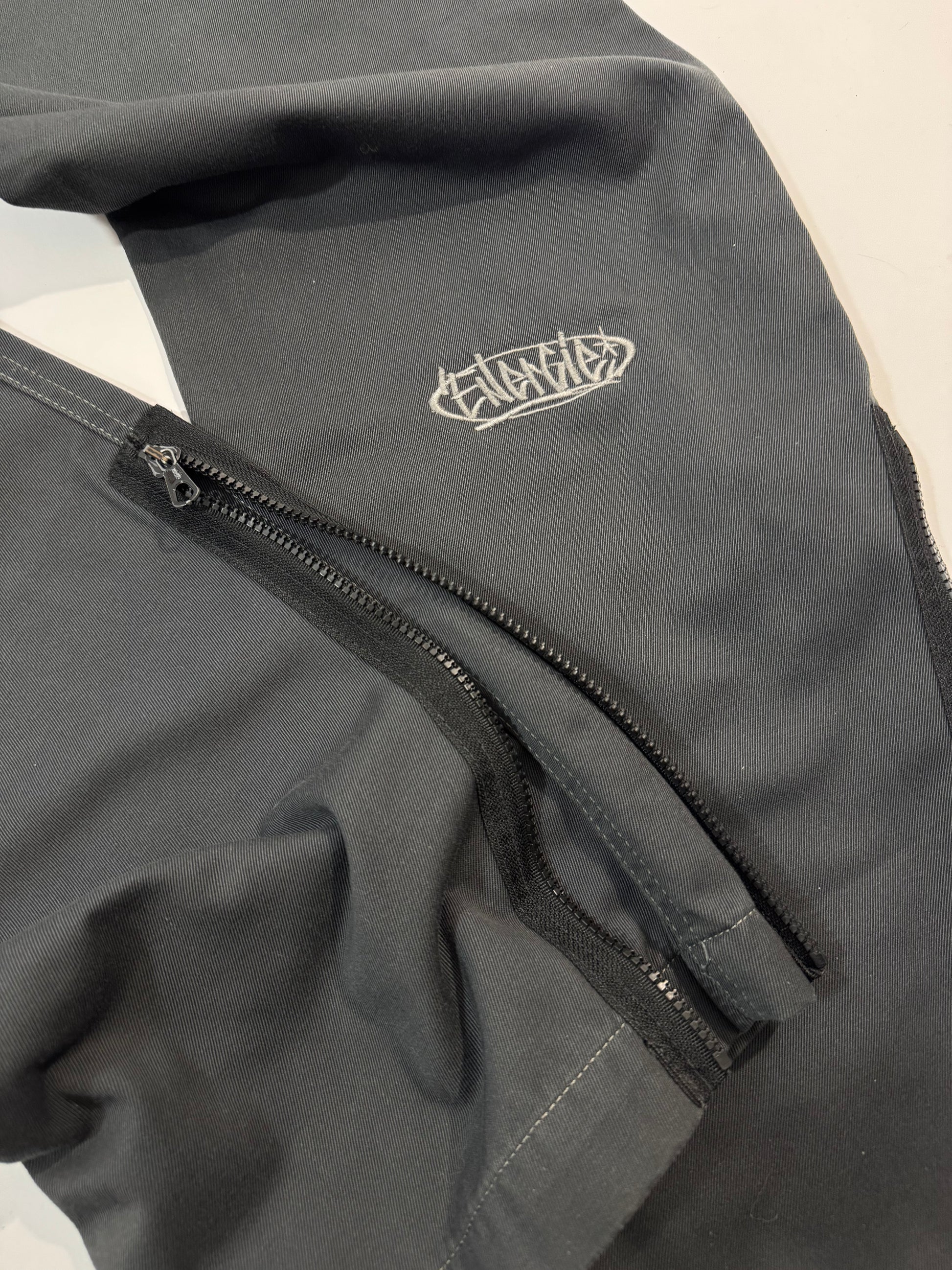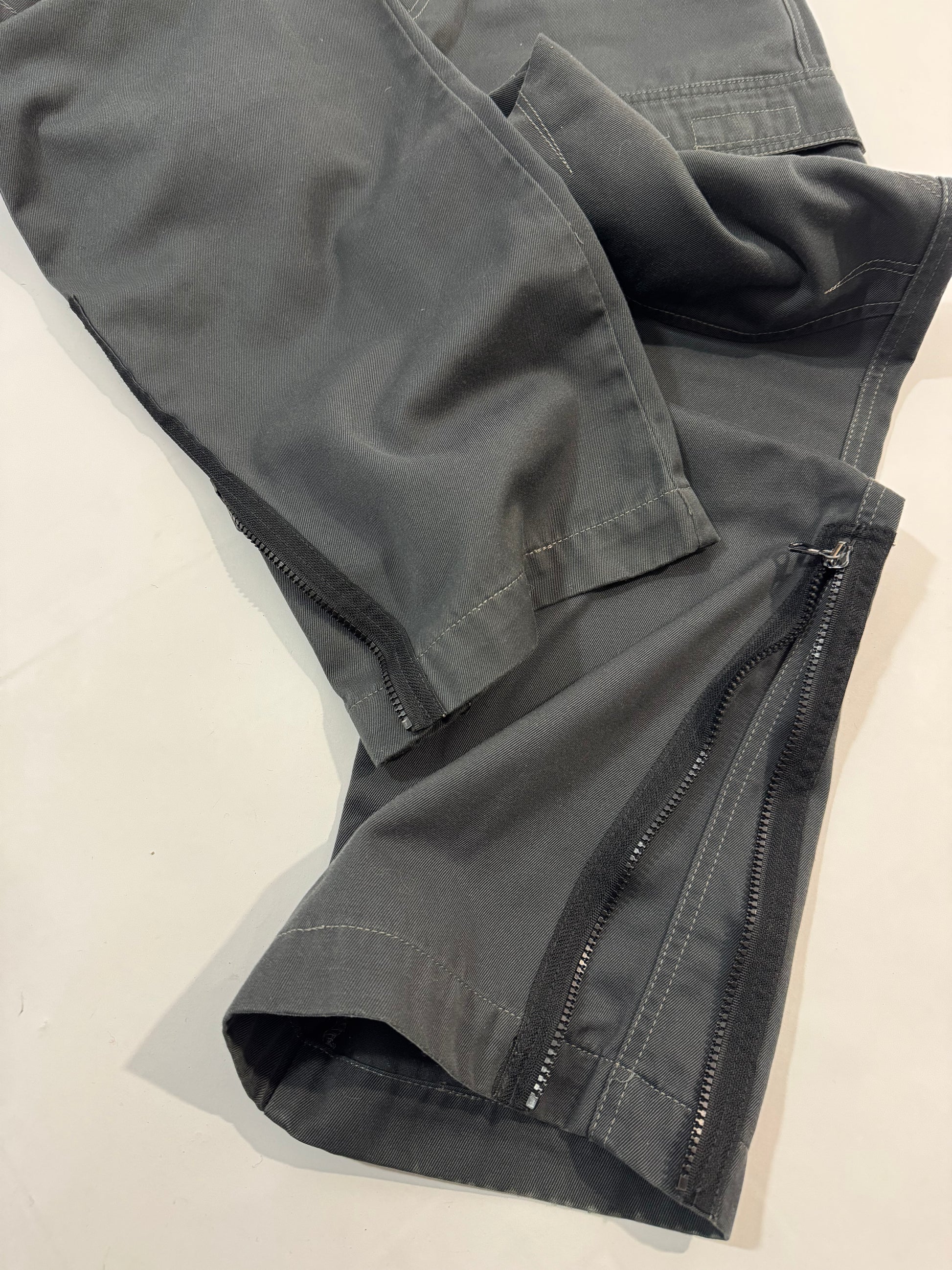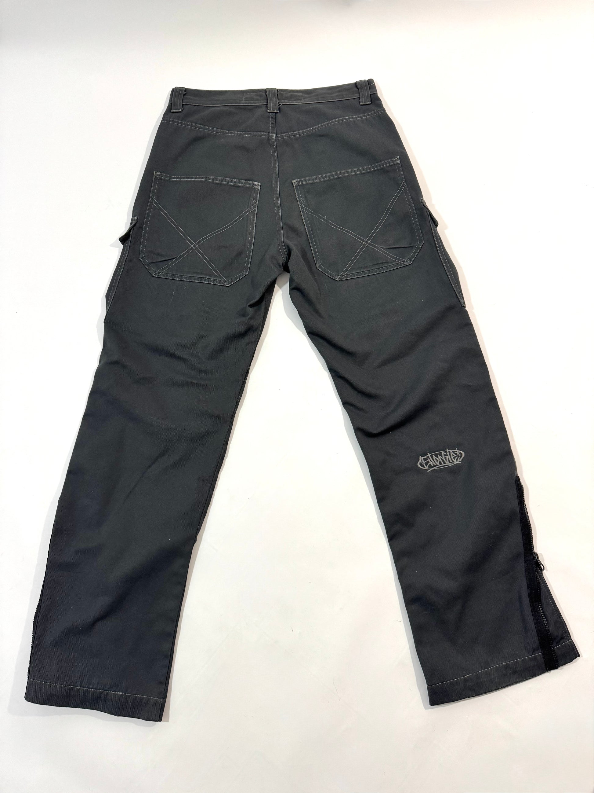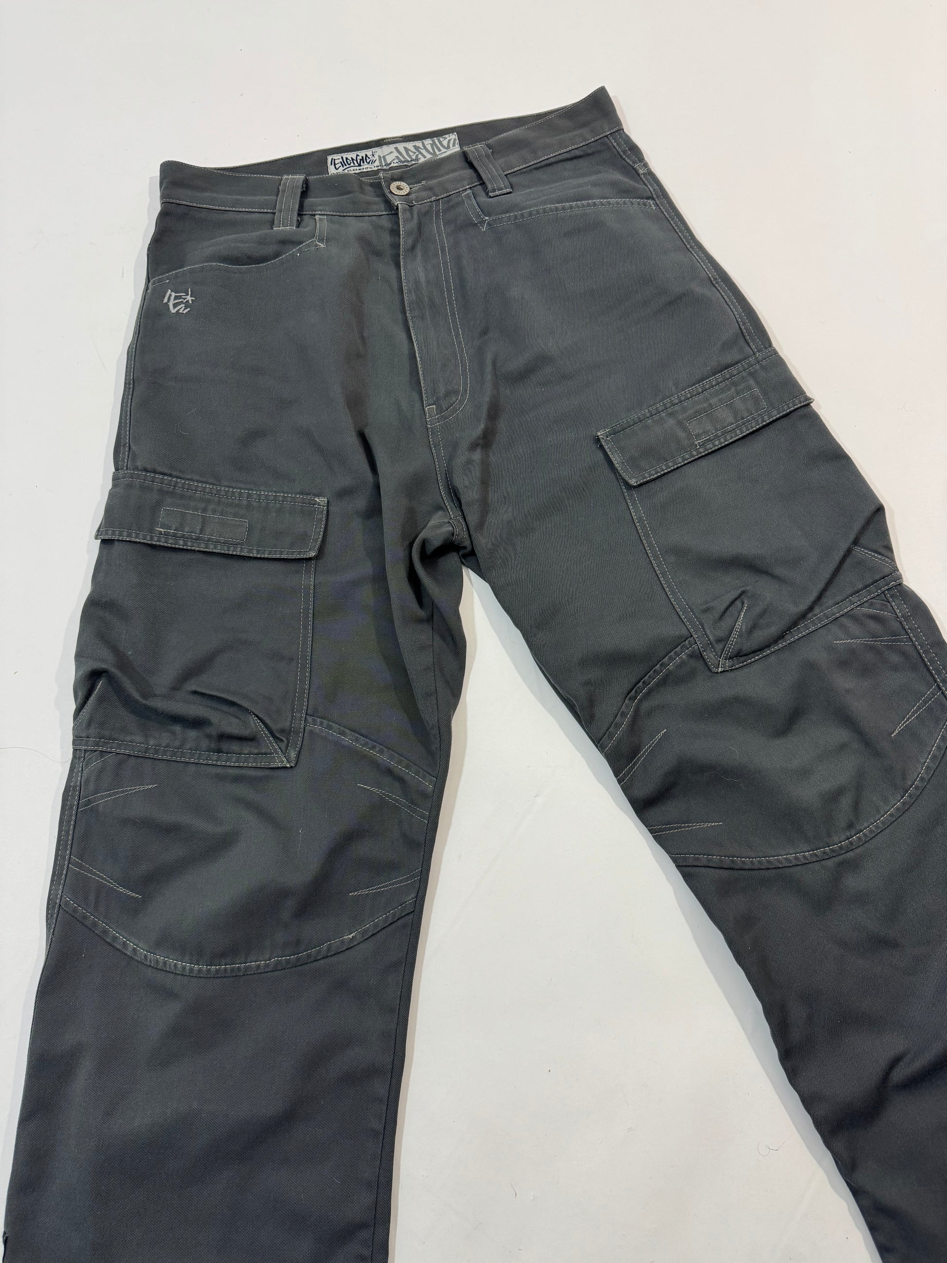 Energie, pantaloni vintage anni '90/primi 2000. Modello cargo in tessuto robusto color antracite. Fit comodo, presentano tasche laterali con patta, impunture a contrasto che creano un motivo geometrico sulle ginocchia e danno struttura alla gamba. Il fondo è dotato di una zip su ogni lato che permette di aprirli leggermente. Sul retro vi sono due tasche squadrate, più in basso un ricamo con nome del brand.