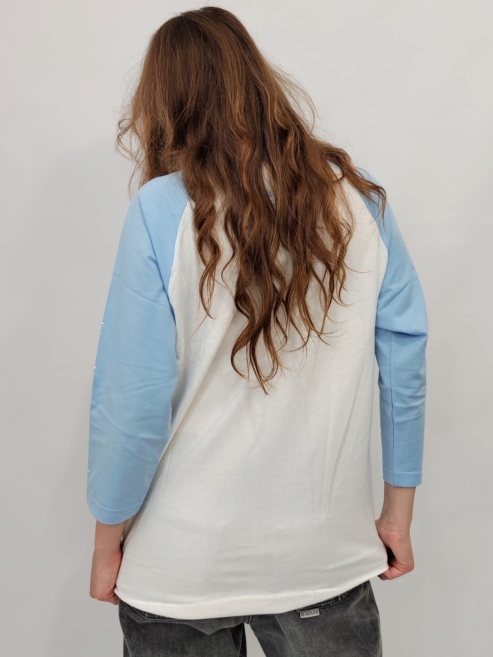 Fiorucci x Le Petit Prince, anno 1993. Baseball tee girocollo con manica a tre quarti e orlo stondato, colori bianco e celeste. Splendida stampa frontale con il Piccolo Principe e la volpe, più la scritta "S'il te plait, apprivoise-moi" sul braccio. Deadstock, nuova con cartellino originale.