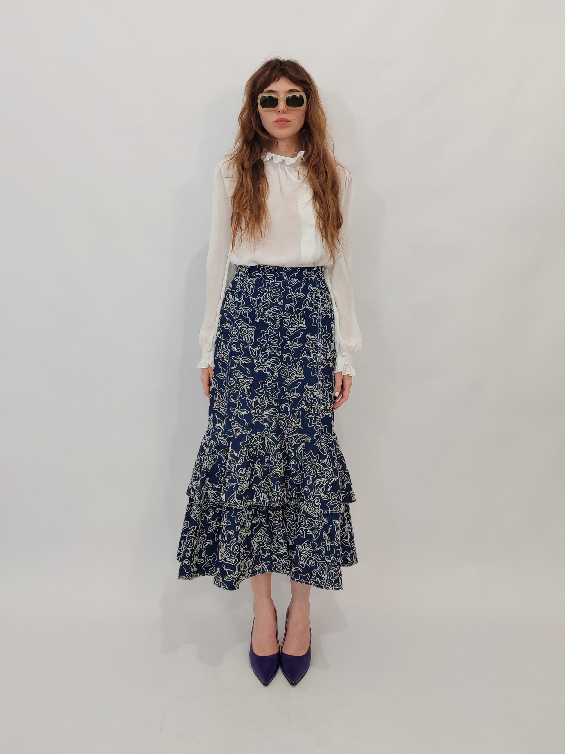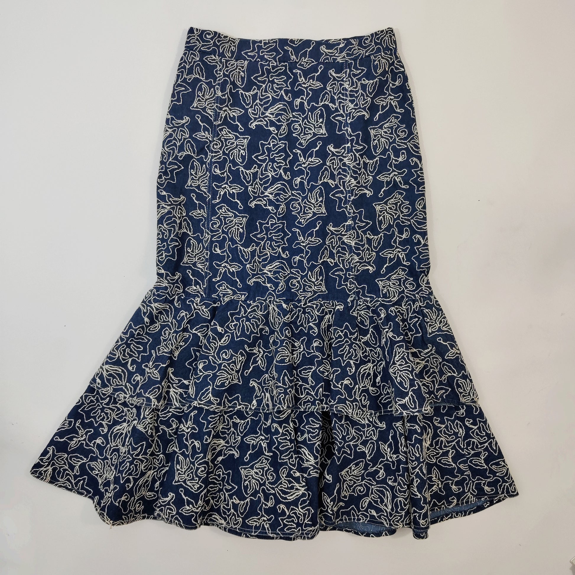 Gonna vintage in denim interamente ricamato, Sonia Fortuna. Modello a vita medio-alta, longuette. La linea segue la figura fino al ginocchio per poi aprirsi in un doppio volant. Chiusura sul retro con zip a scomparsa e bottone. La resistenza del tessuto denim è addolcita e alleggerita da questo elaborato ricamo bianco a tema geometrico-floreale. Capo unico e curatissimo nei dettagli.