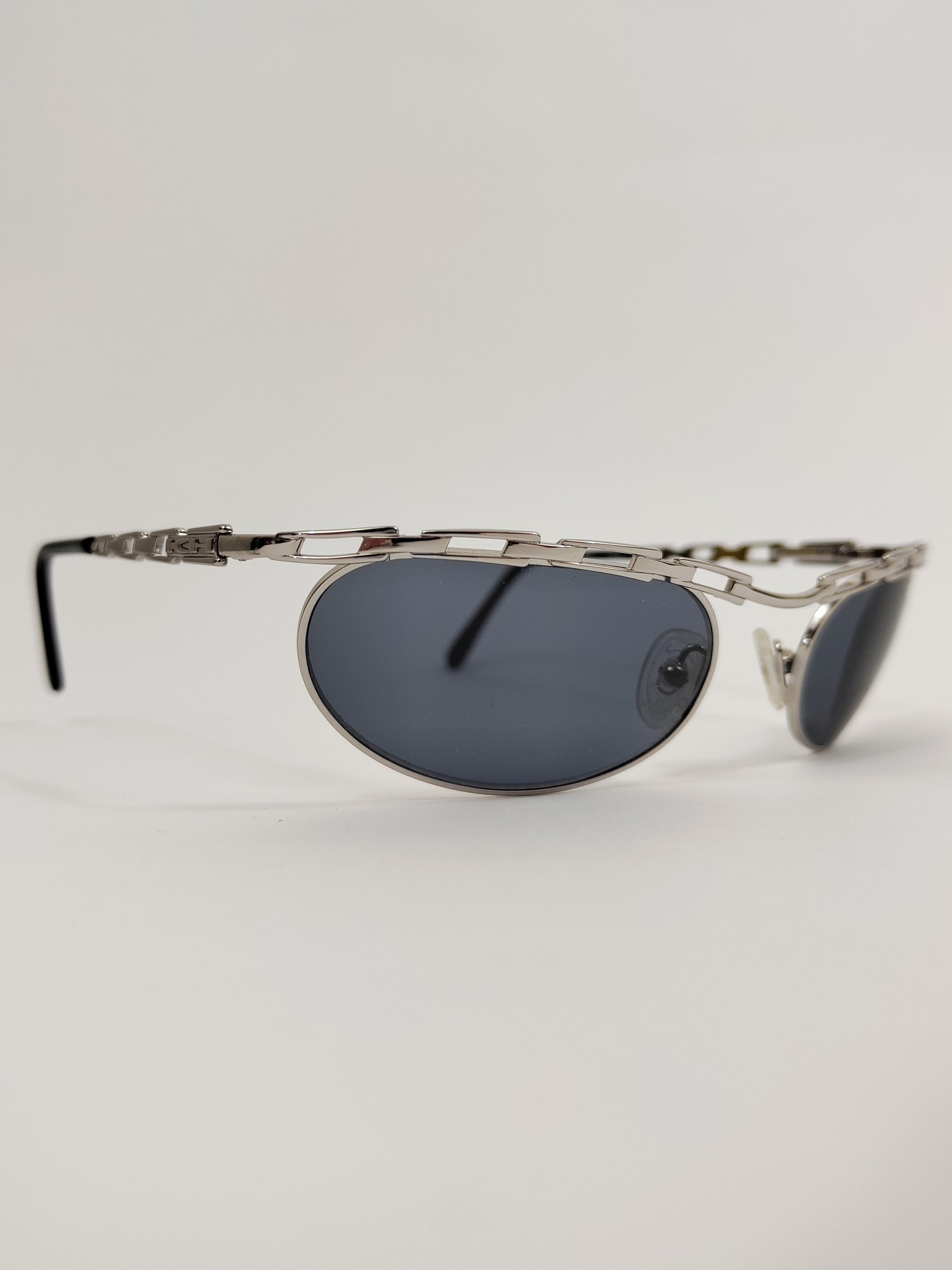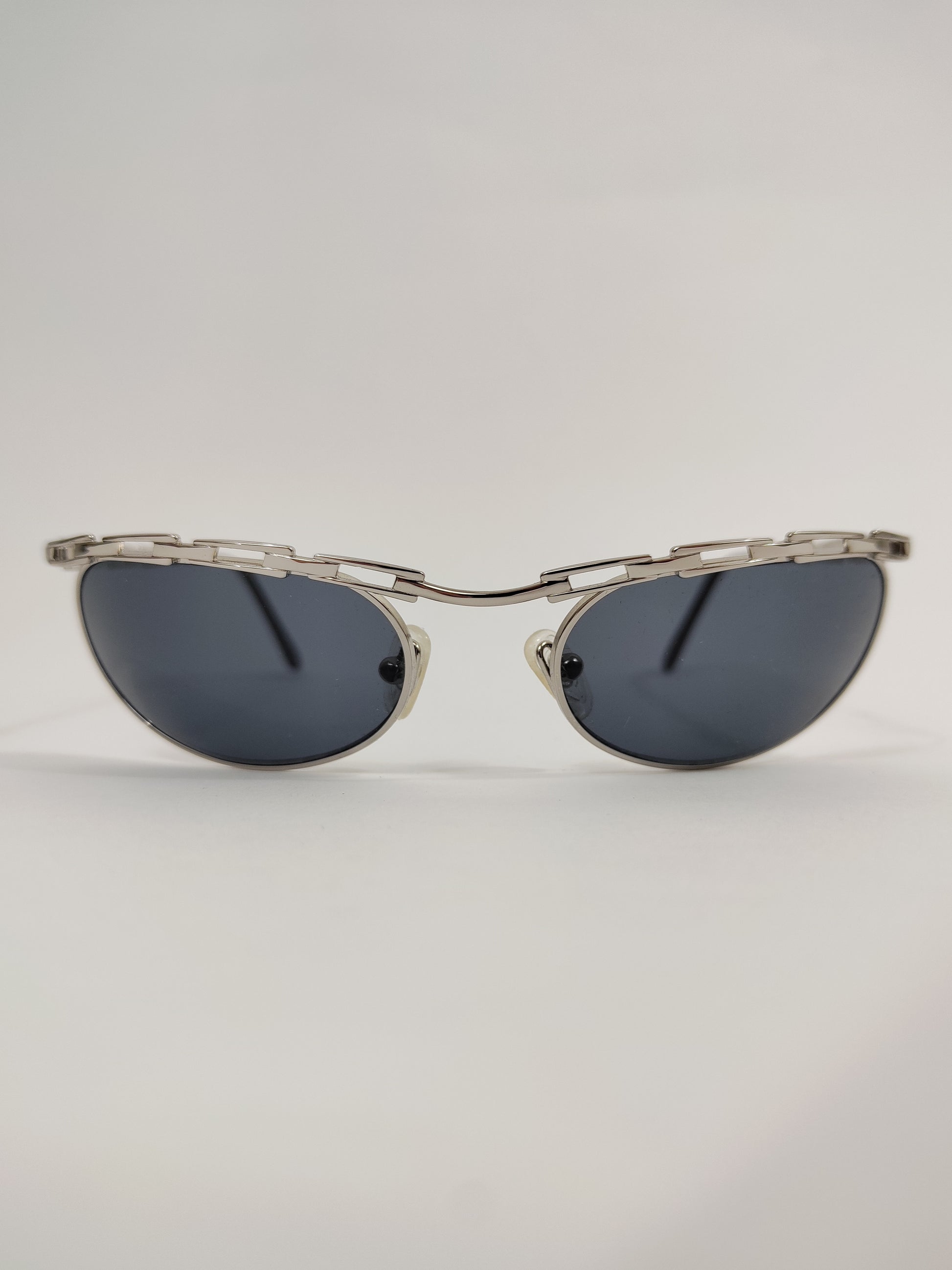 Occhiali da sole vintage fine anni '90 con montatura a catena in metallo colore argento.