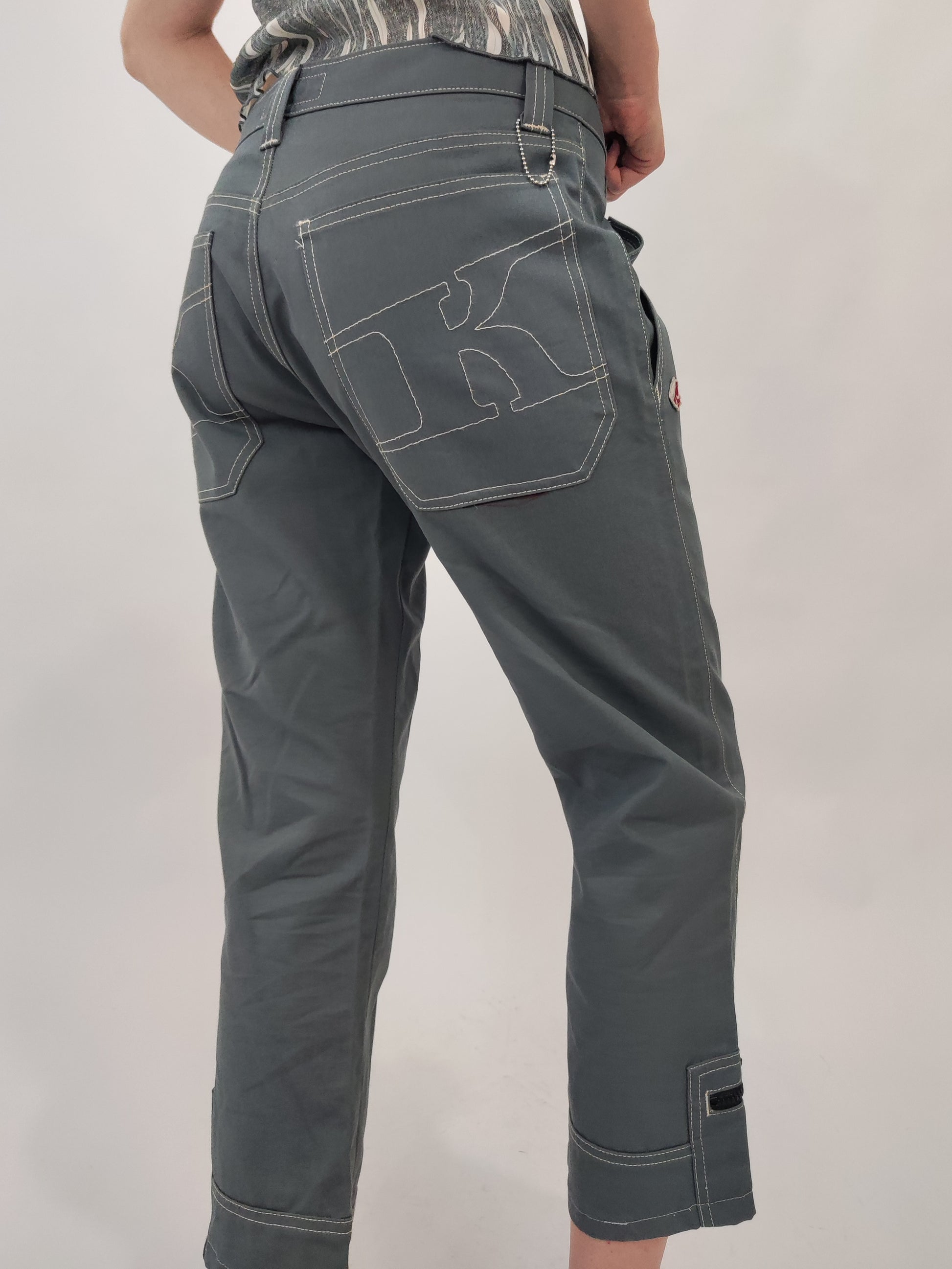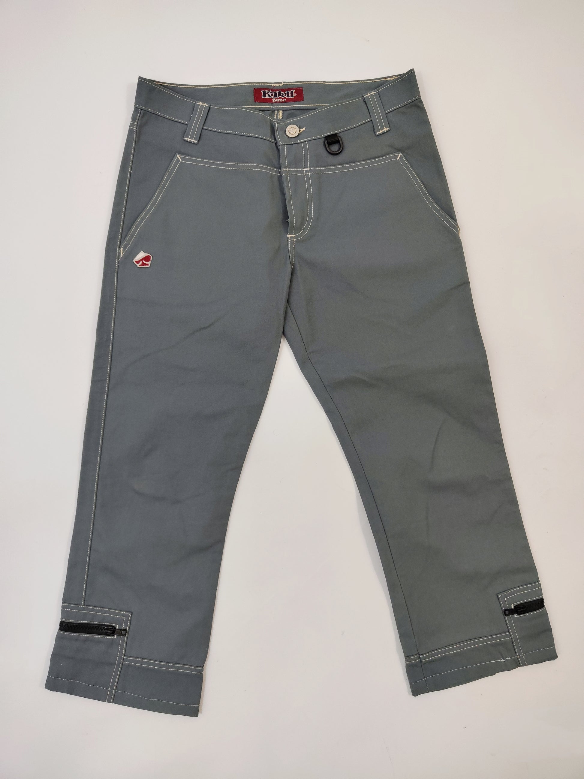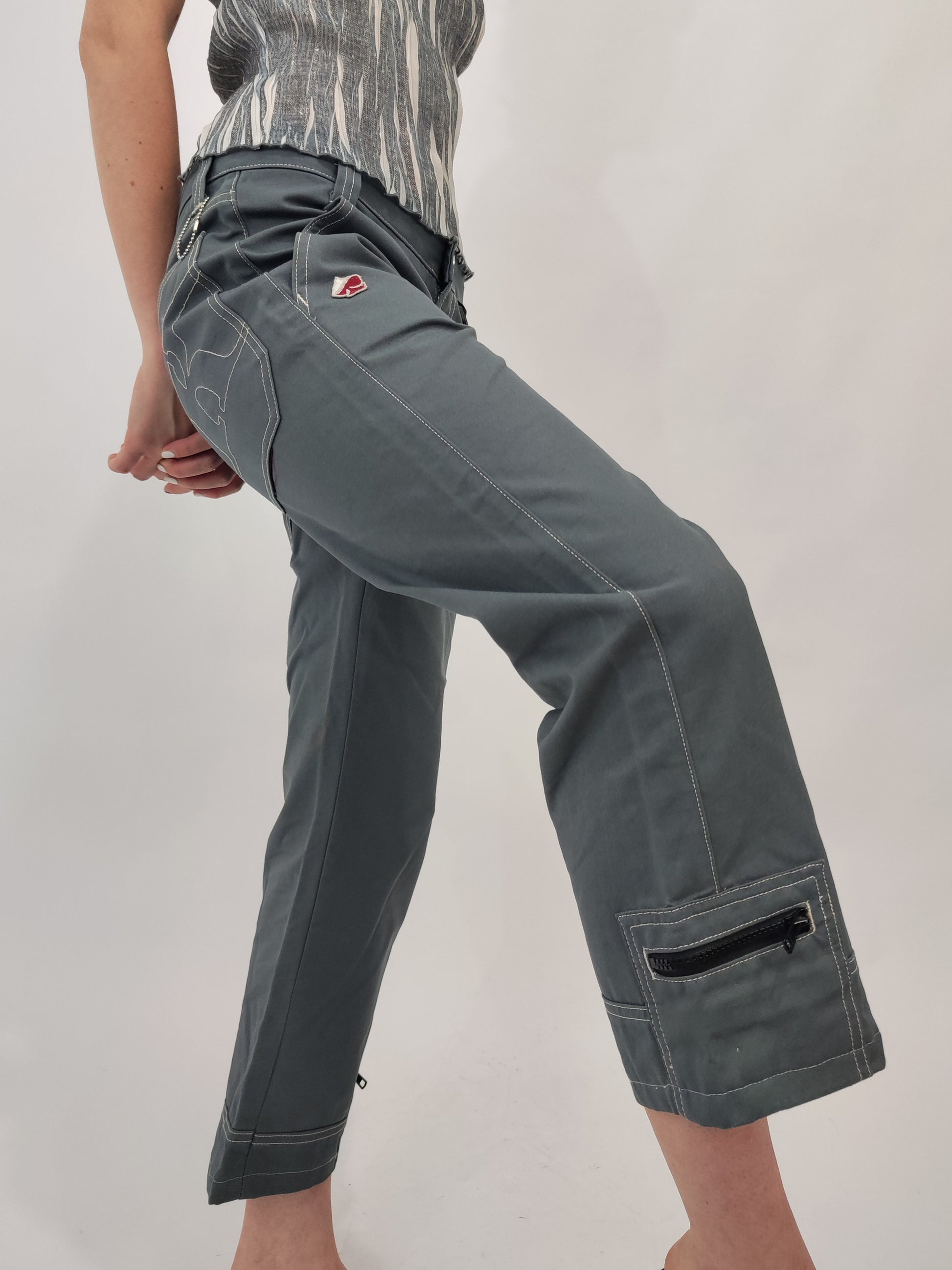 Pantaloni capri in 100% Cotone. Killah, anni 2000. Lunghezza poco al di sopra della caviglia, vita medio-bassa e gamba dritta. Colore grigio con impunture a contrasto, due tasche frontali e due piccole taschine con zip sul fondo delle gambe.