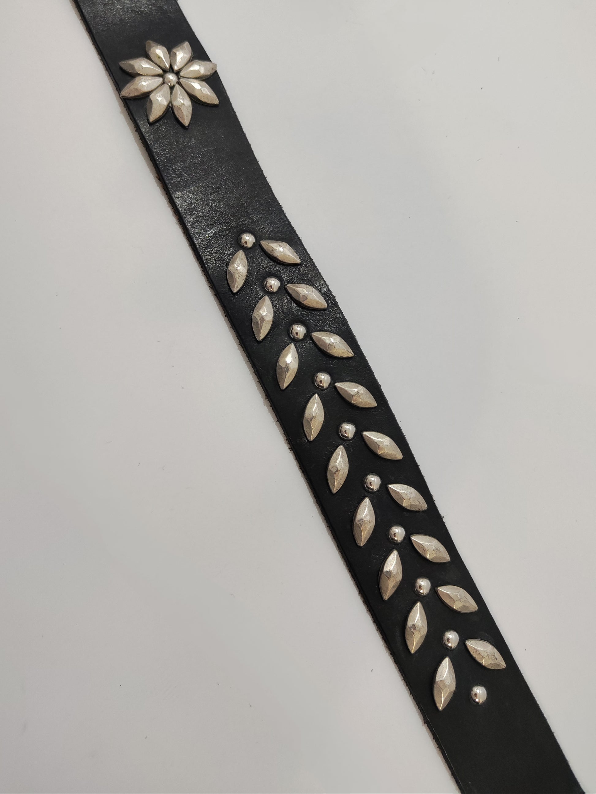 Cintura borchiata vintage in vera pelle nera, fibbia massiccia rettangolare in metallo brunito di color argento. Decorata con borchie a forma di petali, alcune compongono dei veri e propri motivi floreali. Perfetta per elevare look semplici con un tocco rock-chic.