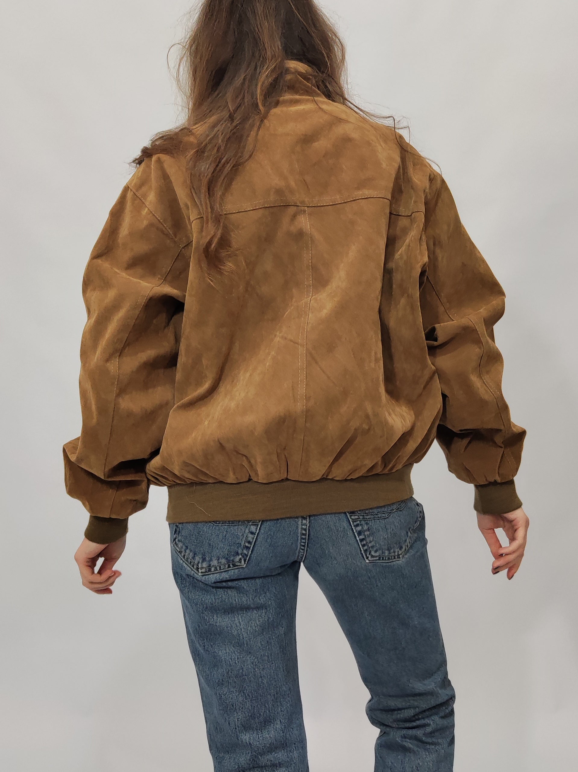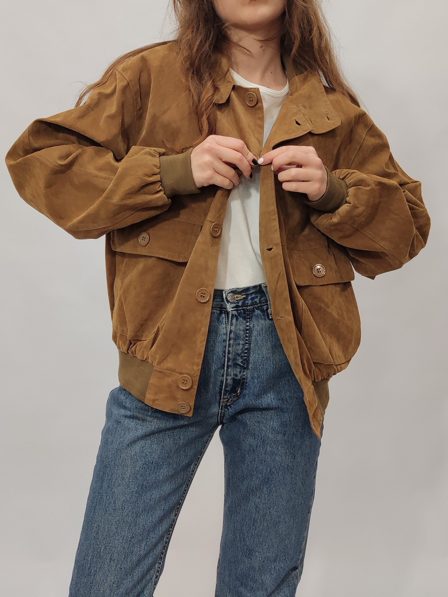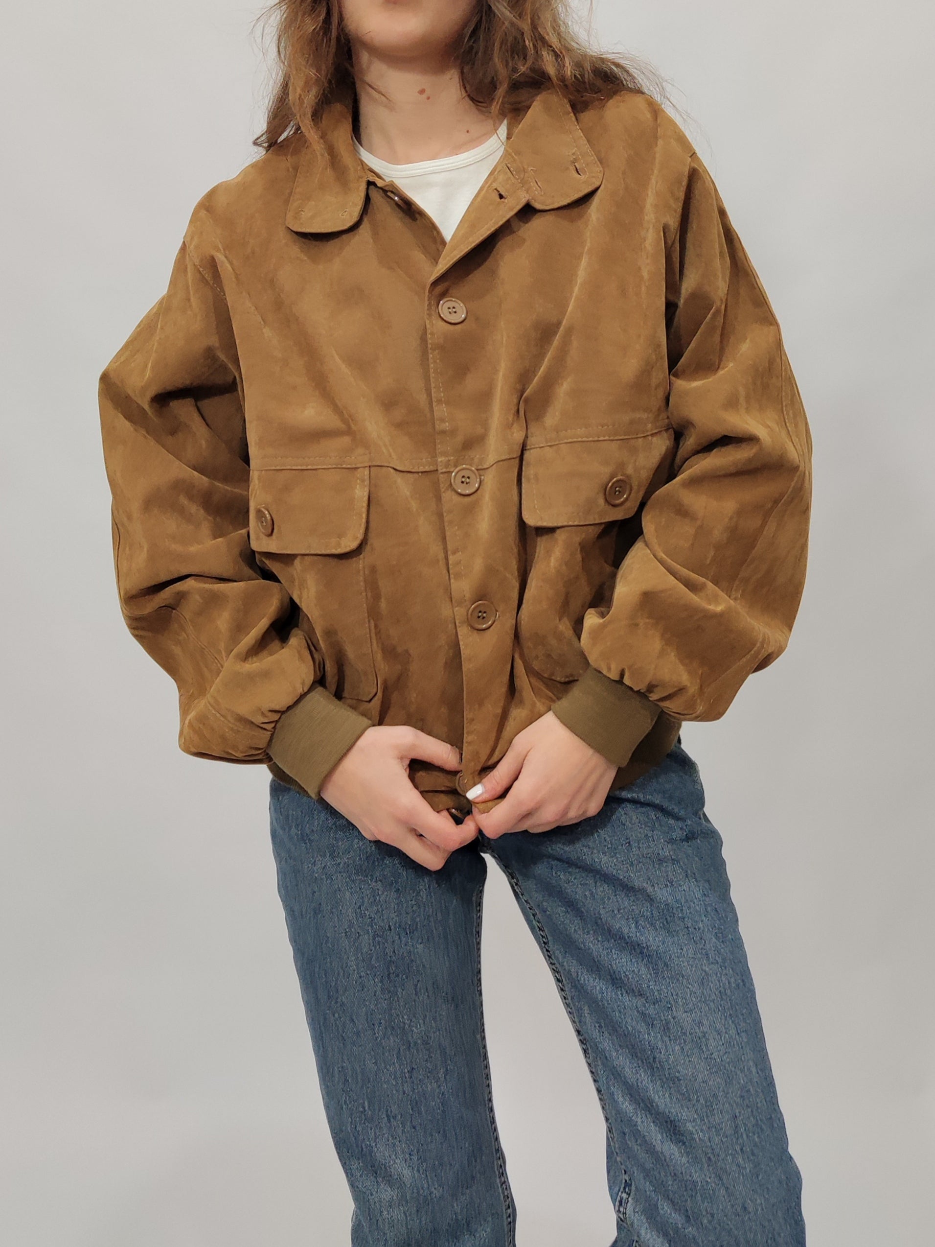 Bomber vintage anni '90 color caramello, in tessuto sintetico con finitura scamosciata che lo rende morbido al tatto. Taglio ampio e comodo, polsini e fondo elasticizzati. Chiusura frontale con bottoni tono su tono, presenta quattro comode tasche. Perfetto per look casual e per tutti i giorni.
