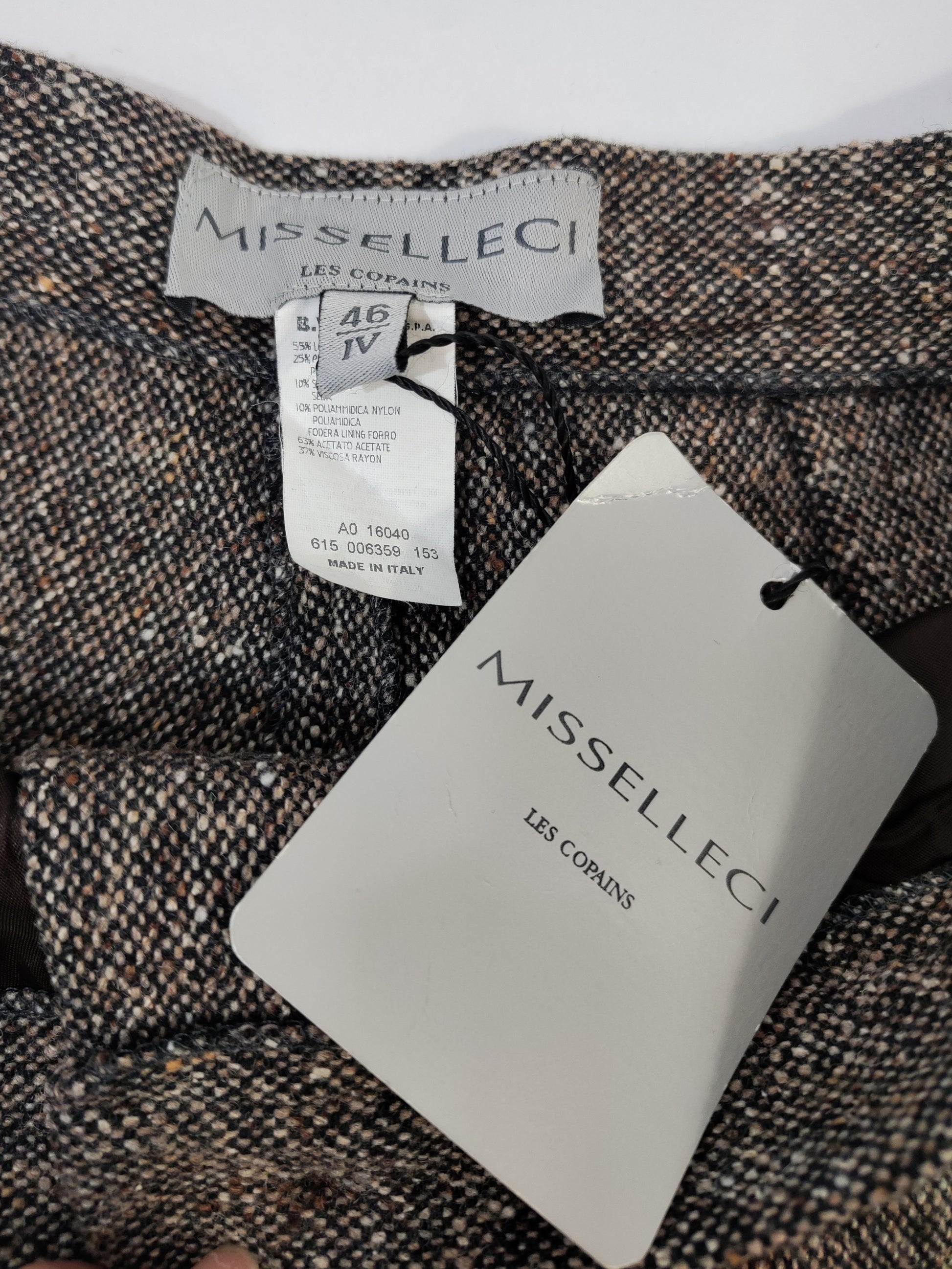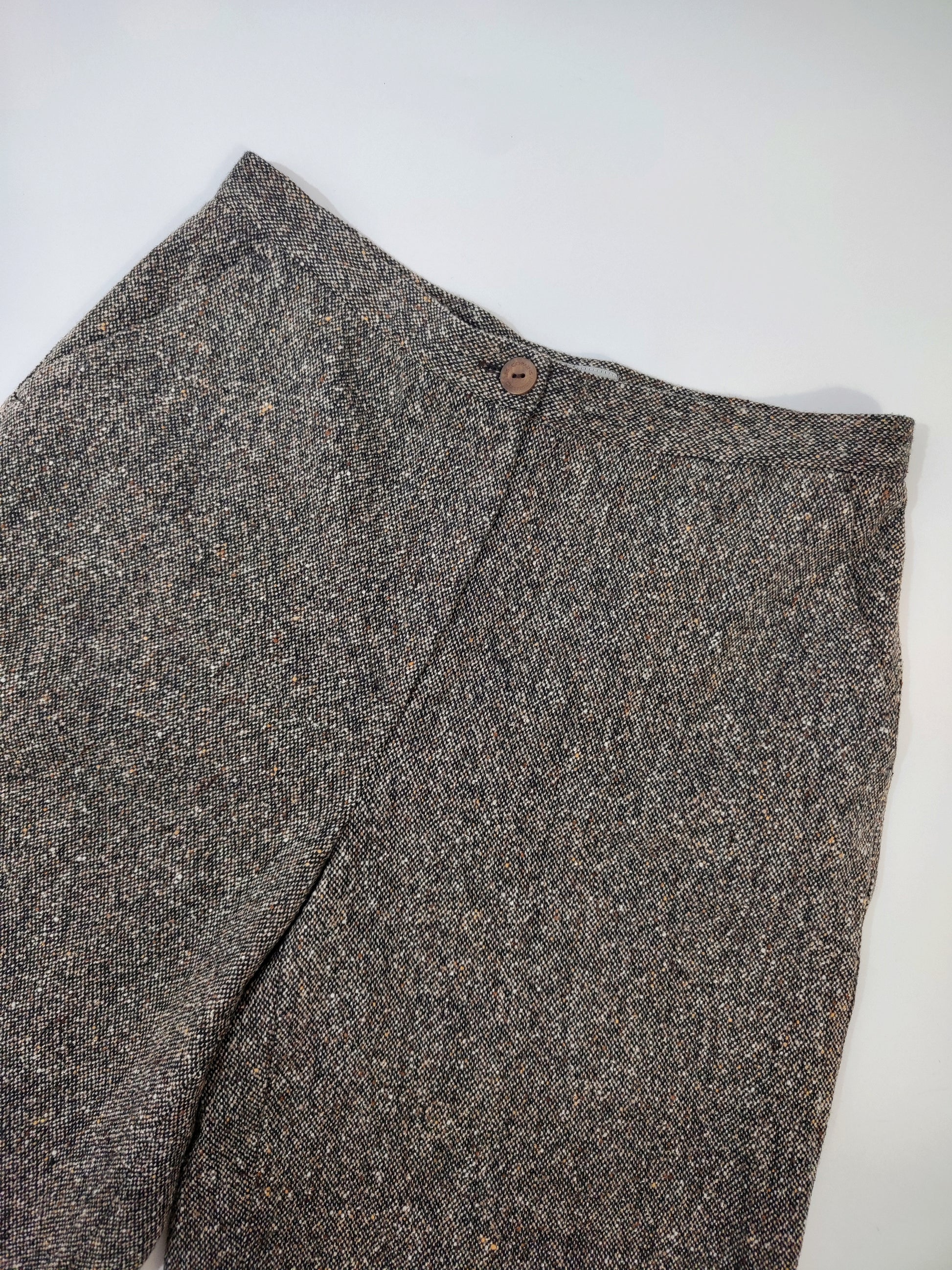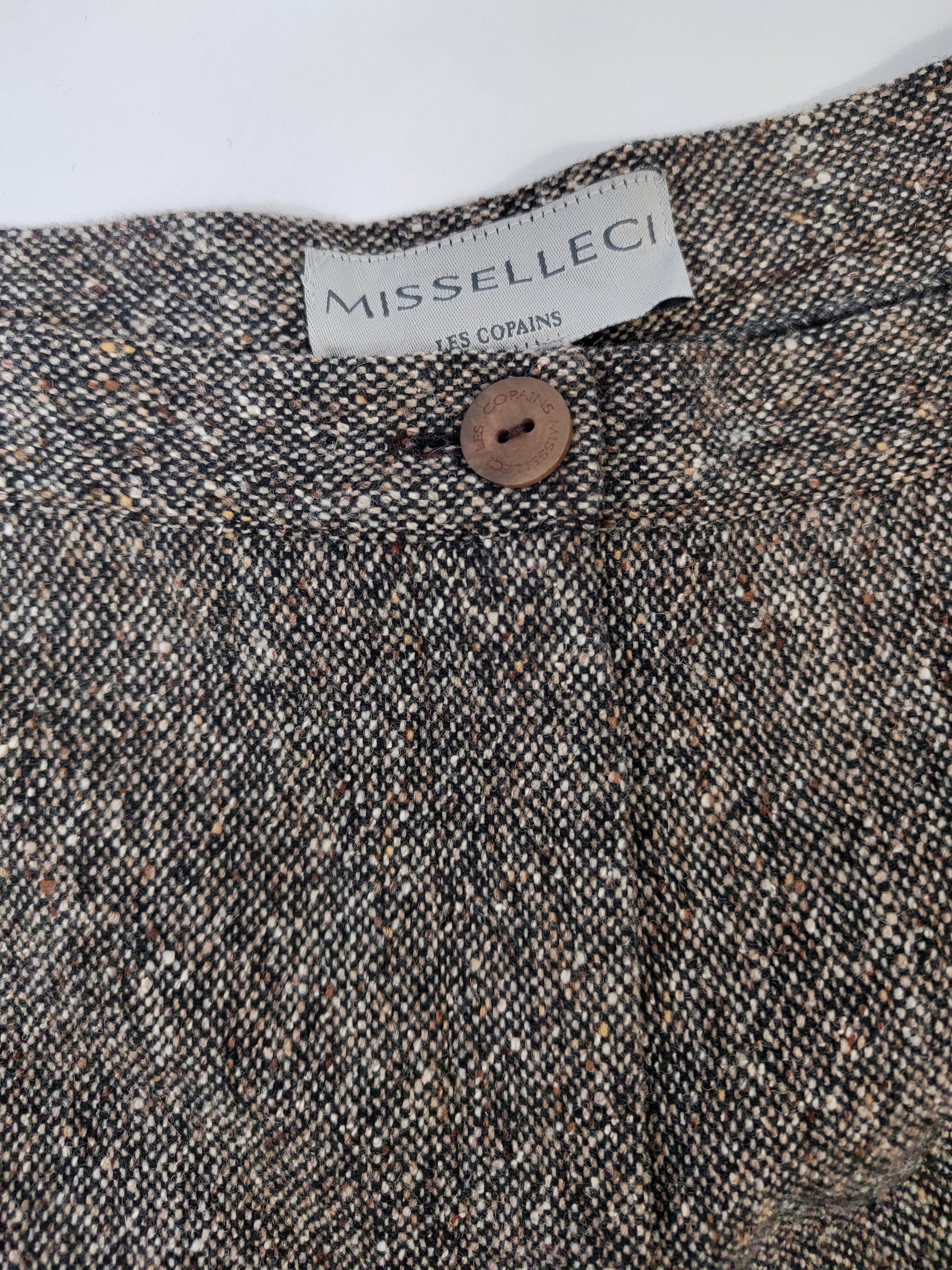 Pantalone a gamba larga modello cropped, Misselleci by Les Copains. Vintage anni '90 deadstock, nuovo con cartellino originale. Realizzato in un mix di lana, poliestere e seta, il tessuto è un simil tweed screziato sui toni del marrone, nero e fango. Vita medio-alta con chiusura zip e bottone, comode tasche alla francese, lunghezza alla caviglia, confortevole e comodo per l'ufficio o anche per occasioni più formali.