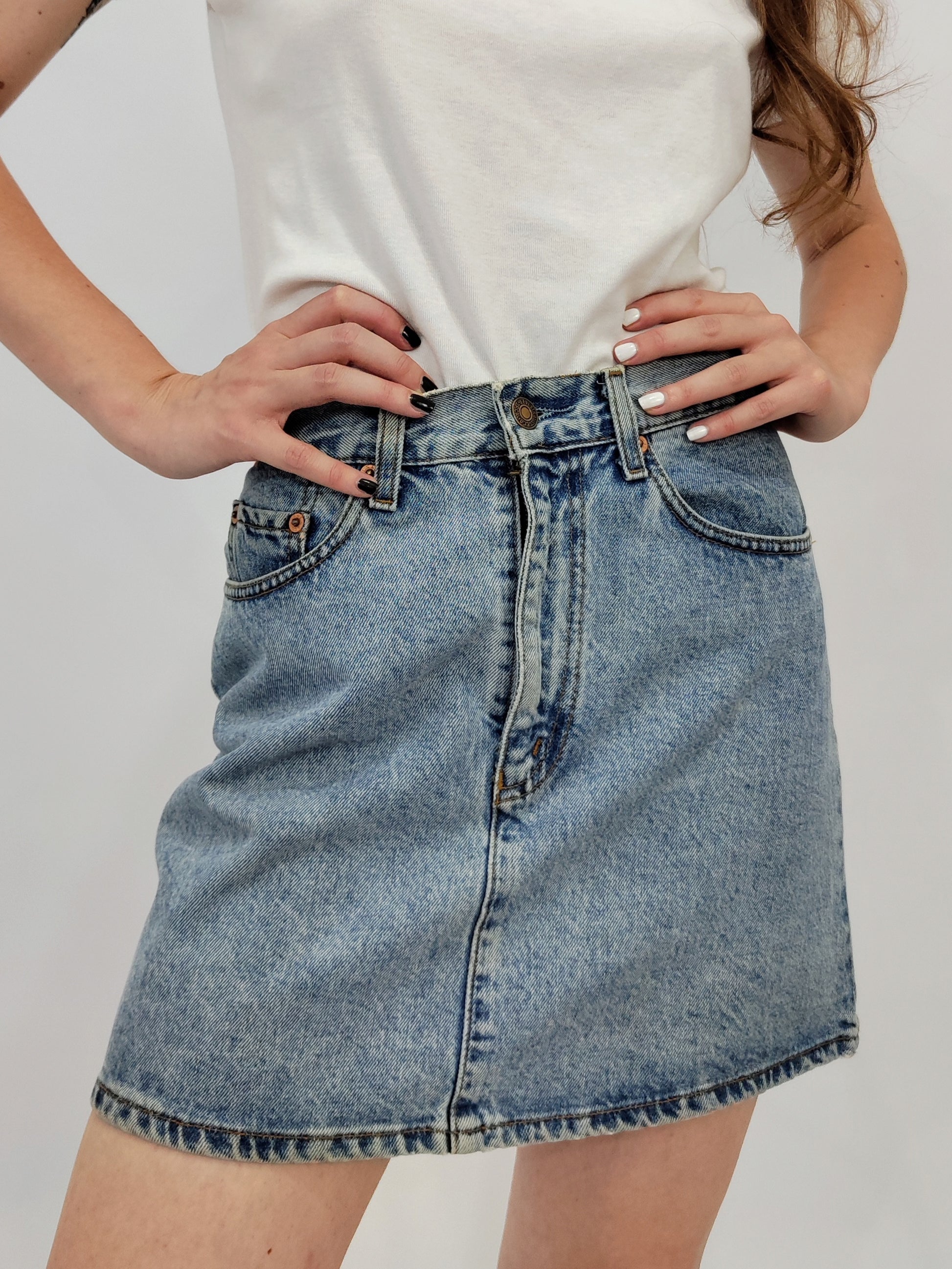 Minigonna Levi's Orange Tab, modello cinque tasche. In denim a lavaggio acido chiaro.