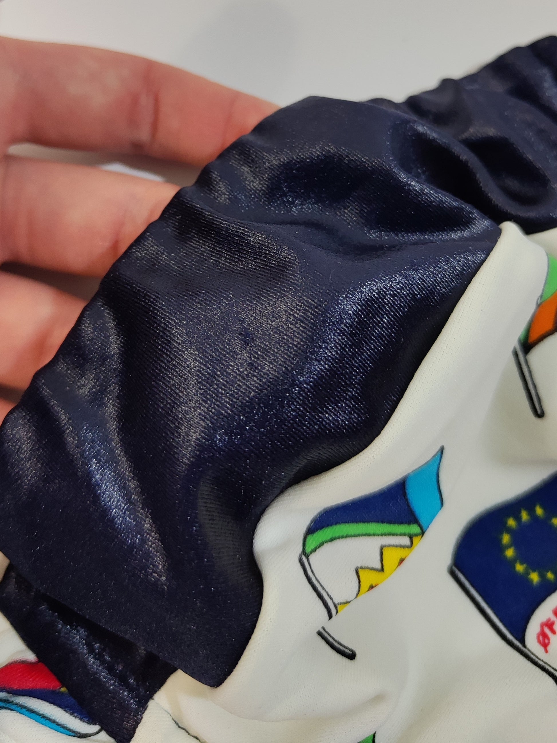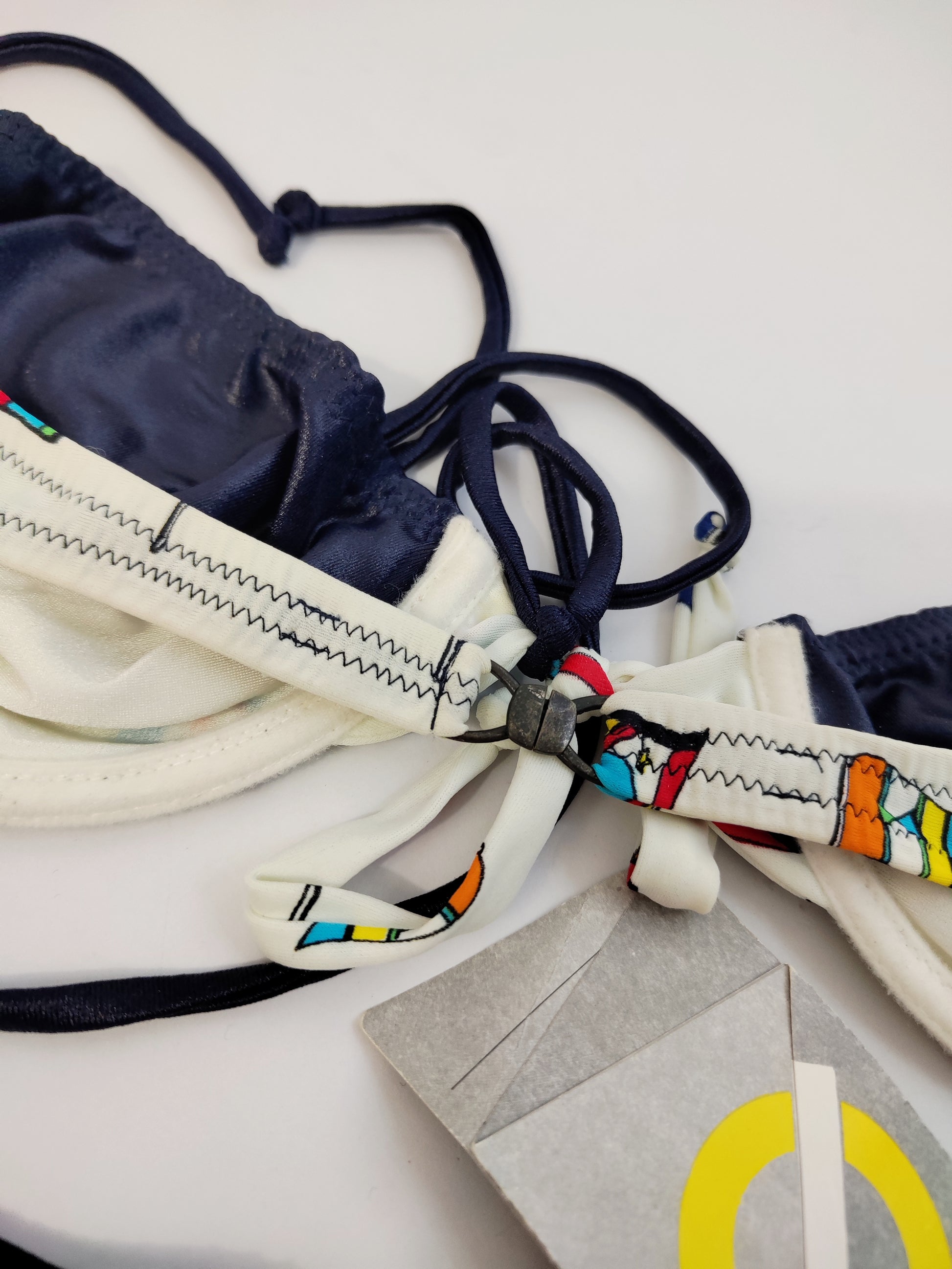 Bikini vintage Deadstock, nuovo con cartellino e protezione igienica. Off Limits, gruppo Parah. Fantasia con bandierine multicolor su fondo bianco, profili blu navy. Parte superiore a fascia con coppa con ferretto, non imbottita. Regolabile con nodino centrale tra le due coppe, laccetto blu sottile da legare al collo. Slip sgambato a vita alta.