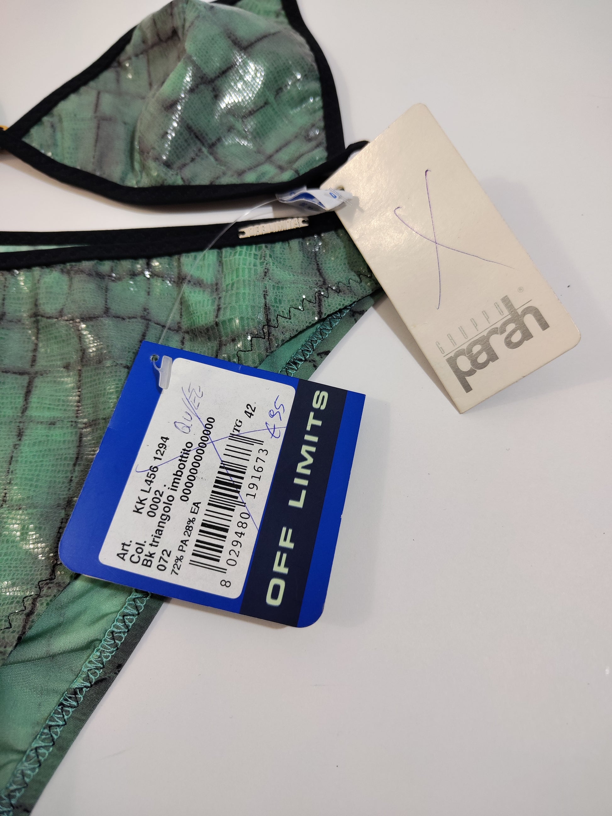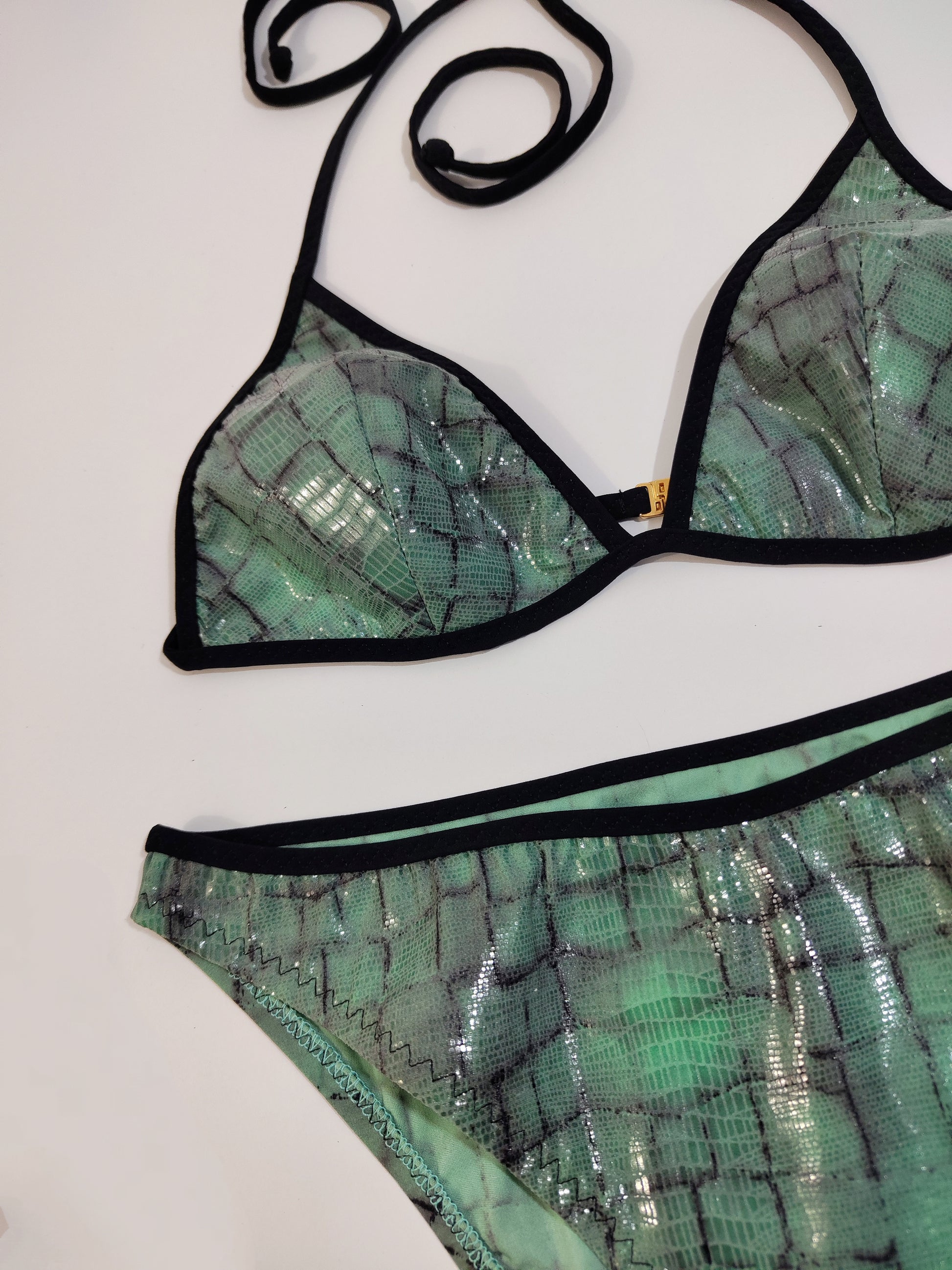 Bikini vintage Deadstock, nuovo con cartellino originale e protezione igienica. Brand Off Limits, gruppo Parah. Con stampa simil rettile sui toni del verde/azzurro e profili neri, la parte frontale è interamente laminata, creando dei bei giochi di luce. Modello a triangolo con chiusura sulla schiena e laccetto da annodare al collo, slip a vita media, non troppo sgambato.