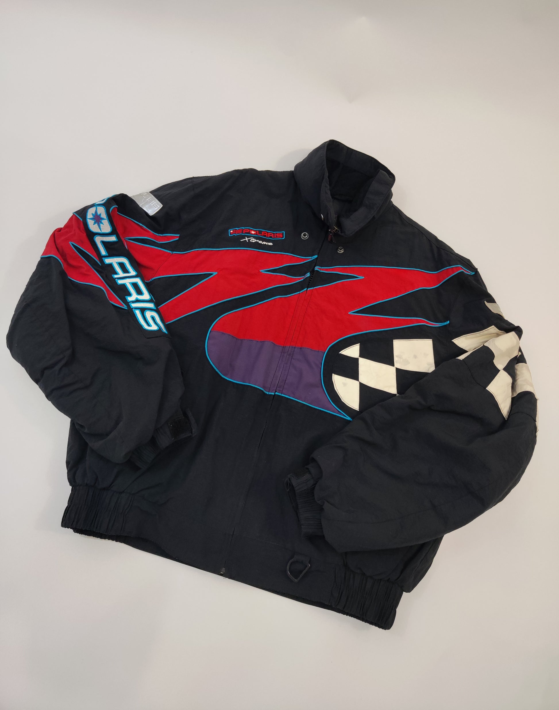 Giacca vintage anni '90, Polaris. Modello bomber oversize, colore nero con inserto a quadri, dettagli colorati e ricami.Foderata e imbottita, nasce come giacca da motoslitta, adatta anche alle temperature più fredde.