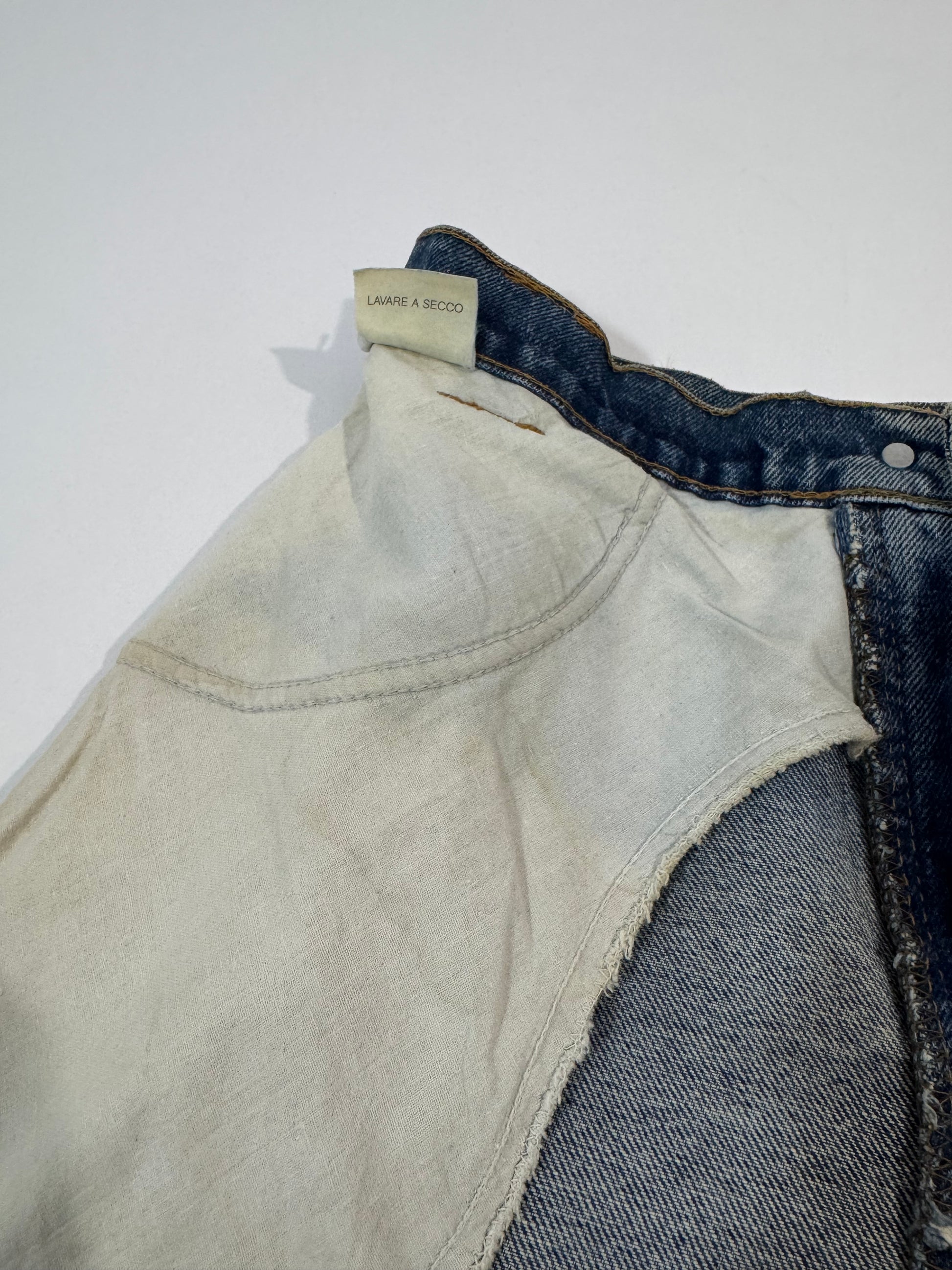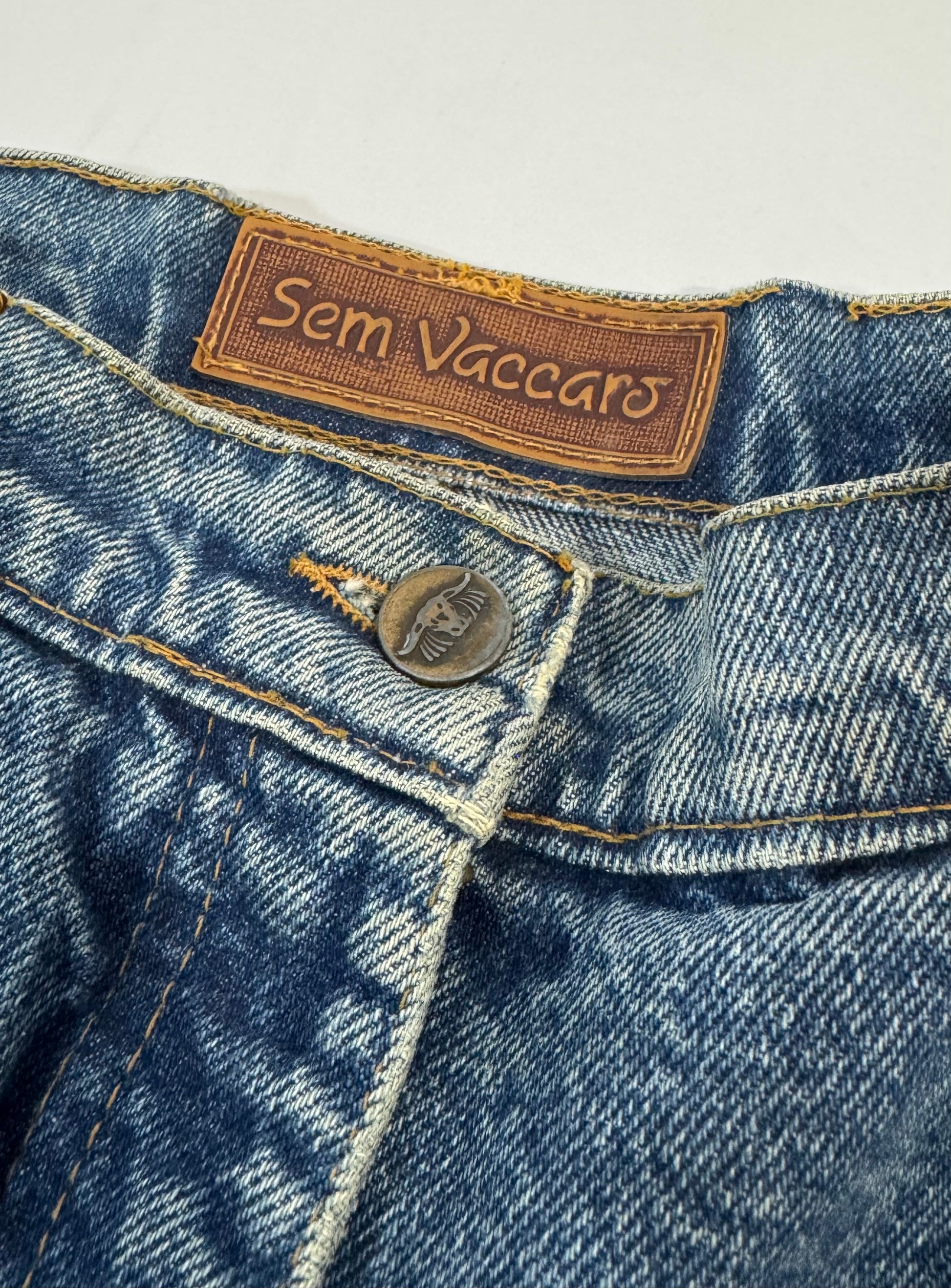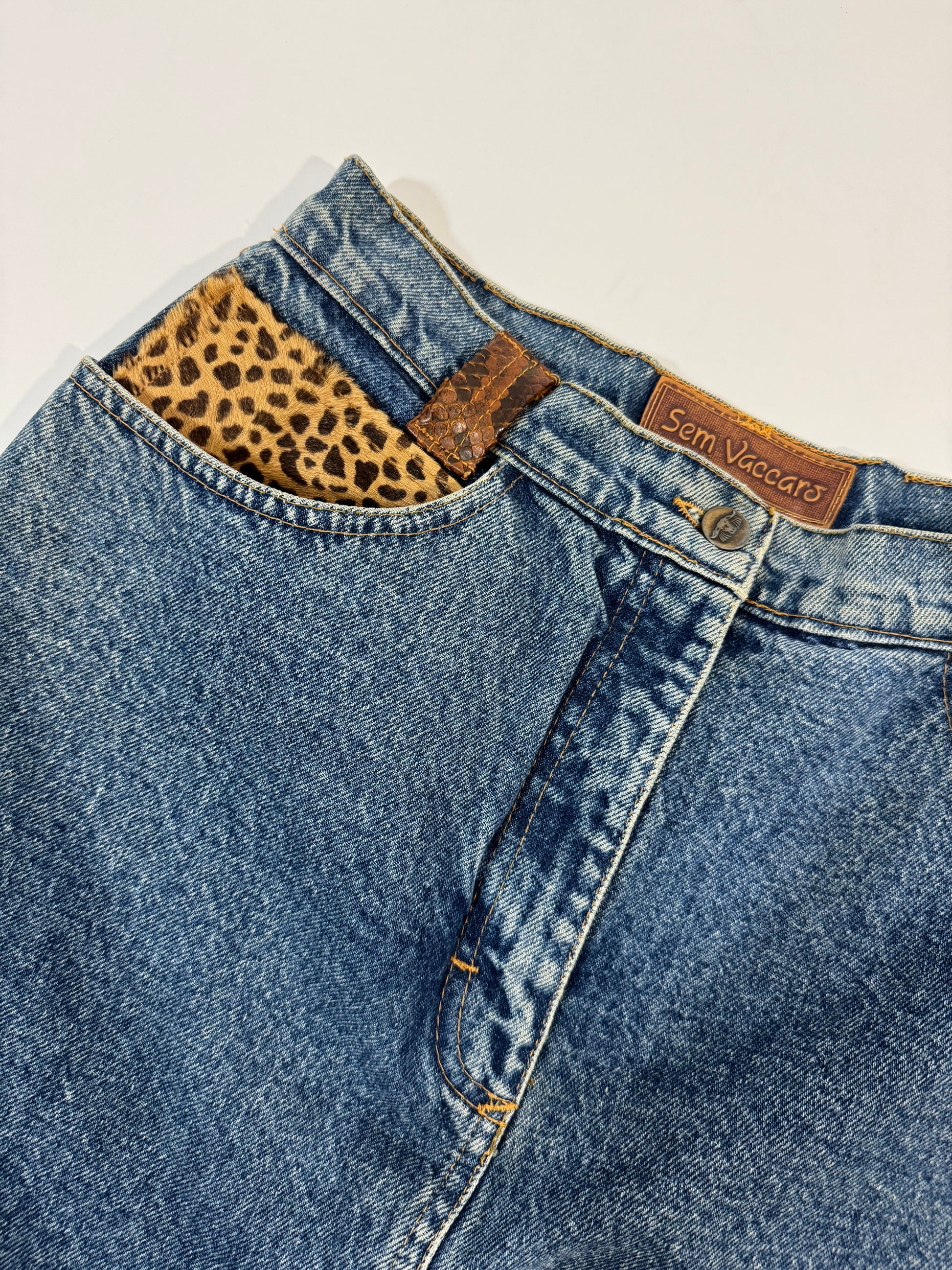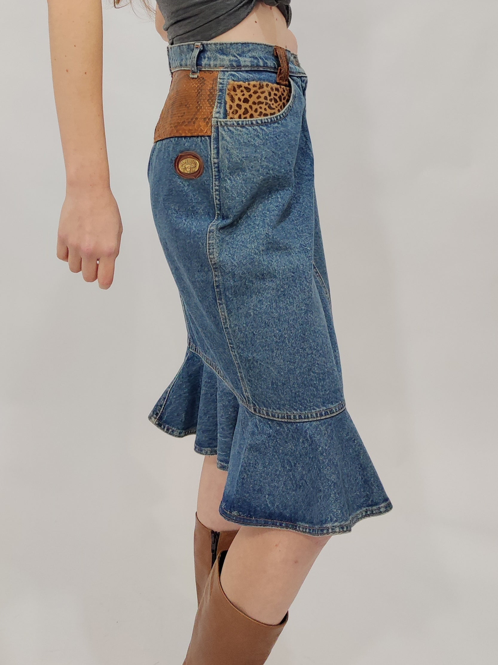 Gonna vintage anni '80, Sem Vaccaro. Modello a vita alta che segue la figura per poi allargarsi sul fondo con una balza. In denim a lavaggio medio, è arricchita da elementi a contrasto in vera pelle di rettile, come i passanti e la fascia nella parte alta del retro, sul davanti invece vi è una patch in cavallino maculato.