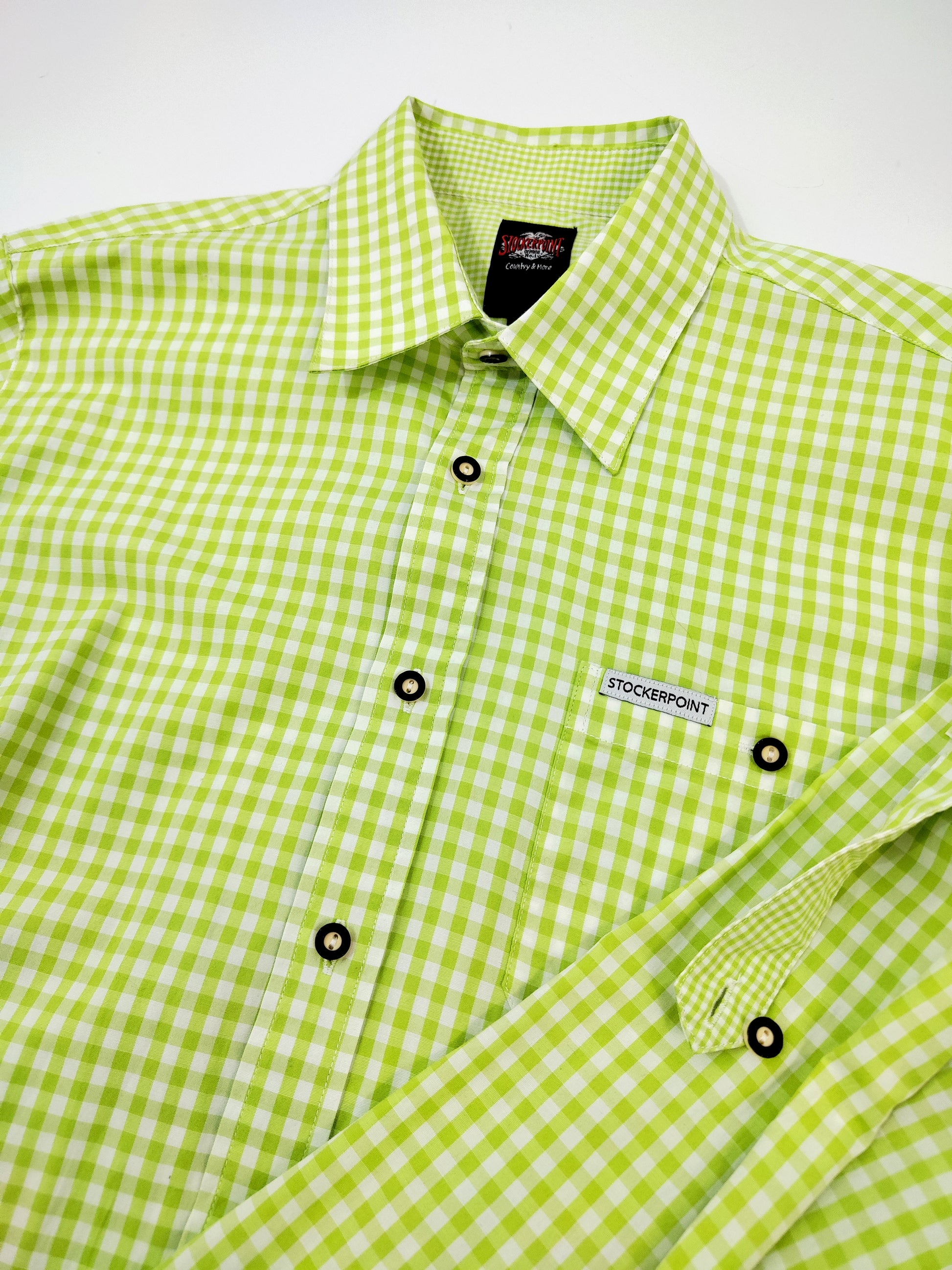 Camicia da uomo in misto cotone, fantasia gingham a quadretti bianchi e verdi.