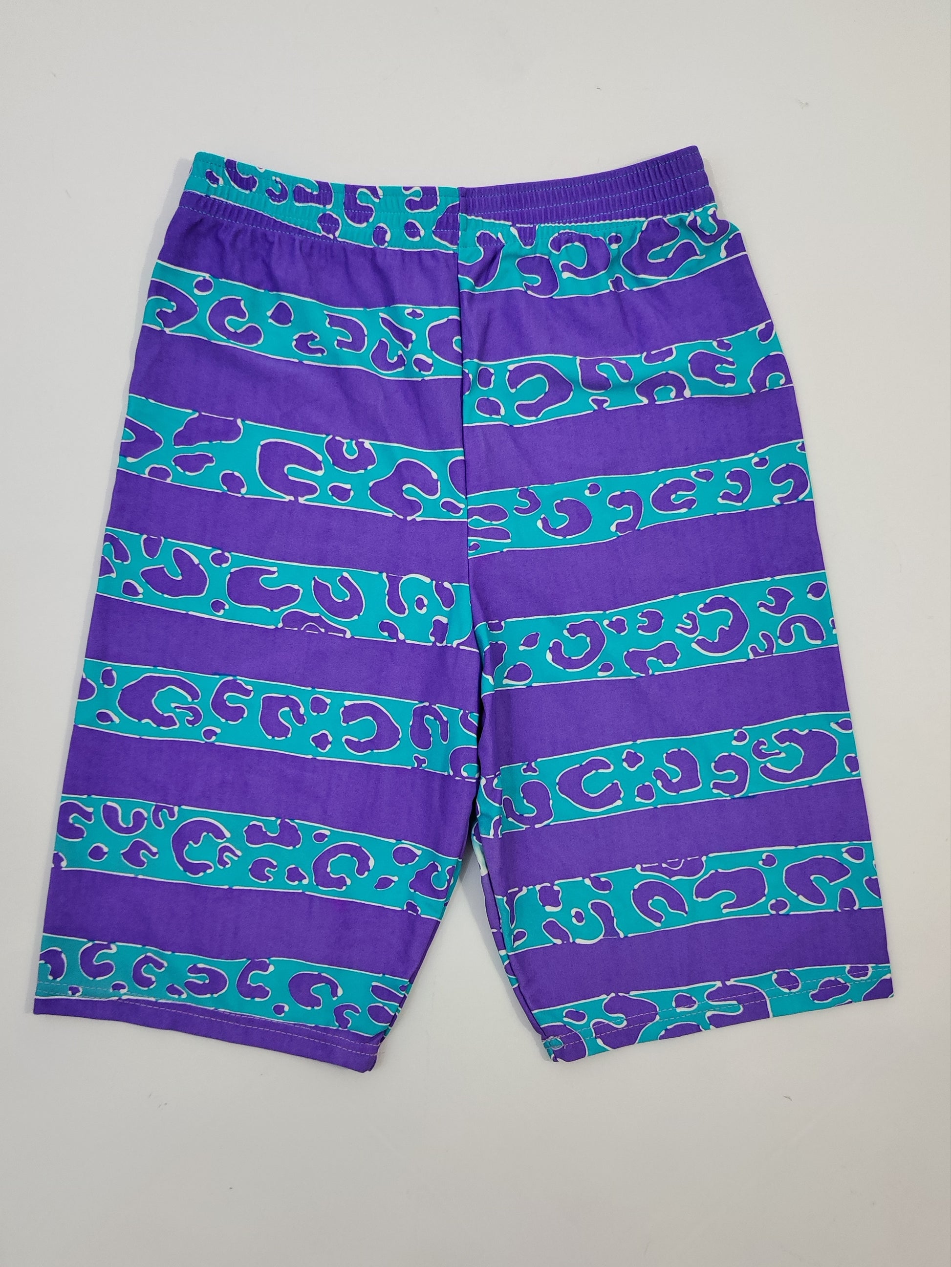 Pattern a righe sui toni del viola e verde acqua con macchie di leopardo. Vita alta, lunghezza al di sopra del ginocchio.