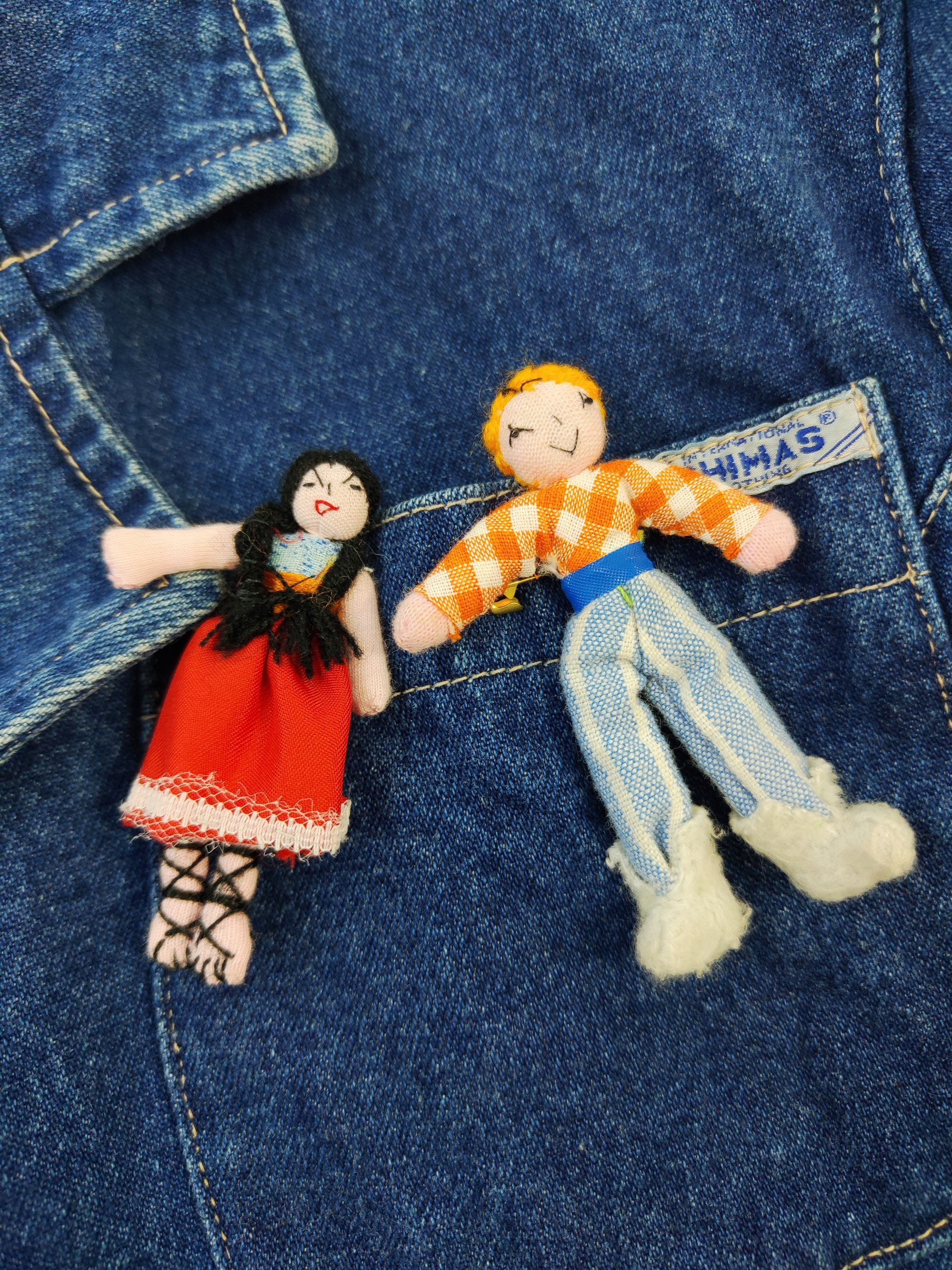 Blazer vintage anni '80 in denim a lavaggio medio. Modello monopetto con revers e taschina frontale sui cui sono applicate due spille raffiguranti bamboline peruviane. I bottoni sono in metallo color argento, decorati con testa di leone. Presenta spalline imbottite in gommapiuma, facilmente removibili se non di vostro gradimento.