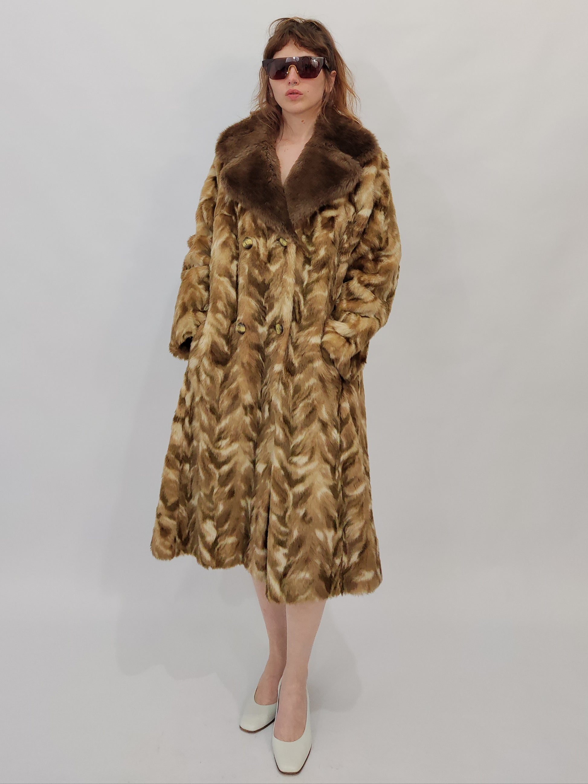 Cappotto in pelliccia sintetica sui toni del beige, marrone e panna. APF per C&A, made in France. Modello lungo con chiusura doppio petto e maxi revers.