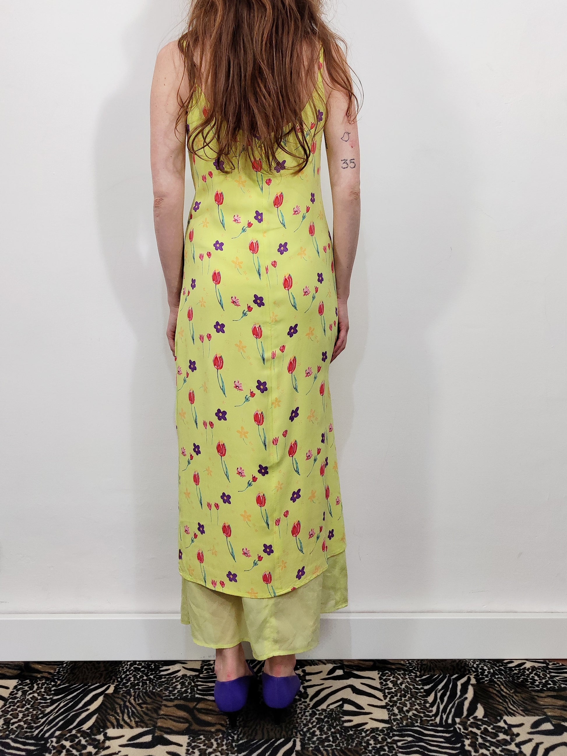Abito longuette scollato, fantasia floreale su fondo verde chiaro. Lunghezza alla caviglia, taglio dritto, fodera a vista.