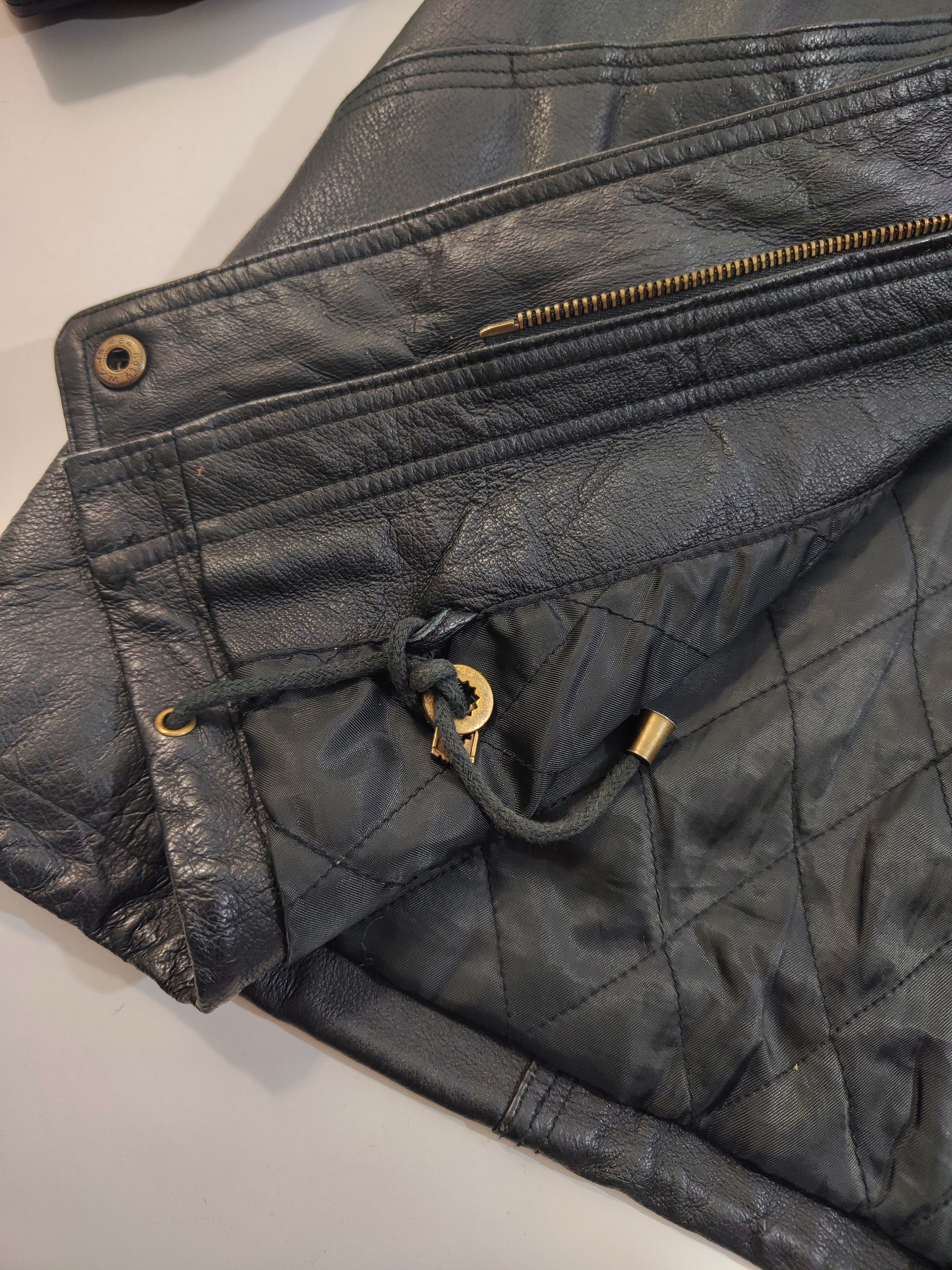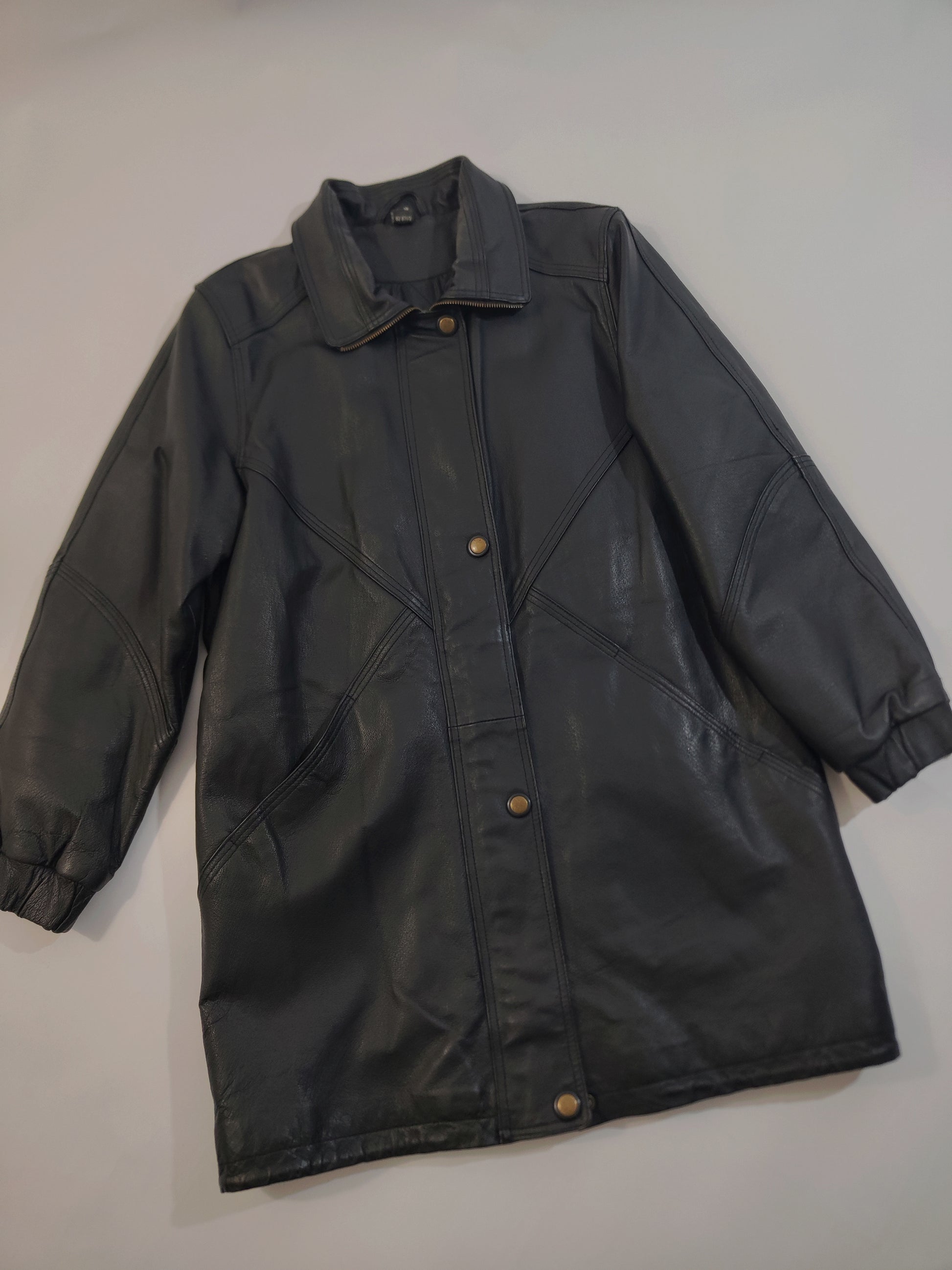 Giacca lunga vintage anni '80 in Vera Pelle, colore nero. Foderata e imbottita internamente e perciò adatta anche ai primi freddi. Chiusura frontale con zip e automatici, comode tasche frontali più una all'interno, polsini elasticizzati.