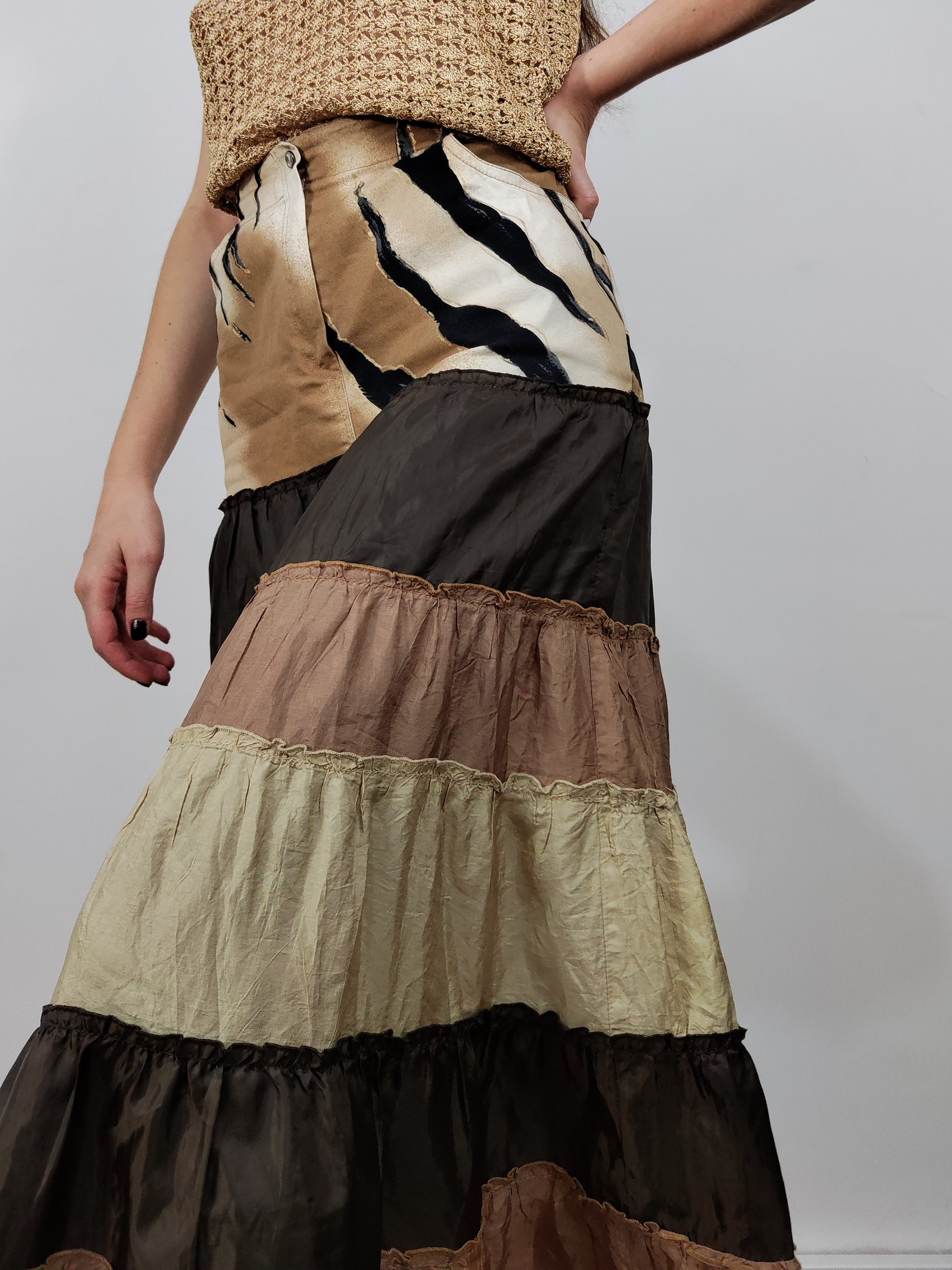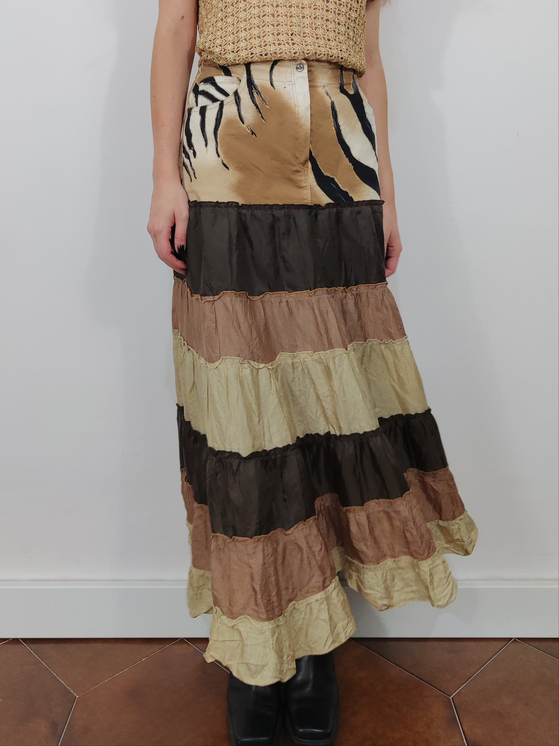 Gonna lunga a balze sui toni del marrone, beige e crema. Parte superiore in cotone a fantasia animalier. Vita alta, ampia sui fianchi. Chiusura con zip e automatico.
