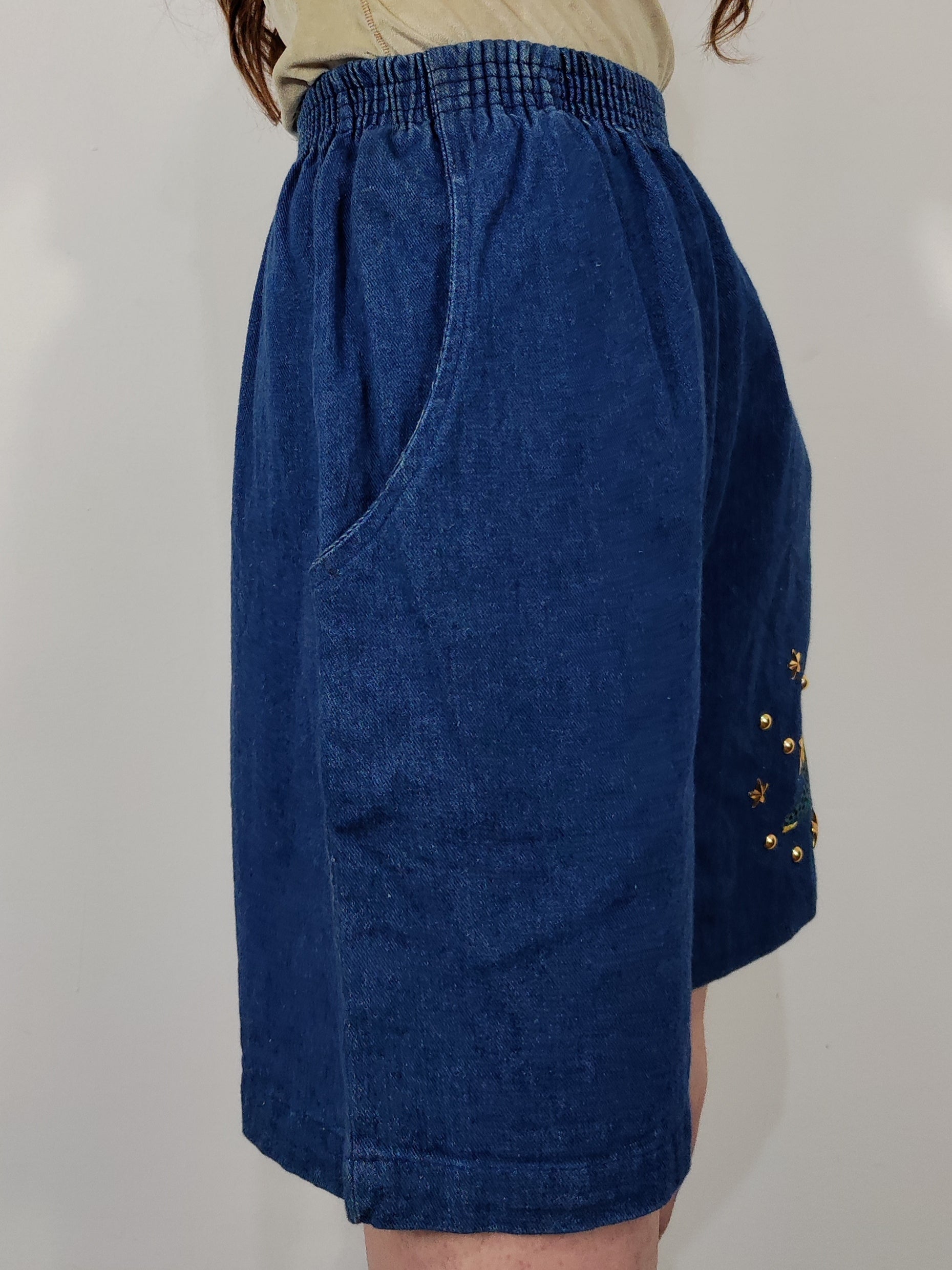 Pantaloncini in denim a lavaggio medio, modello scampanato a vita alta con elastico. Particolari le applicazioni alla base del capo, borchiette dorate e ricamo stile western.