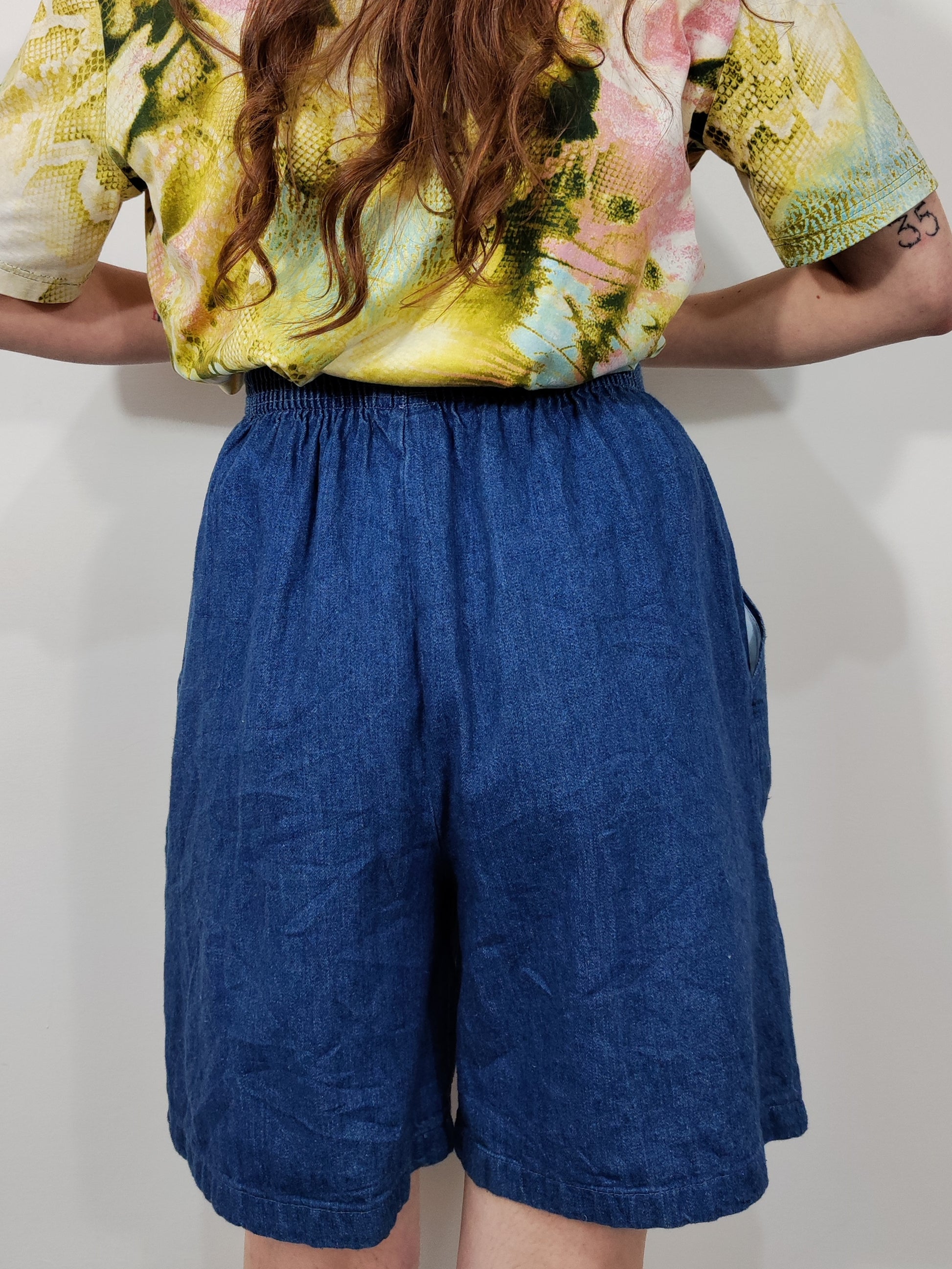 Pantaloncini in denim a lavaggio medio, modello scampanato a vita alta con elastico. Particolari le applicazioni alla base del capo, borchiette dorate e colorate di varie dimensioni.