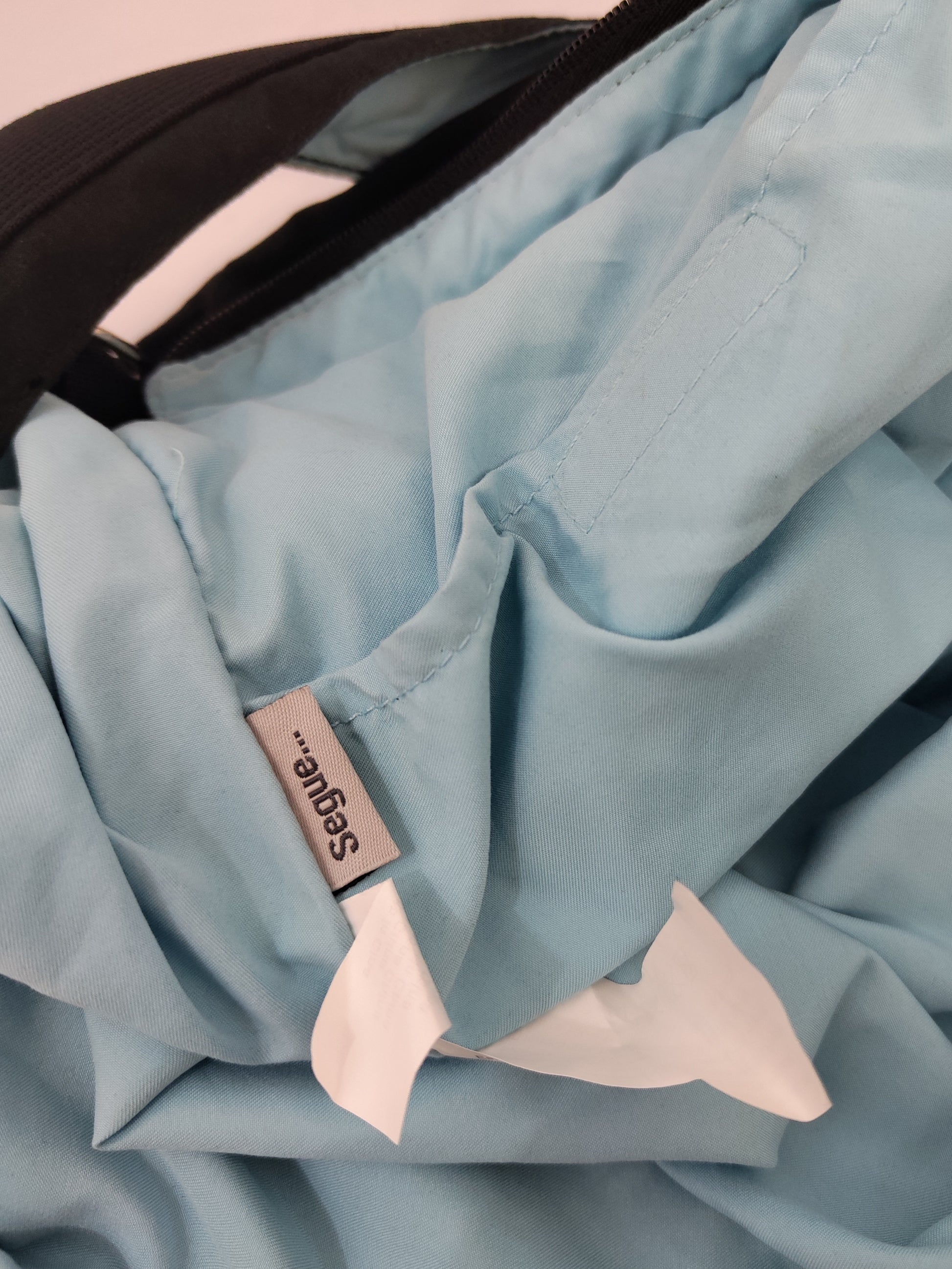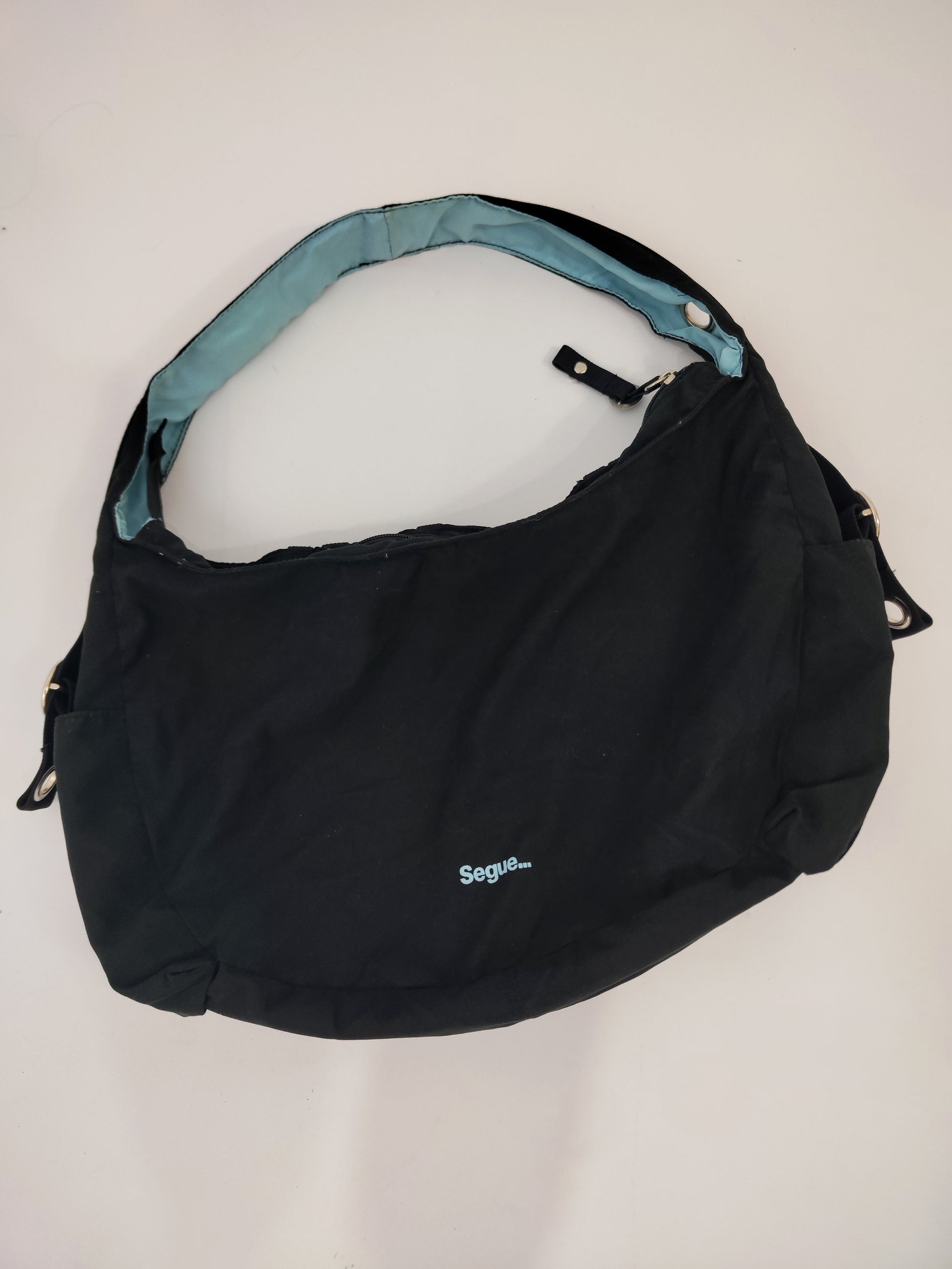 Comoda e pratica borsa 'Segue...', primi anni 2000. In tessuto nero, la forma è una mezzaluna dalla struttura morbida, la parte frontale è decorata da fettucce tono su tono con anelli metallici di colore argento. Fodera interna celeste chiaro a contrasto, con taschina, chiusura con zip. Media grandezza, adatta per l'uso quotidiano.