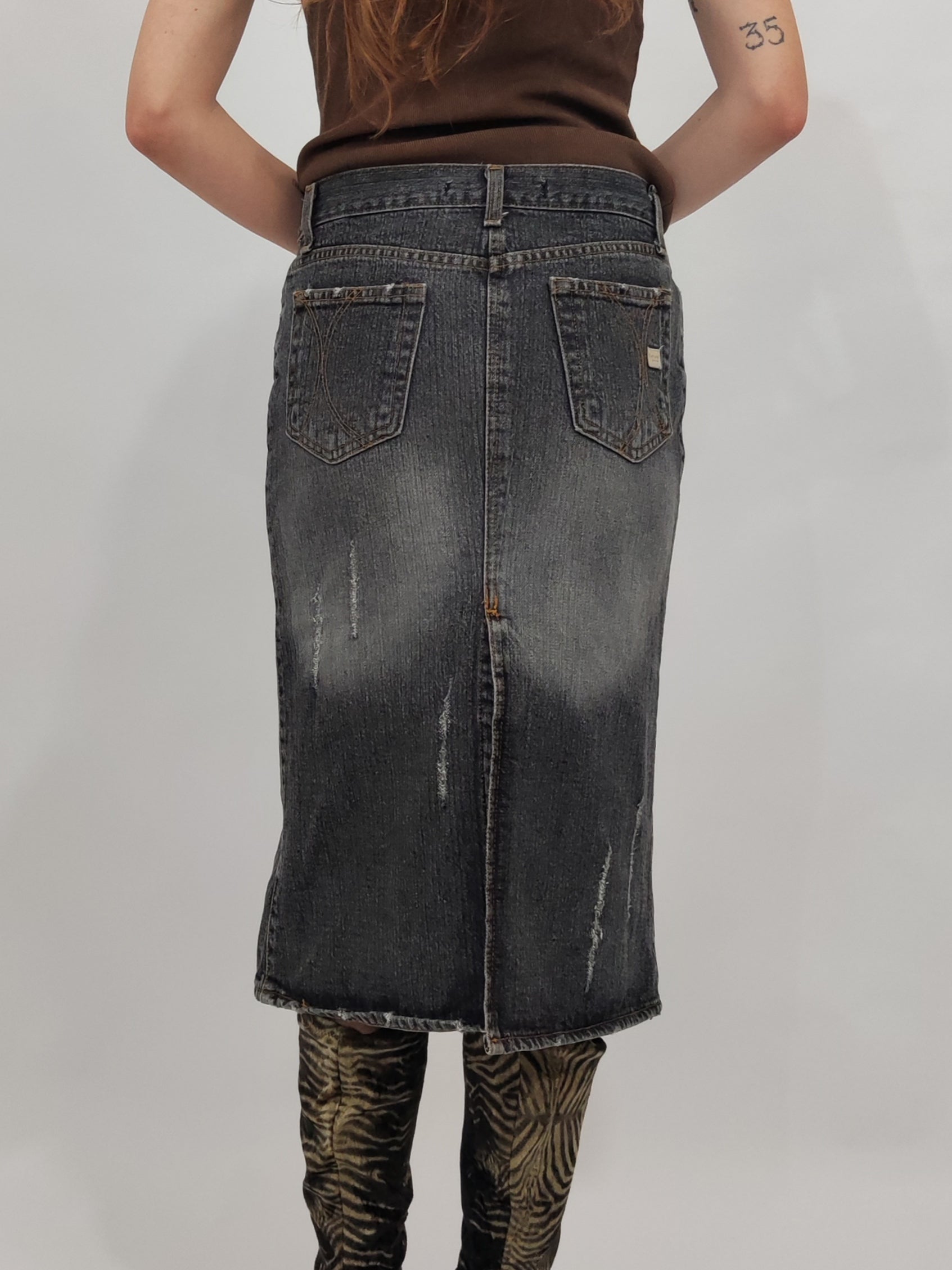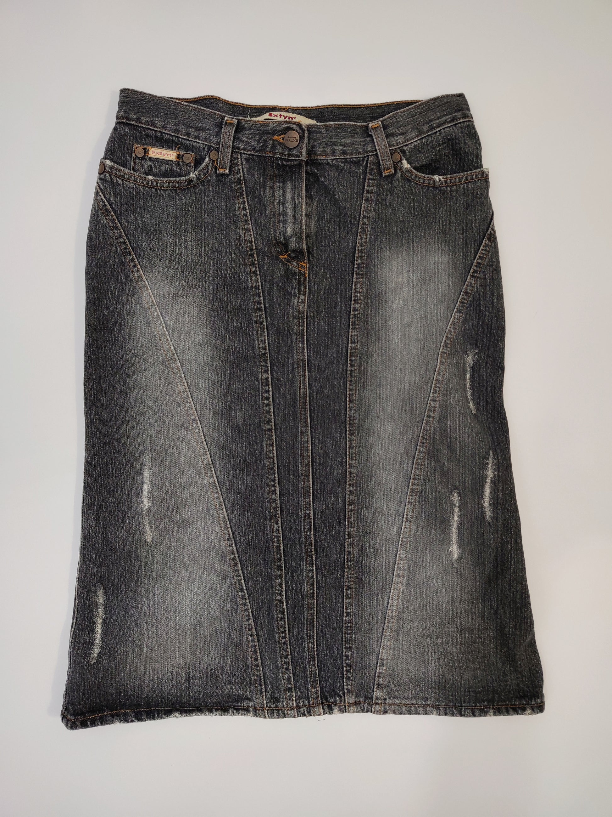 Gonna Extyn vintage anni 2000. Modello a matita con vita medio-bassa, in denim grigio delavè con dettagli distressed. Cinque tasche, le cuciture verticali slanciano la figura, ha anche un comodo spacco sul retro.