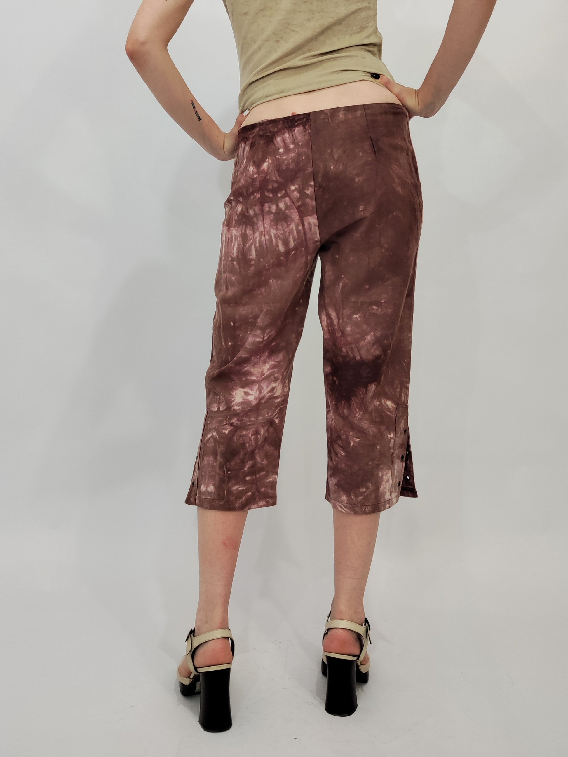 Pantaloni vintage anni 2000. Lunghezza 3/4, in fresco tessuto a fantasia tie-dye sui toni del beige e bordeaux tendente al rosa antico. Vita bassa, chiusura con laccetto incrociato. Spacchi laterali alla base della gamba con occhielli.