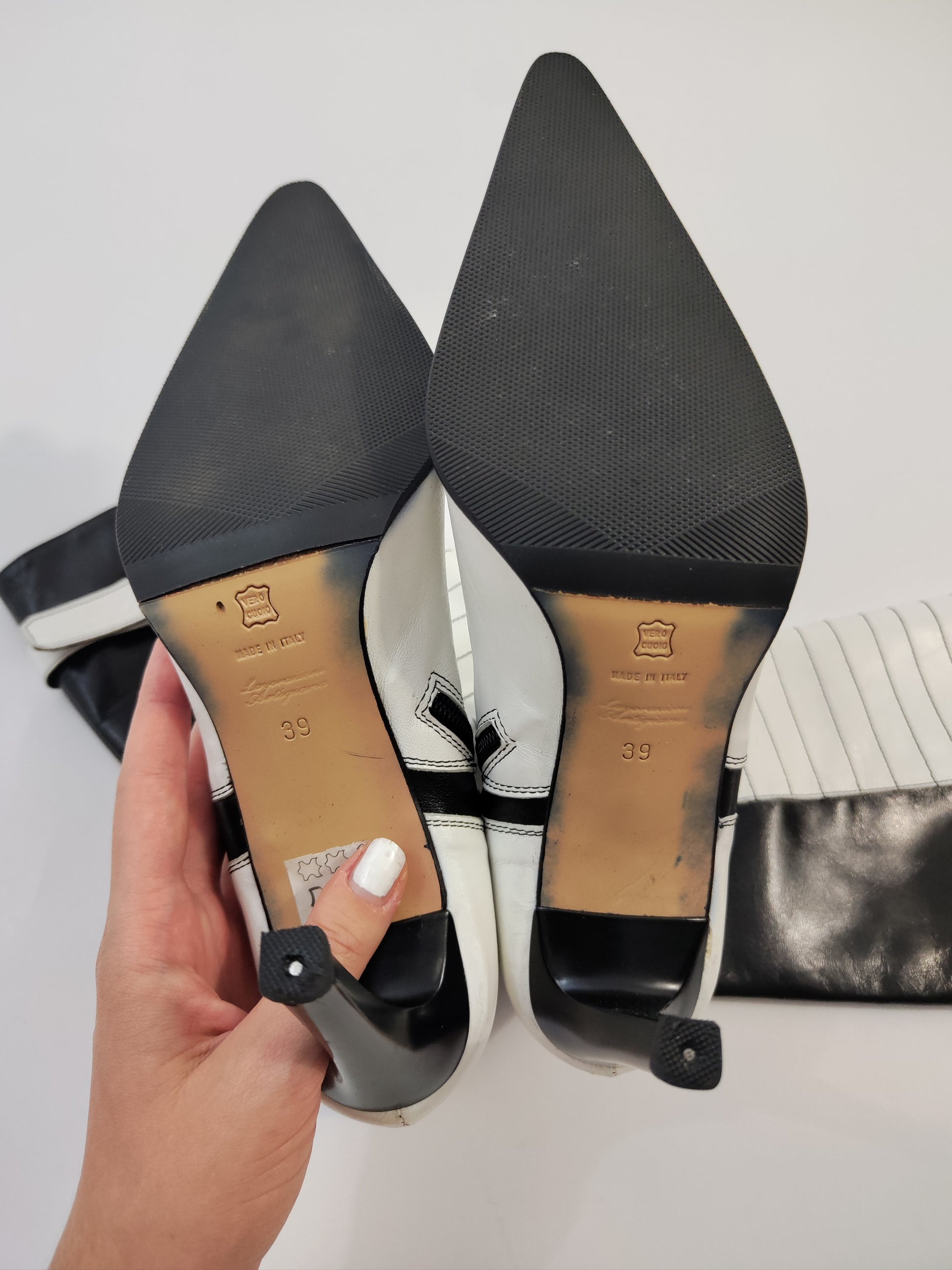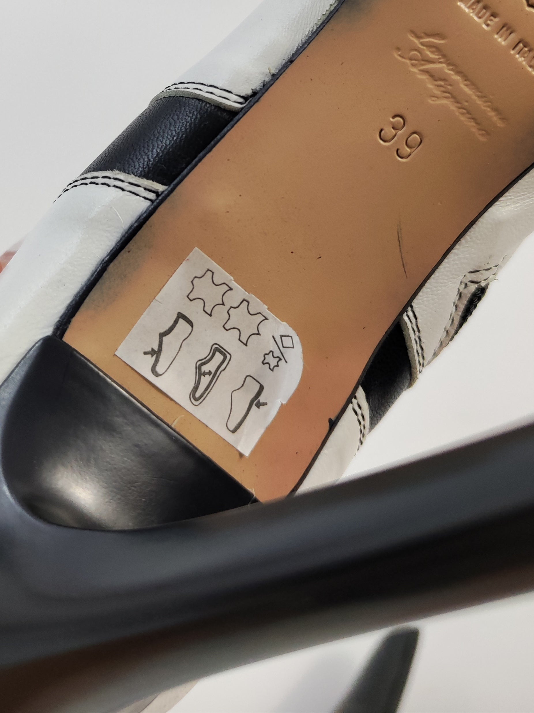 In vera pelle (tomaia, interno e suole) bianca e nera, con impunture a contrasto e fibbiette in metallo. Made in Italy!